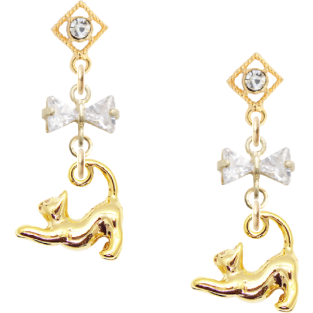 この魅力的なゴールドのピアスは、可愛らしいリボンと美しい猫チャームが特徴です。日常のファッションに遊び心を加え、特別なシーンでもそのユニークなスタイルがあなたの魅力を引き立てます。リボンの愛らしさと猫チャームのキュートさ、さらに輝くゴールドが見事に調和し、シンプルながらも印象的な存在感を演出する逸品です。個性的で愛らしいアクセサリーを求める方にはぜひおすすめしたい商品です!