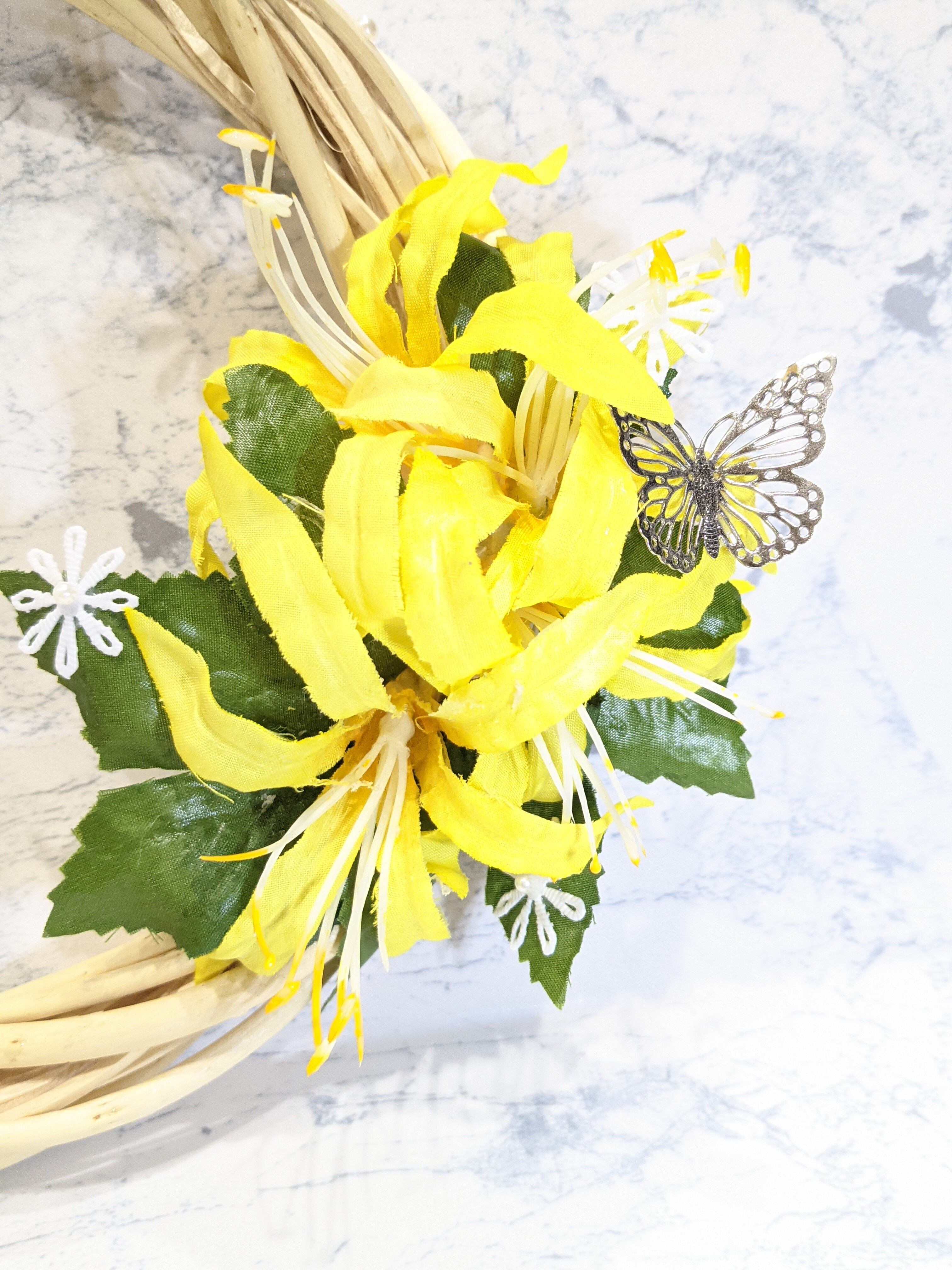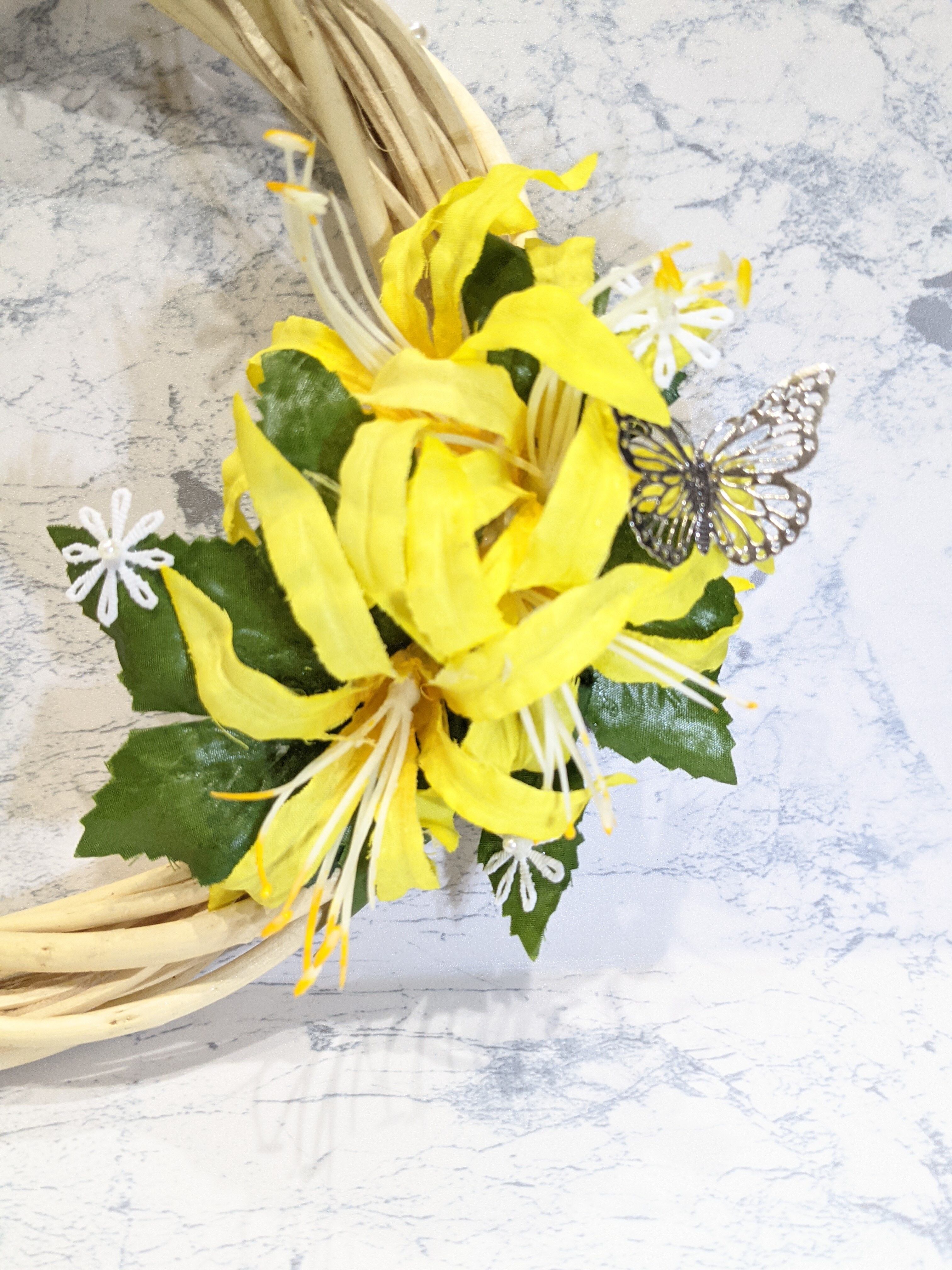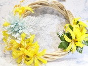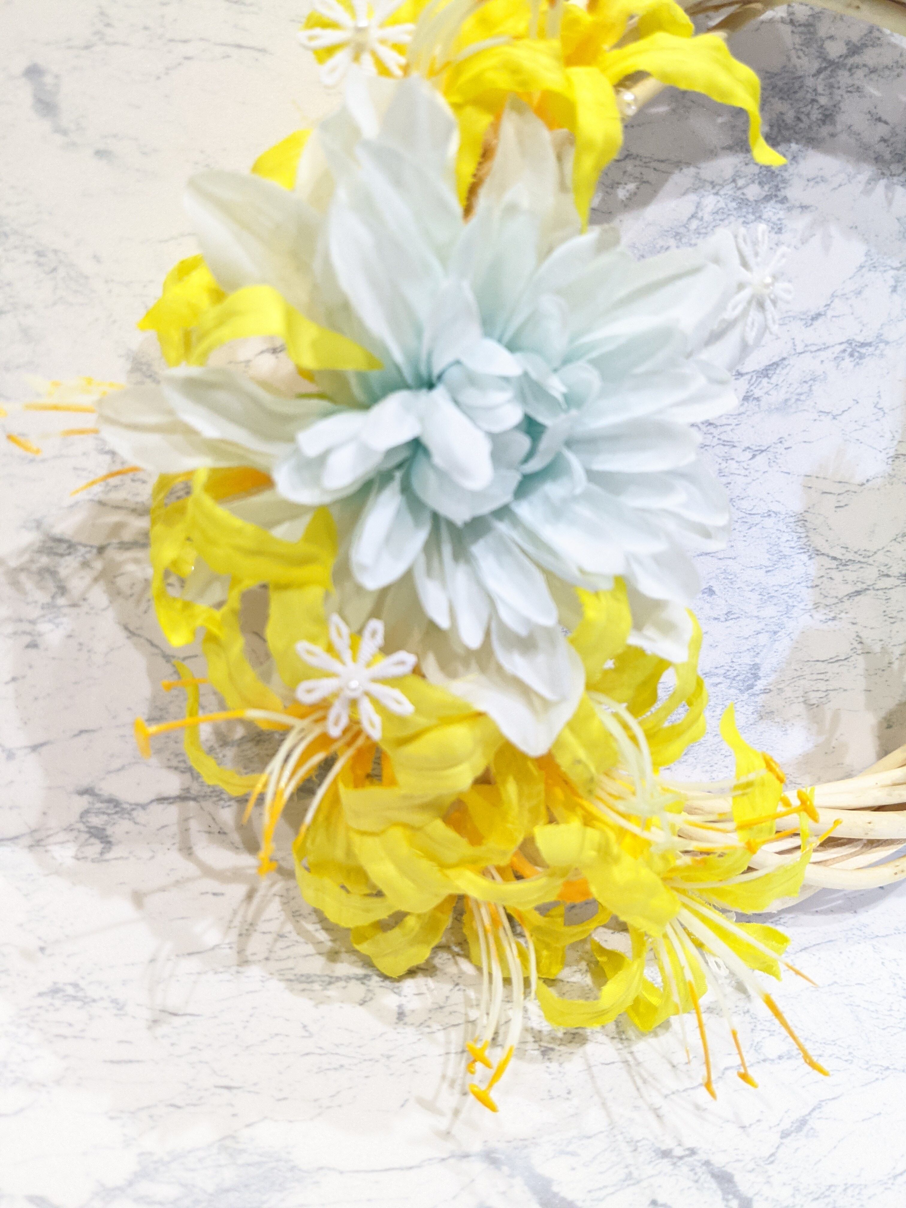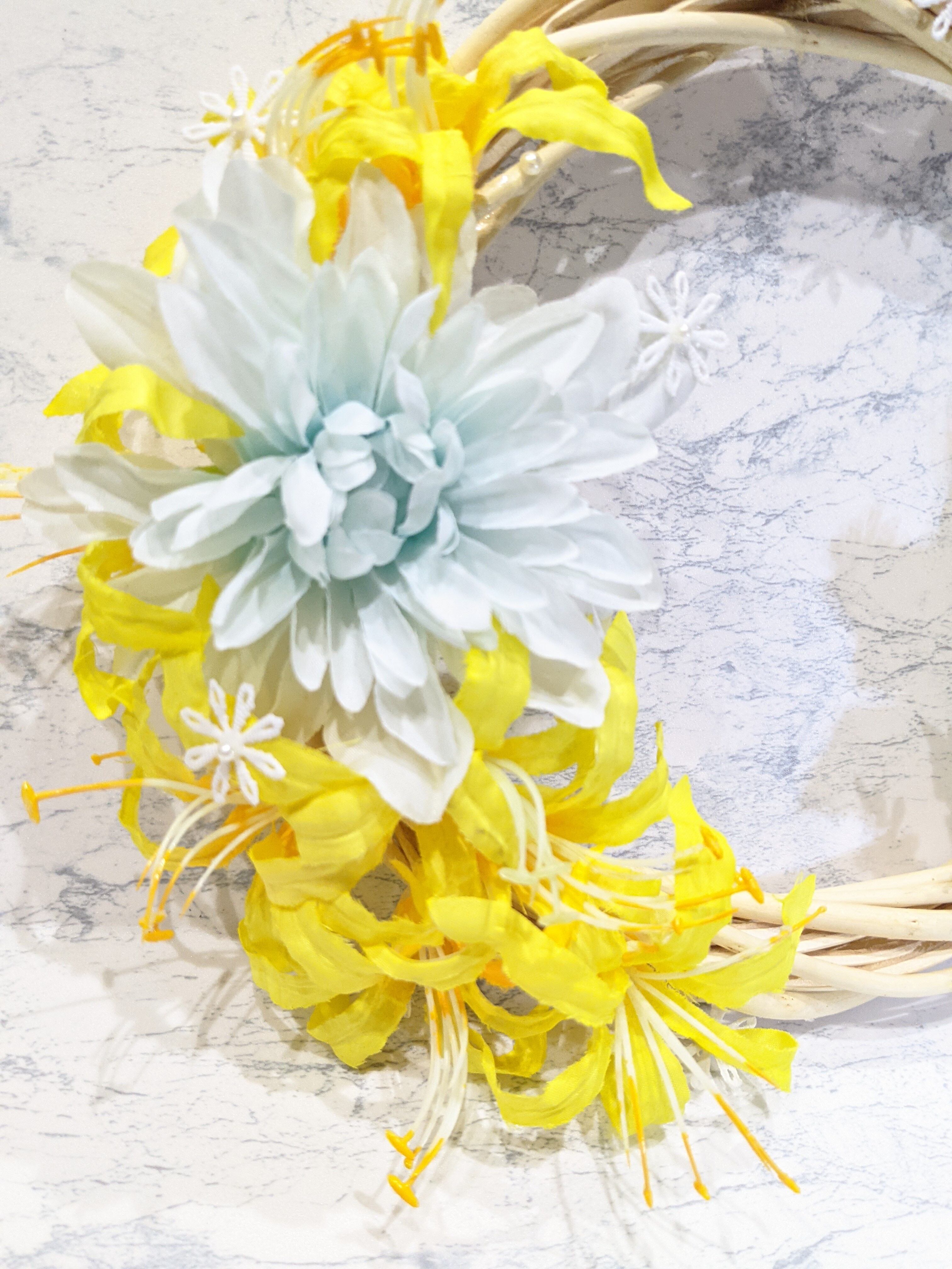 yellow×blew 造花をあしらってフラワーリースにしてみました!