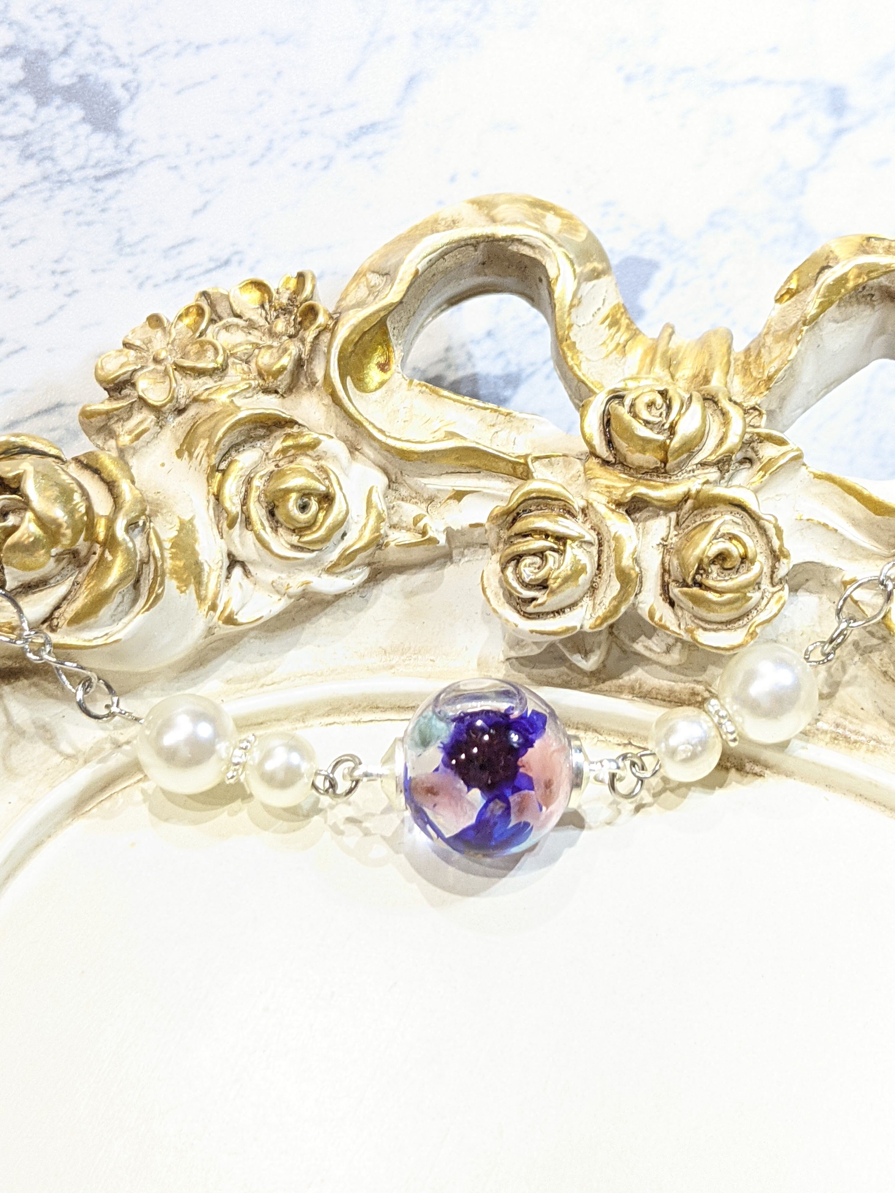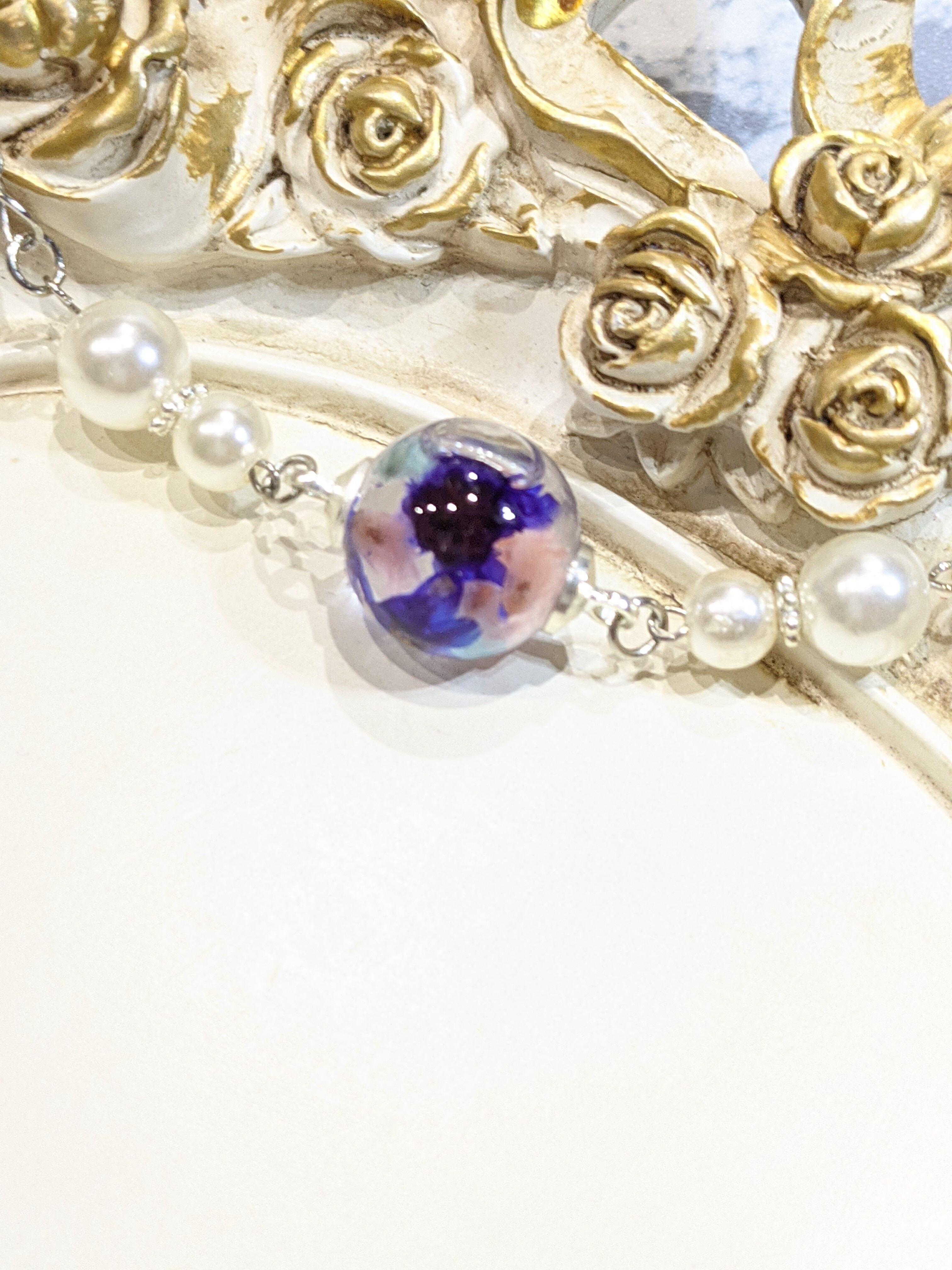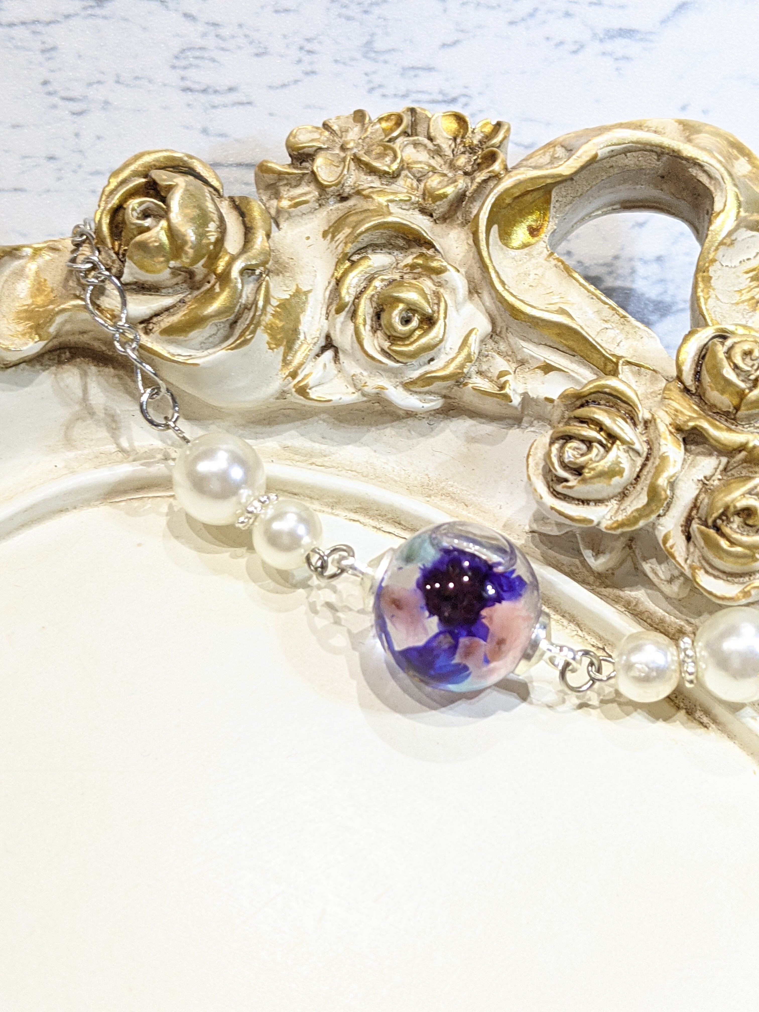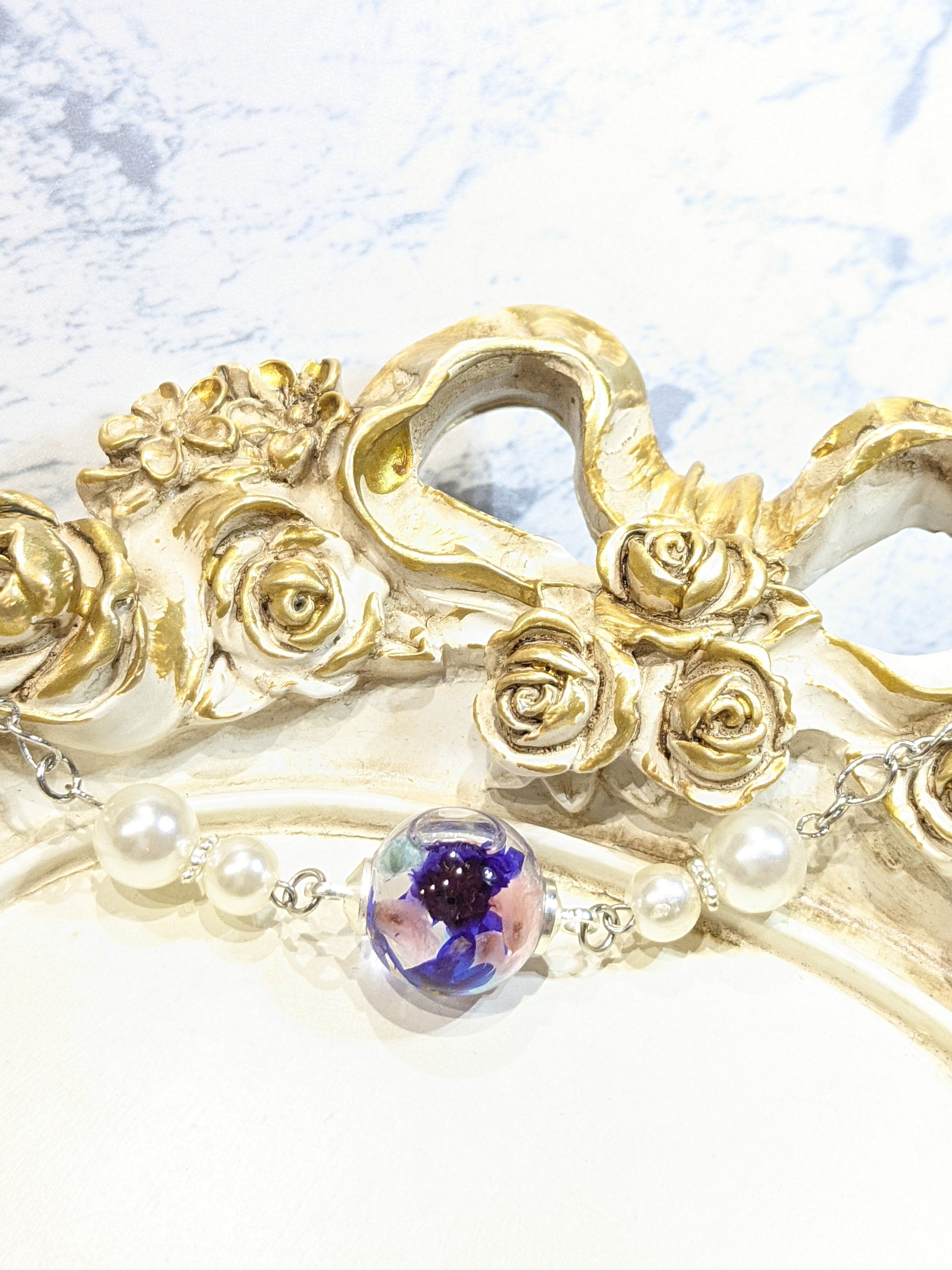 ハーバリウムのガラスドームにパープル ピンク ブルーのドライフラワーを詰め込みました