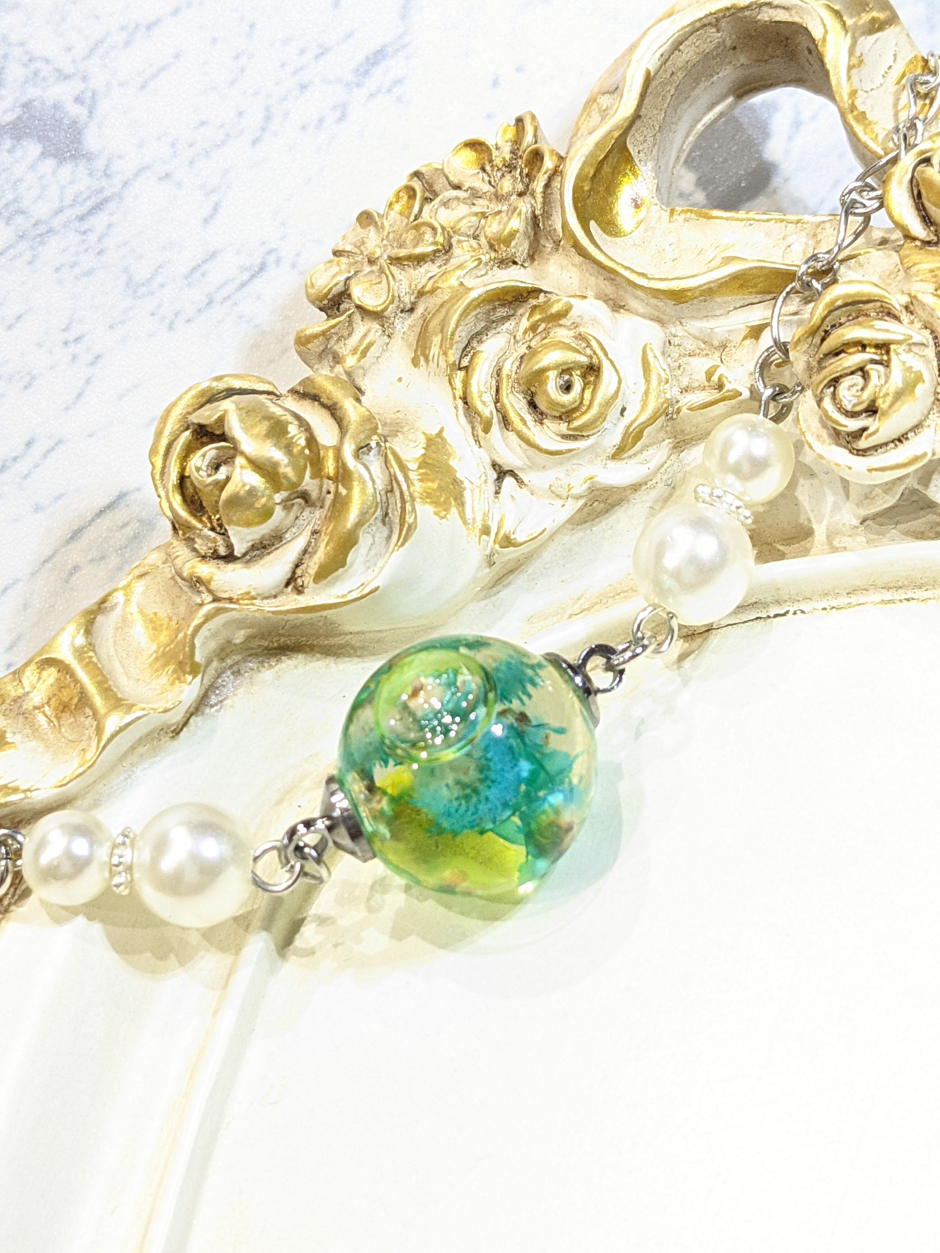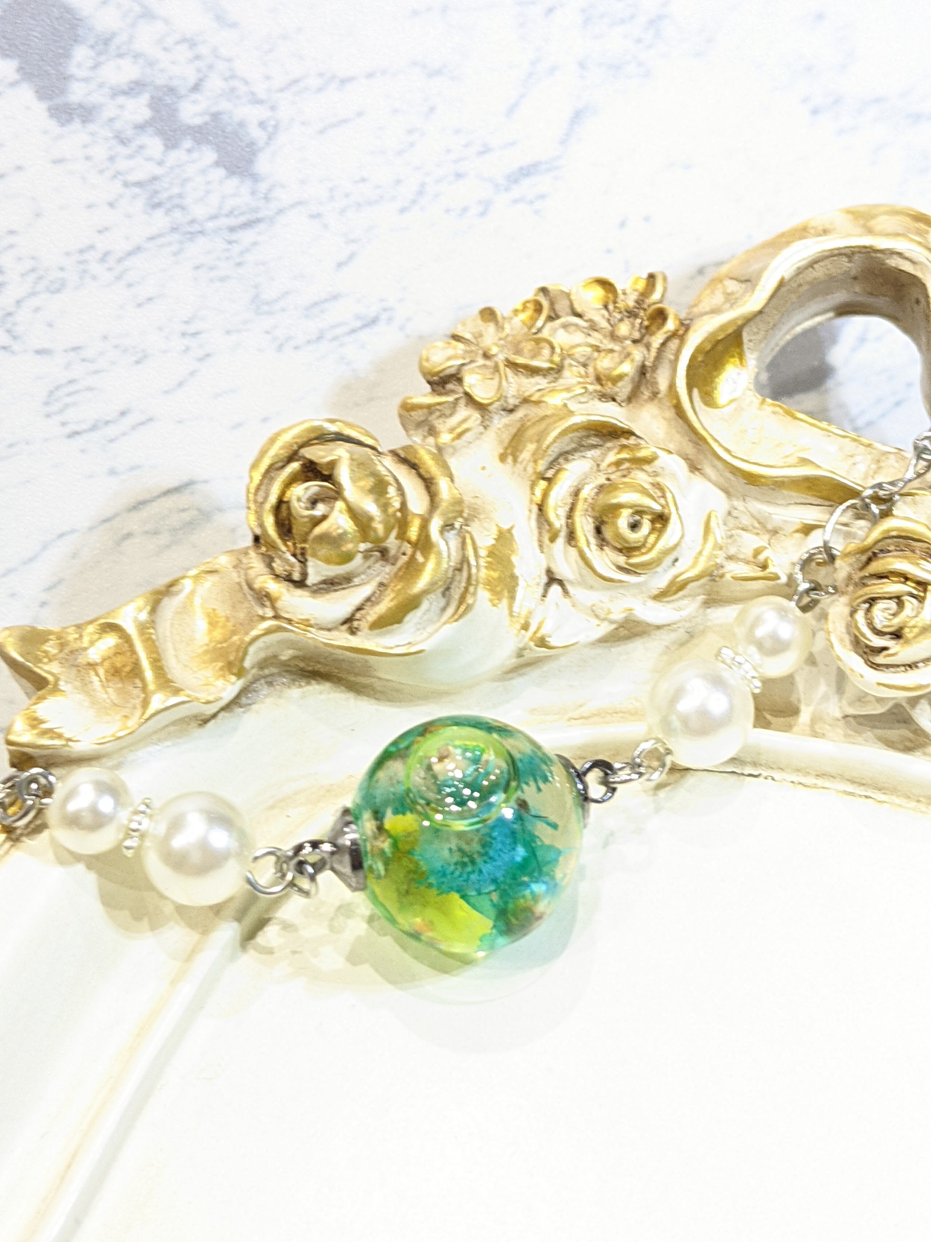 ハーバリウムのガラスドームにイエローとブルーのドライフラワーを詰め込みました。