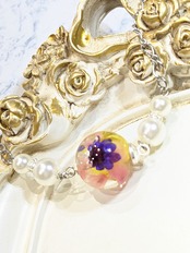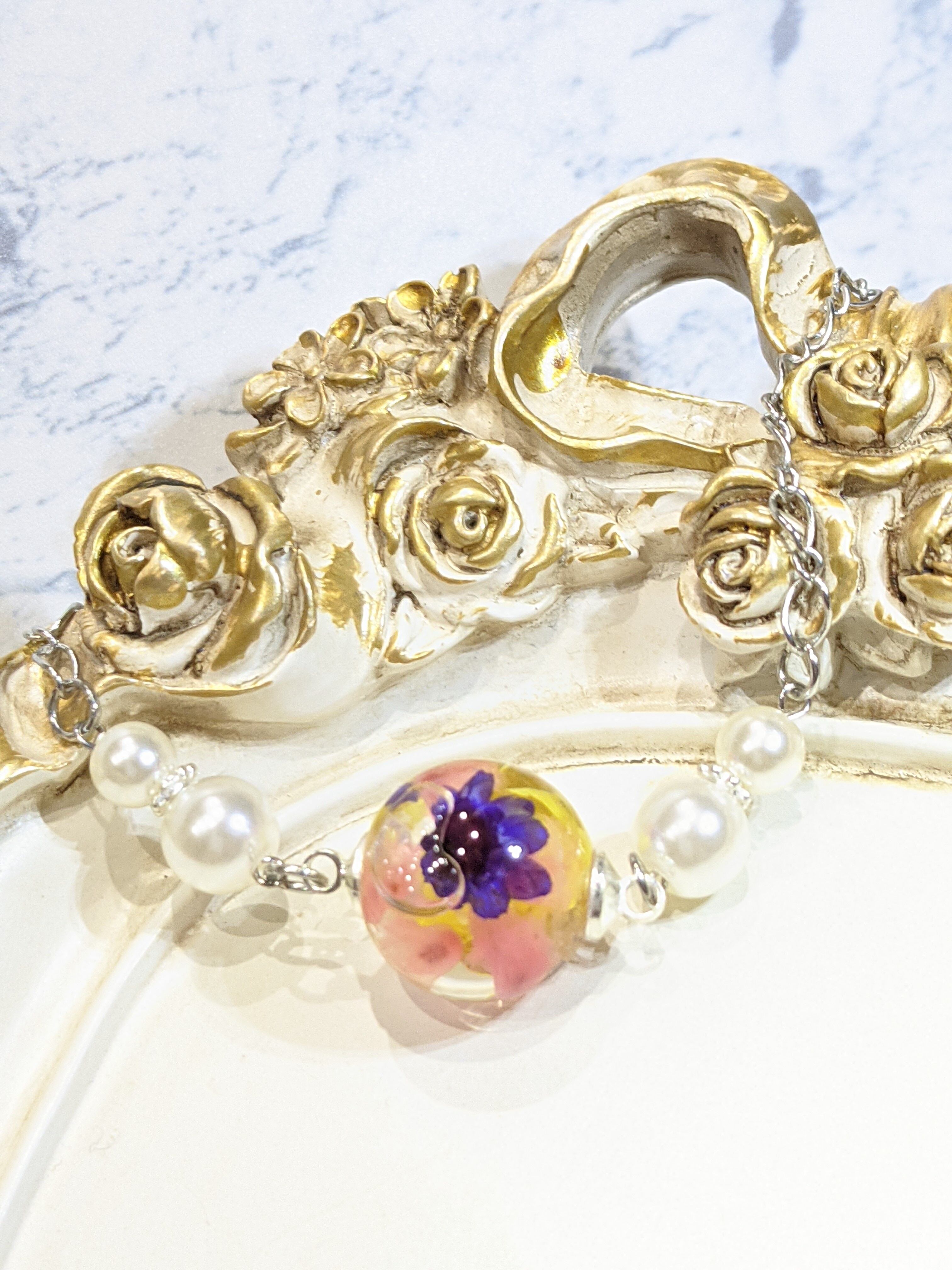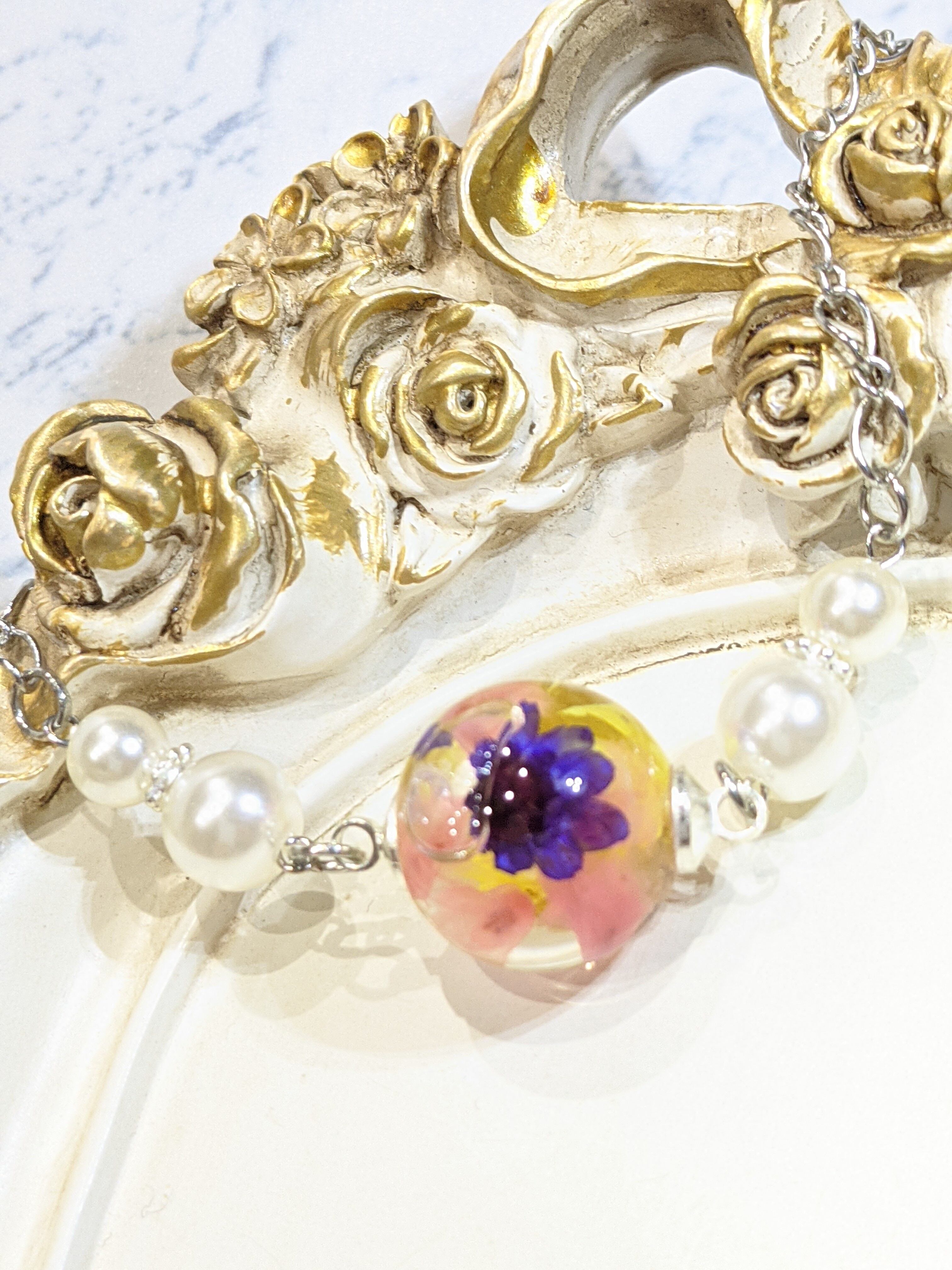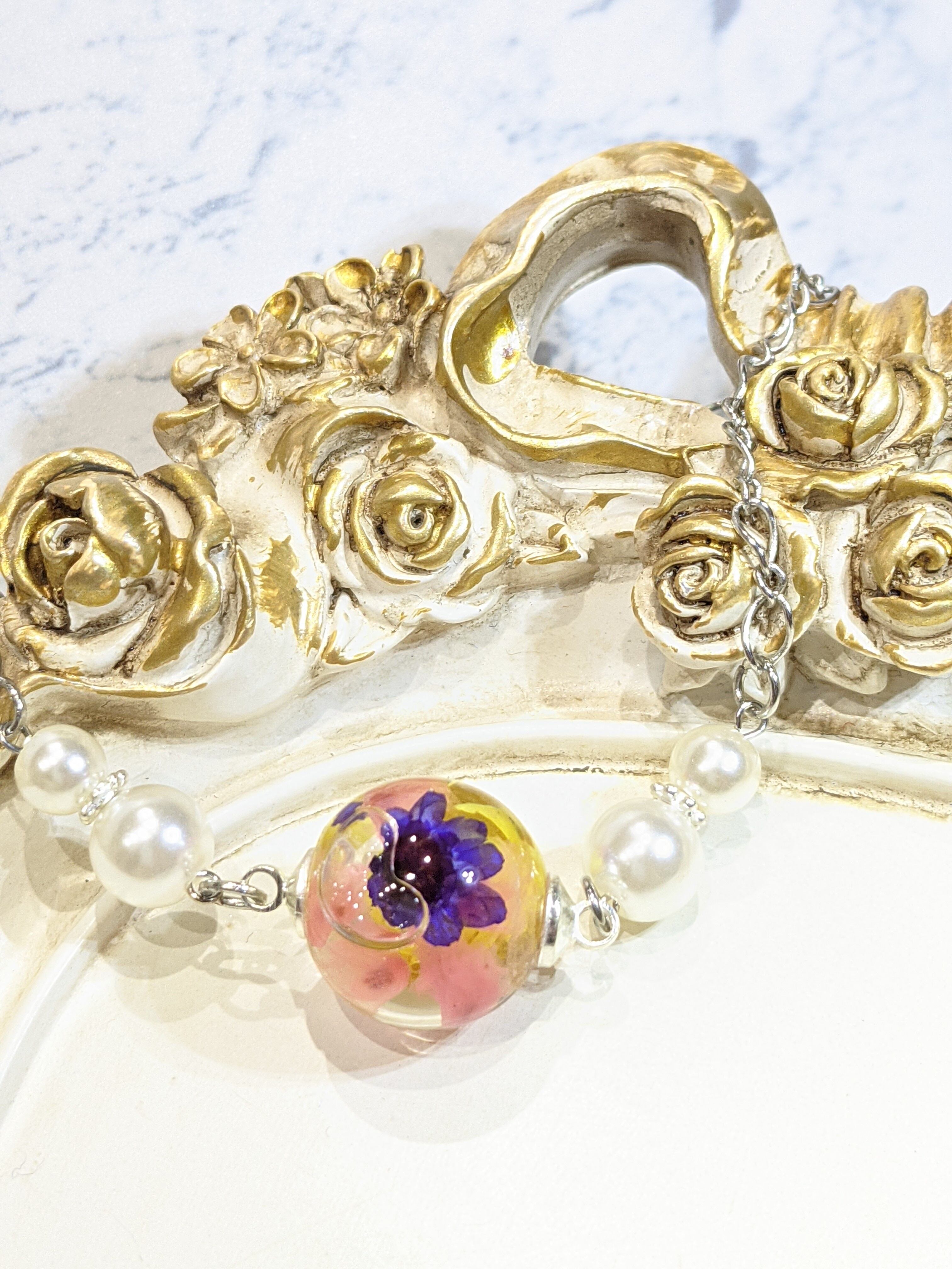 ハーバリウムのガラスドームに紫とピンクと黄色のドライフラワーを詰め込みました。