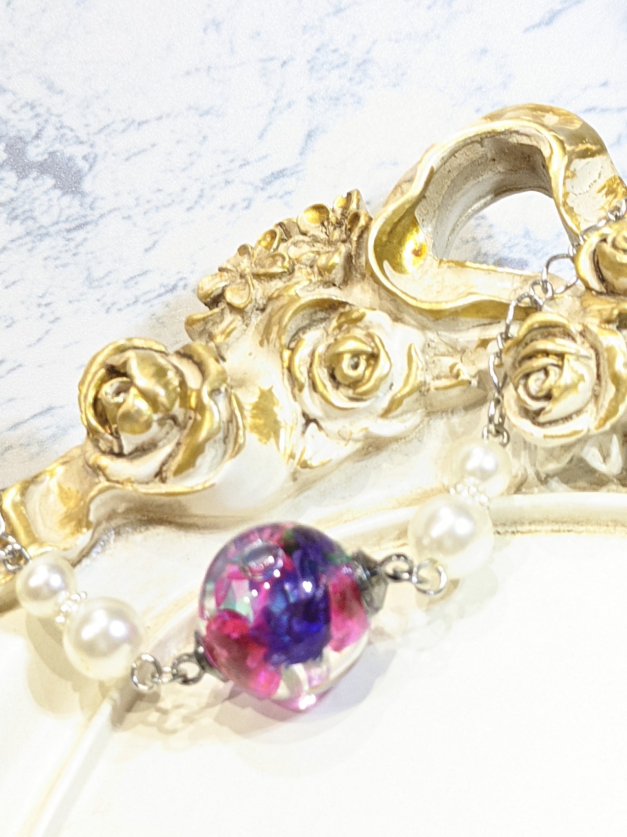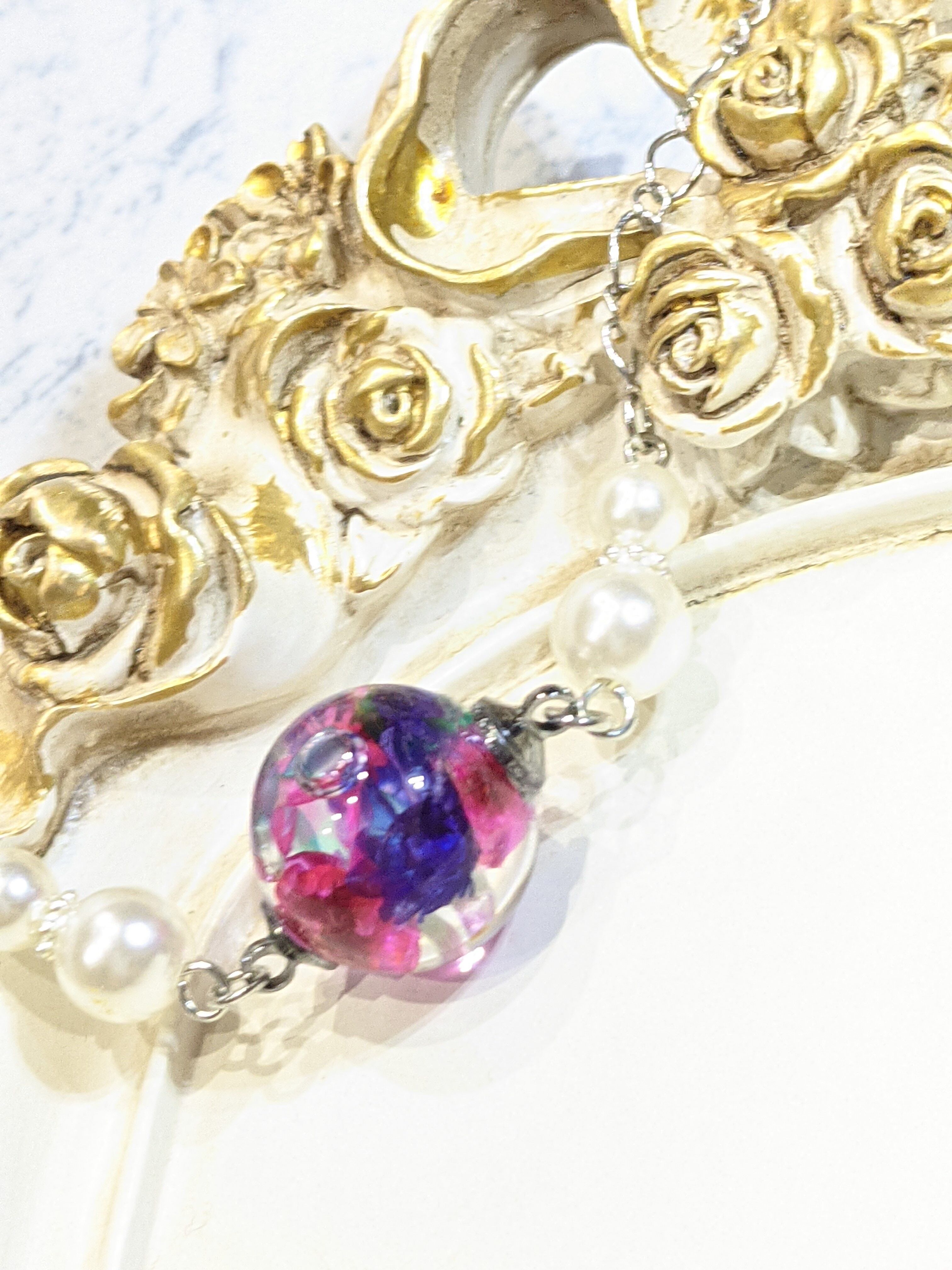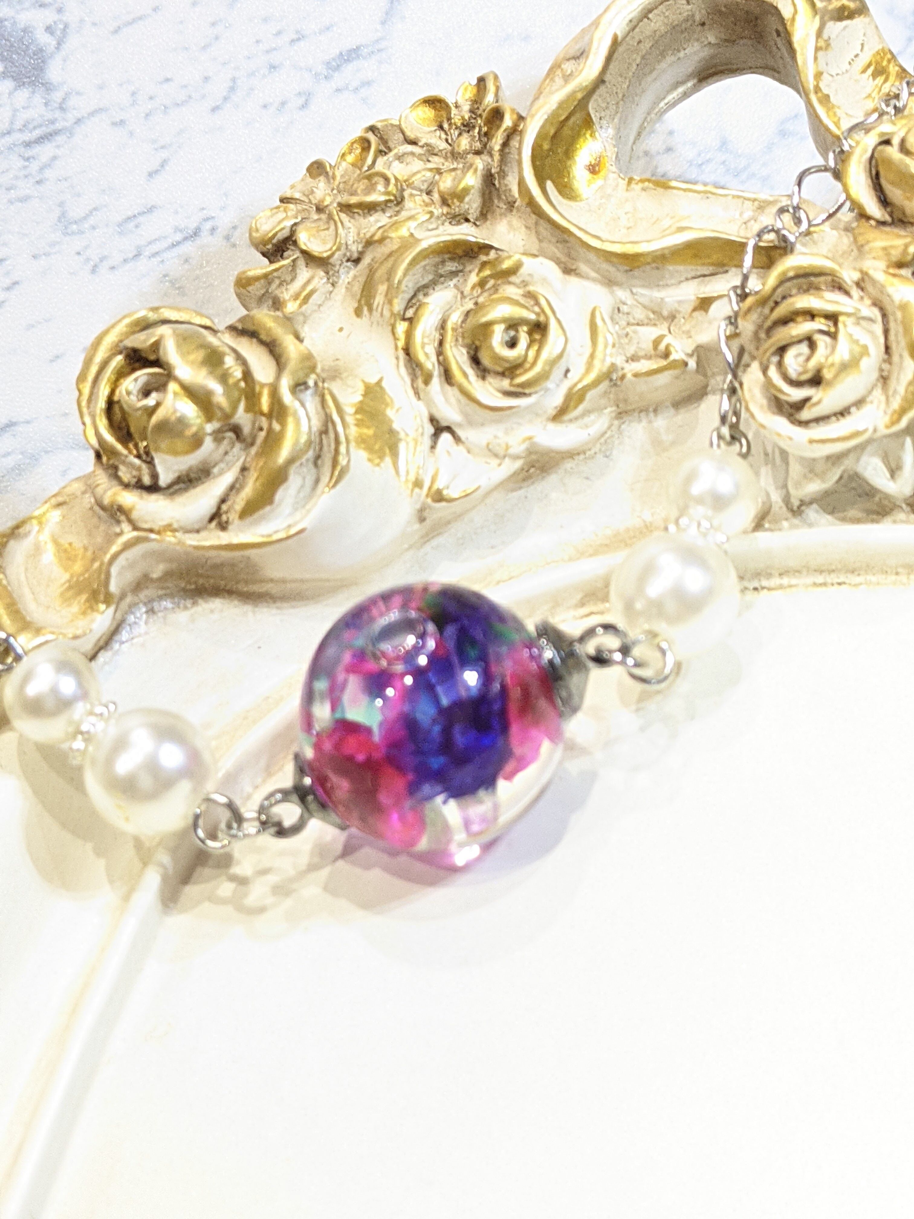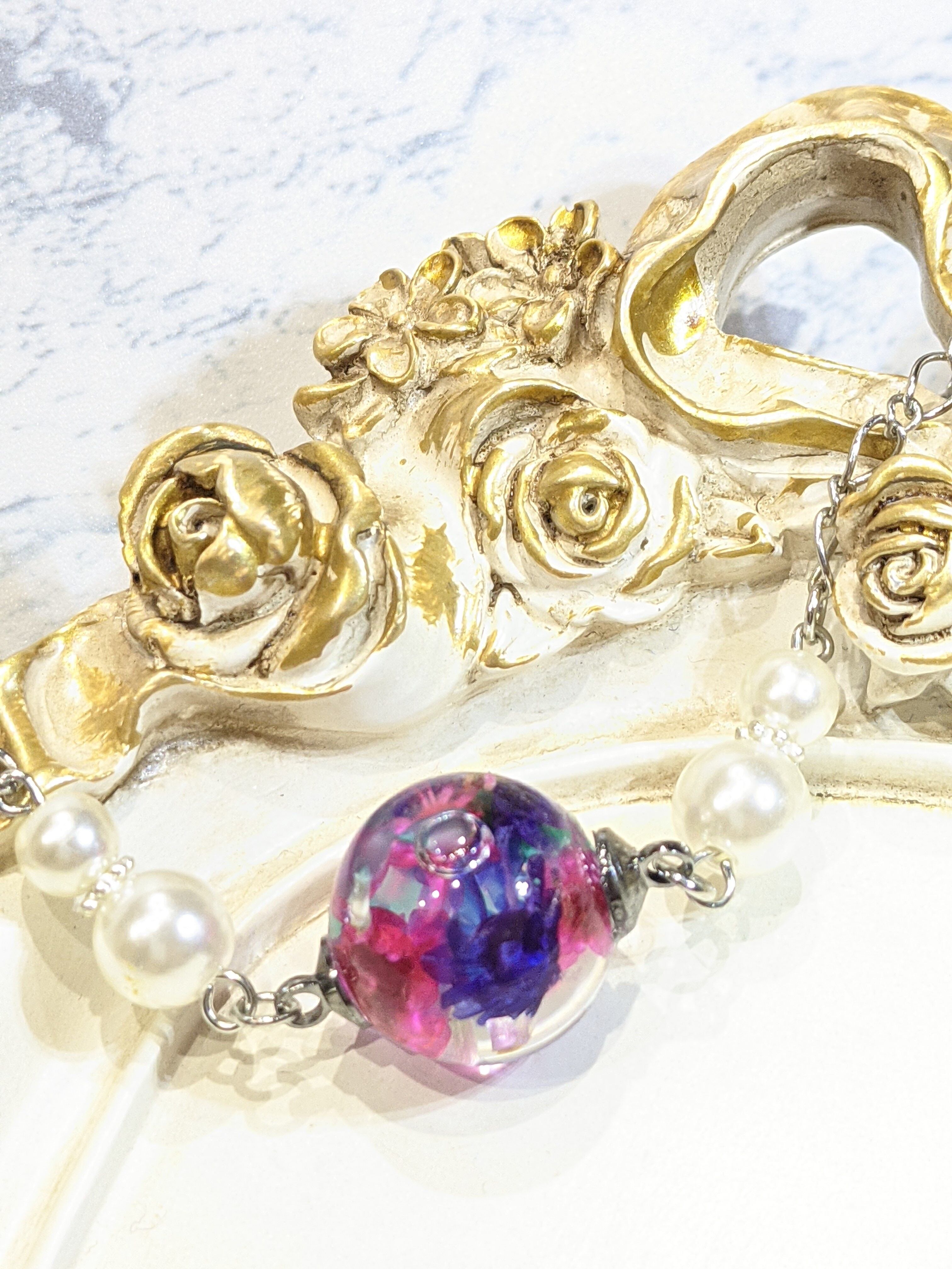 ハーバリウムのガラスドームに紫とブルーとぴんくのドライフラワーを詰め込みました。