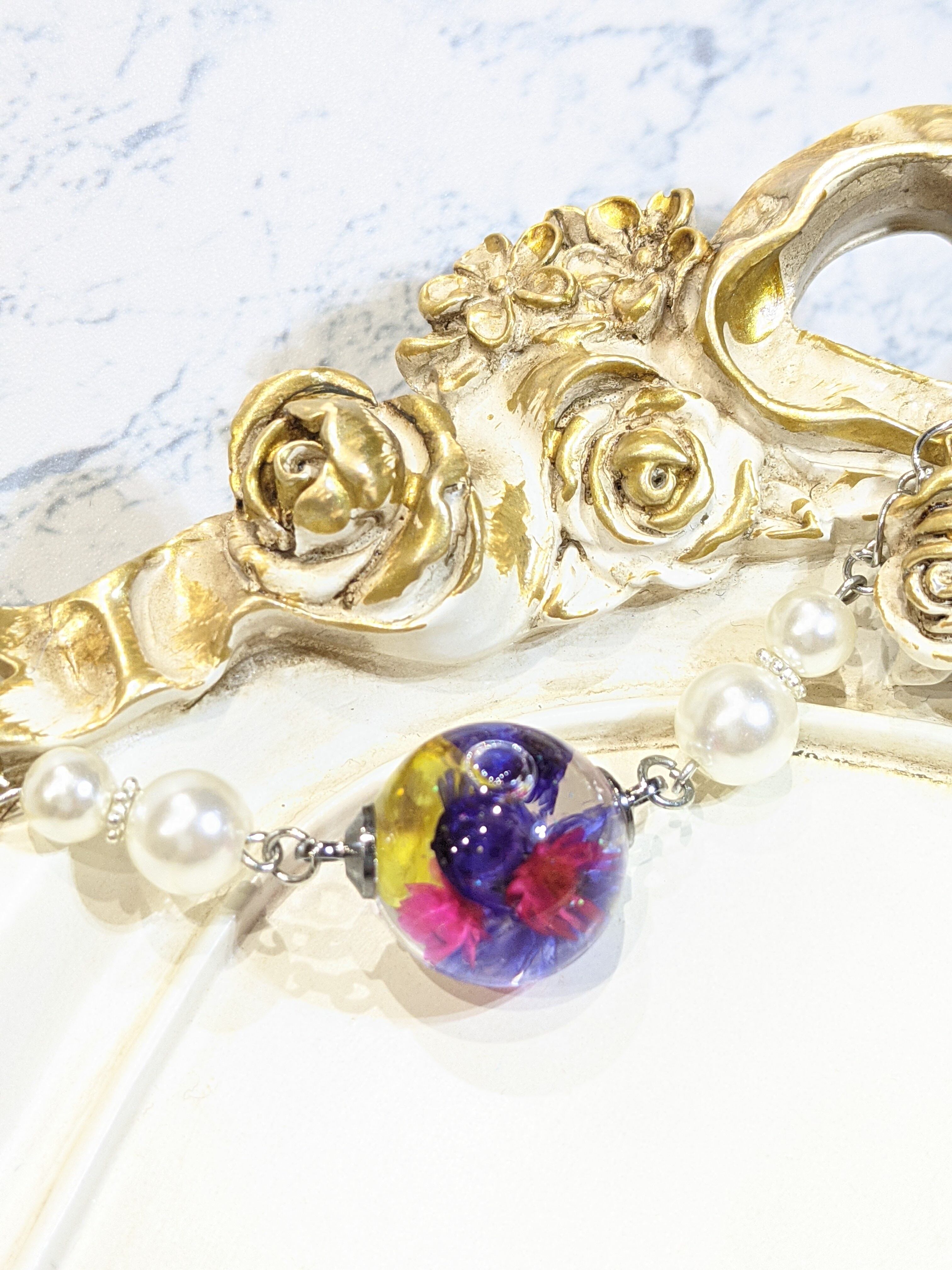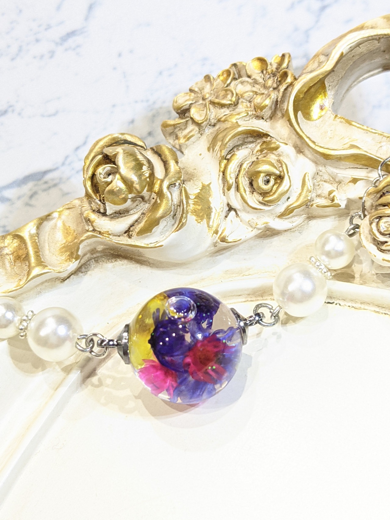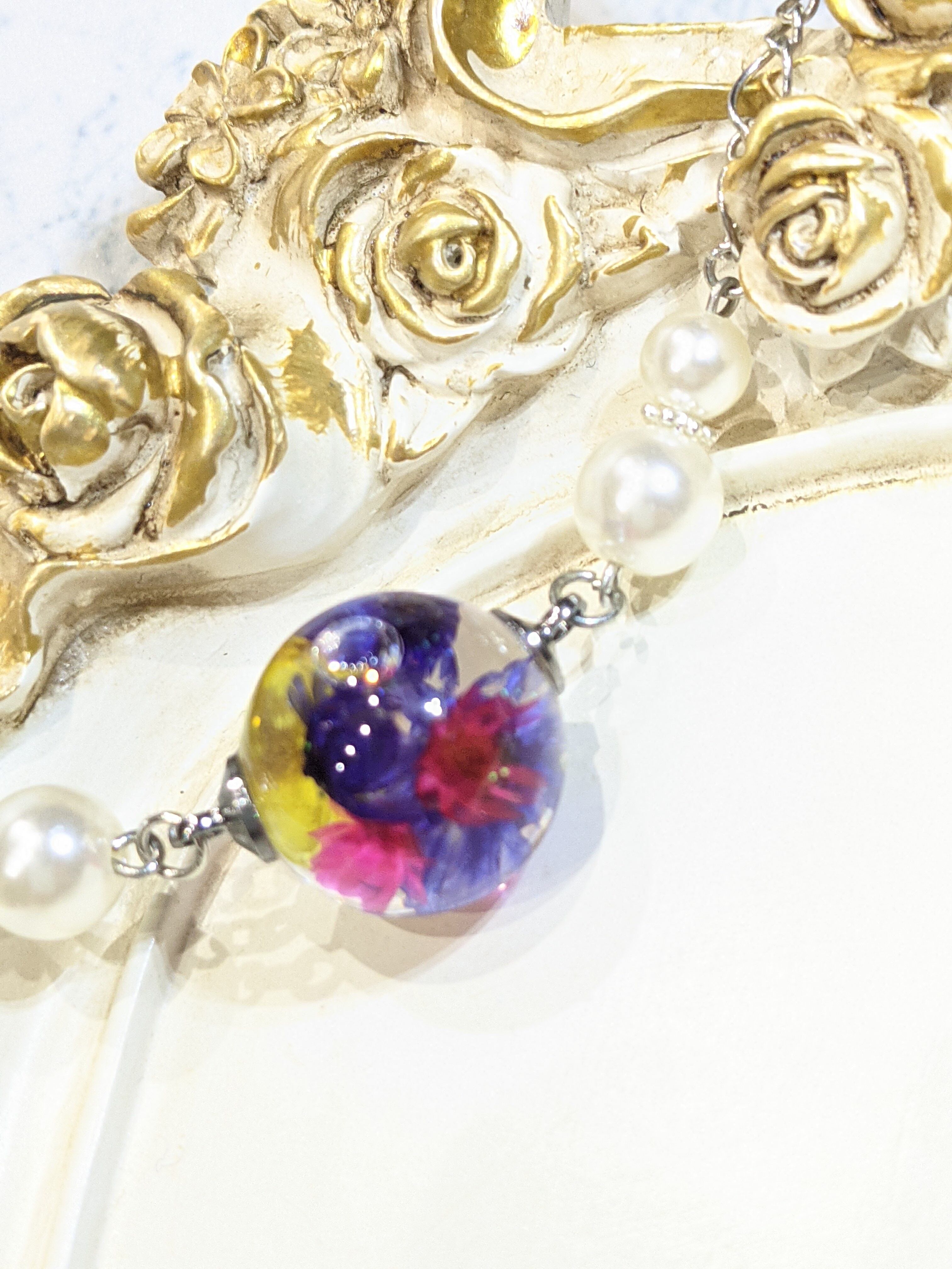 ハーバリウムのガラスドームに紫 黄色 ピンクのドライフラワーを詰め込みました。