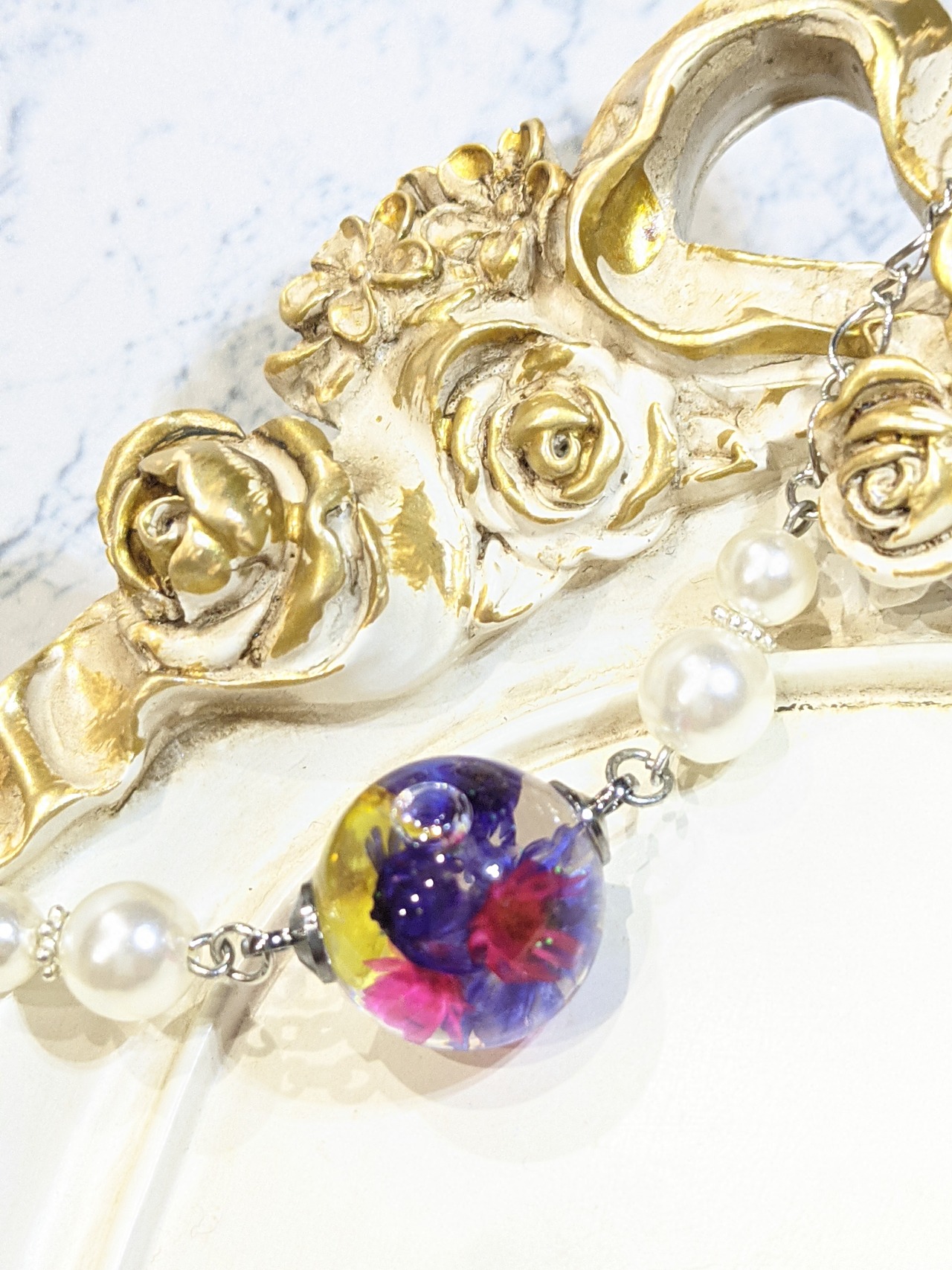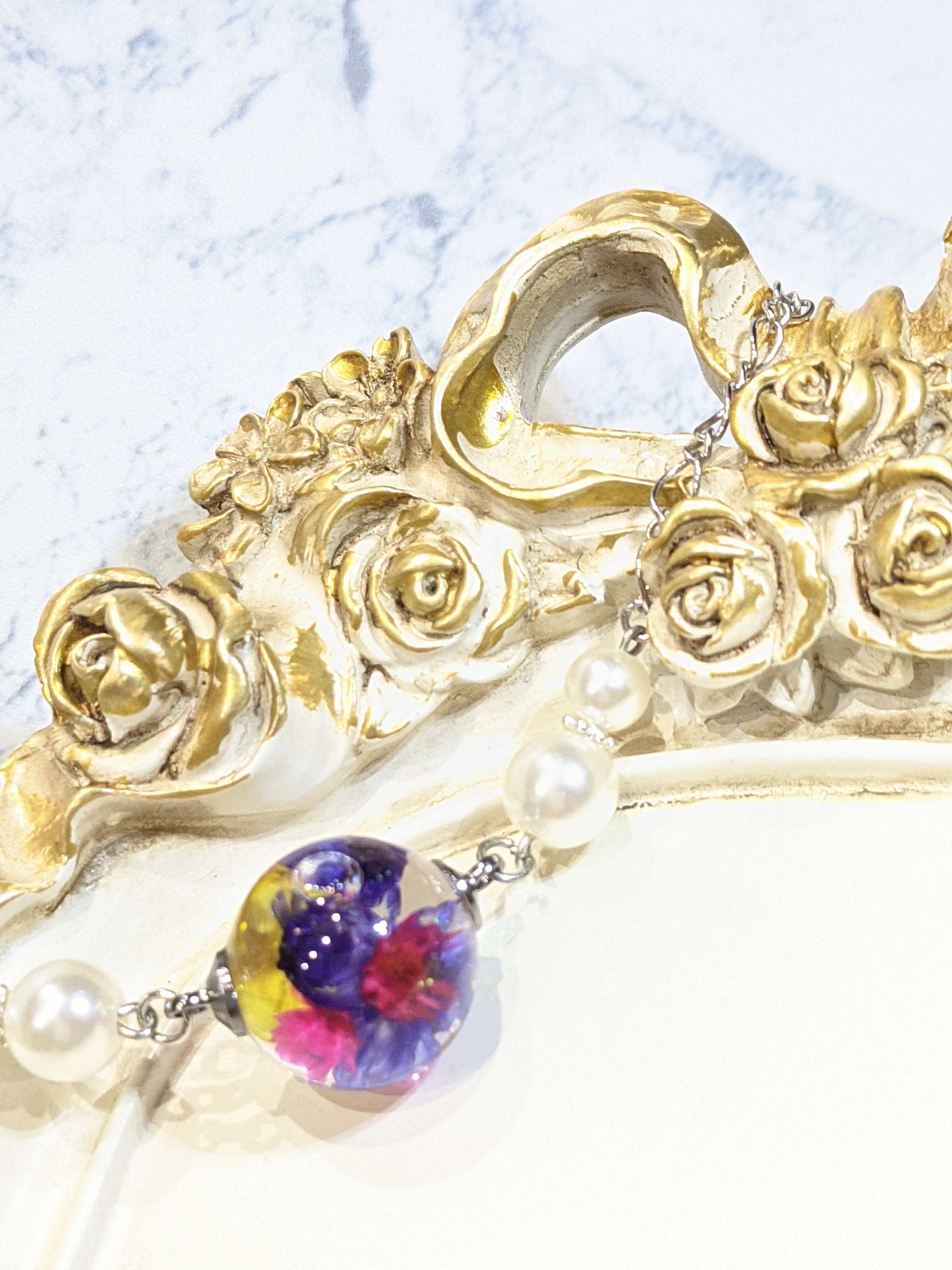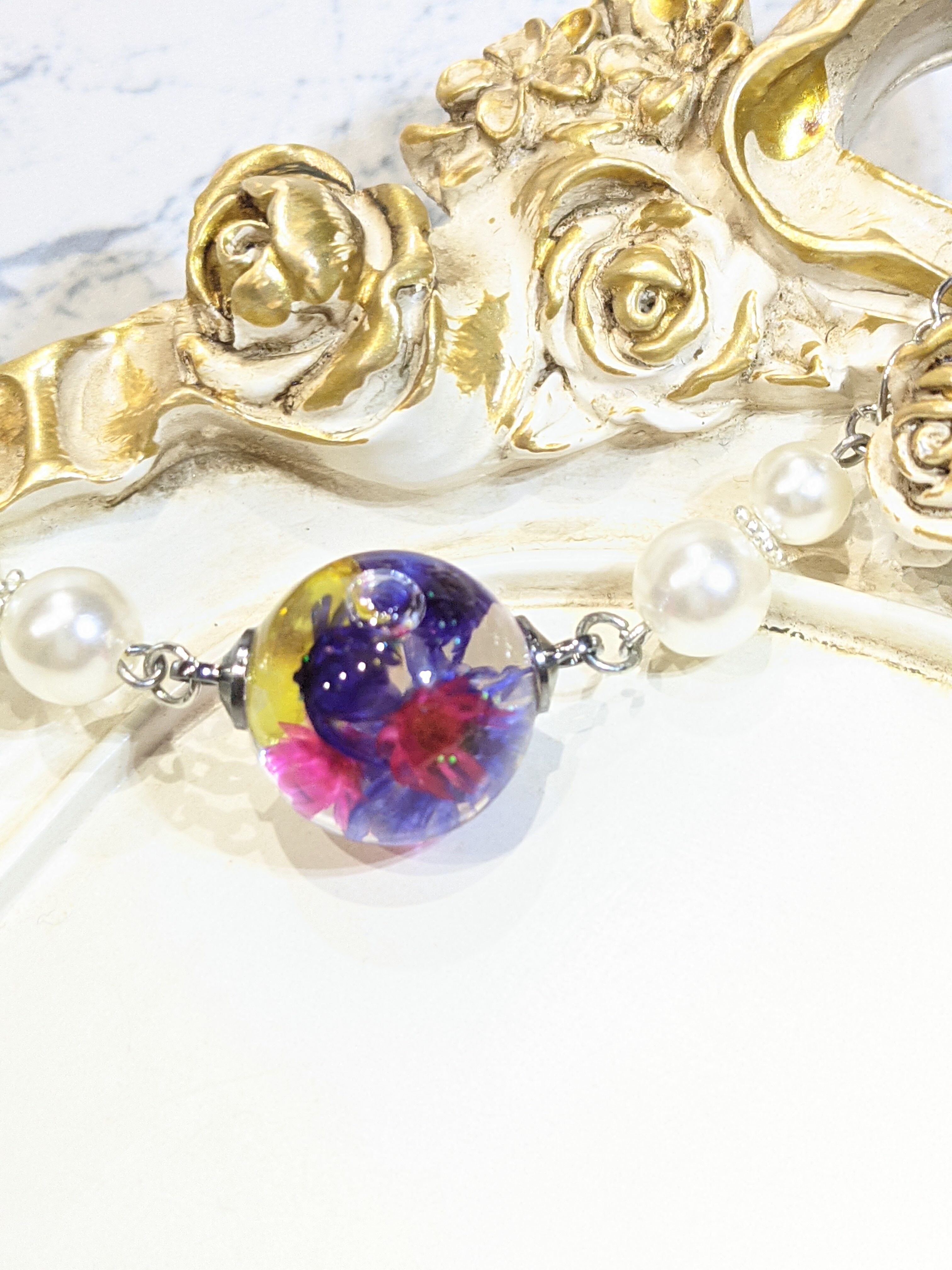 ハーバリウムのガラスドームに紫 黄色 ピンクのドライフラワーを詰め込みました。