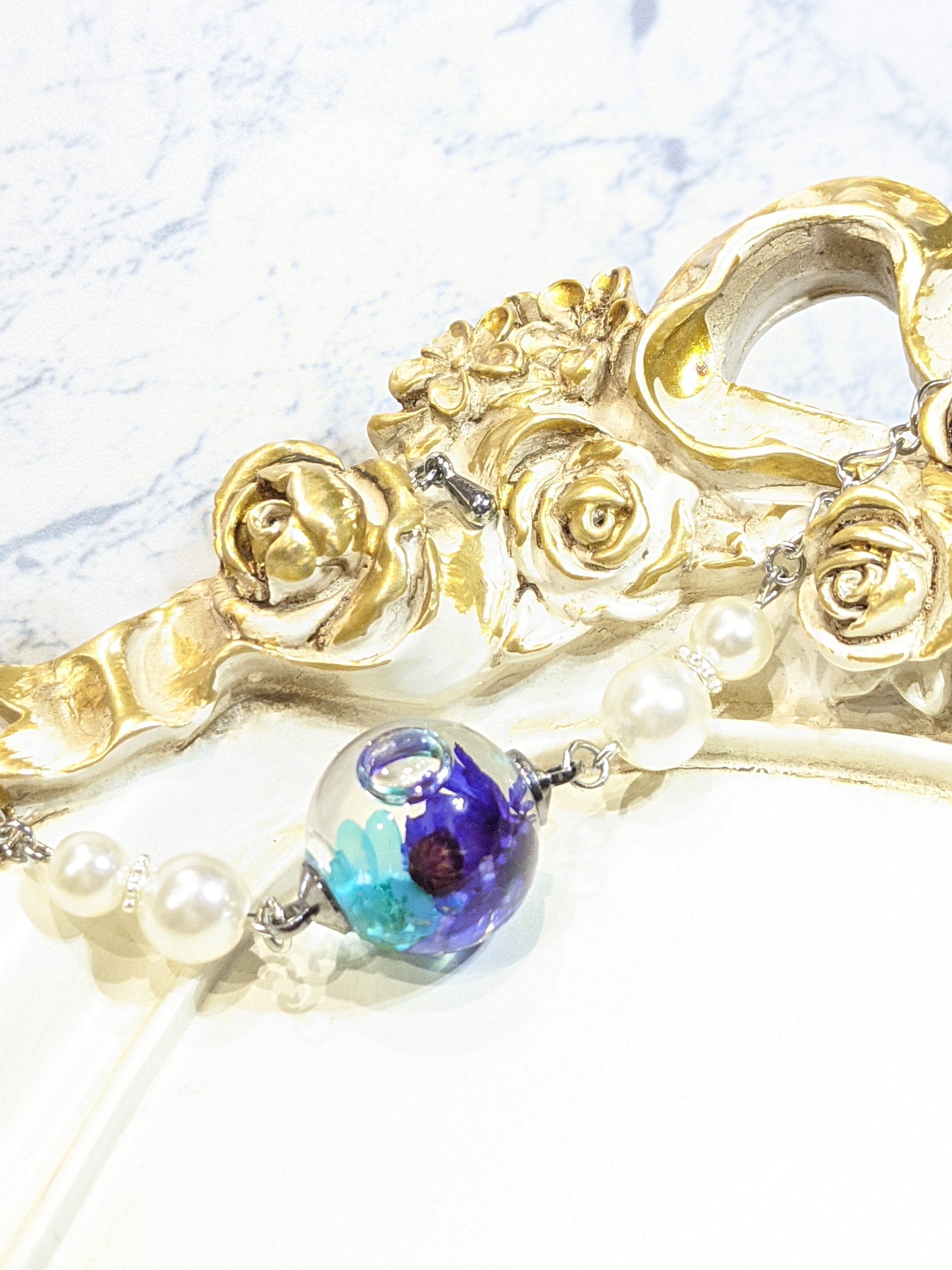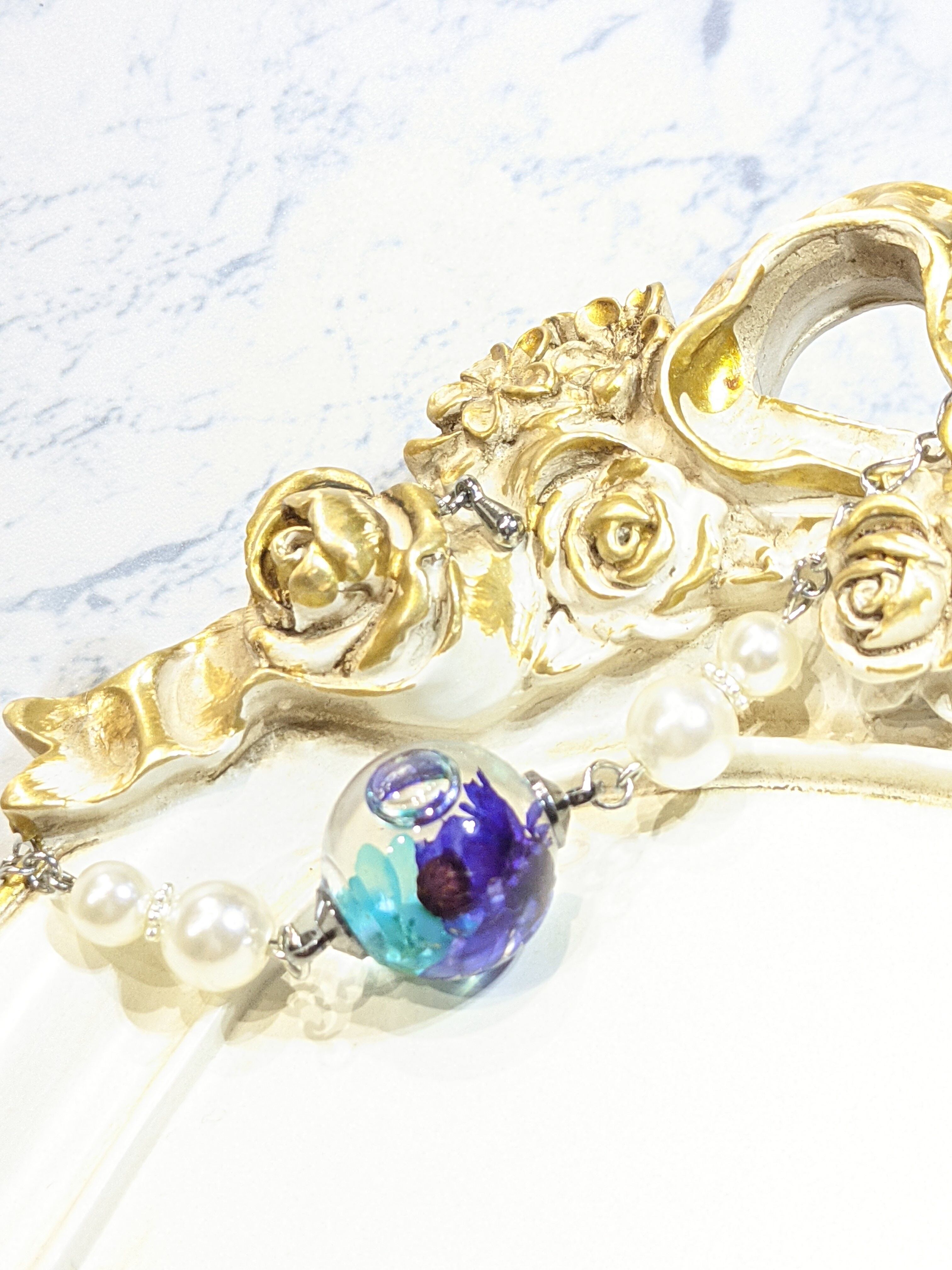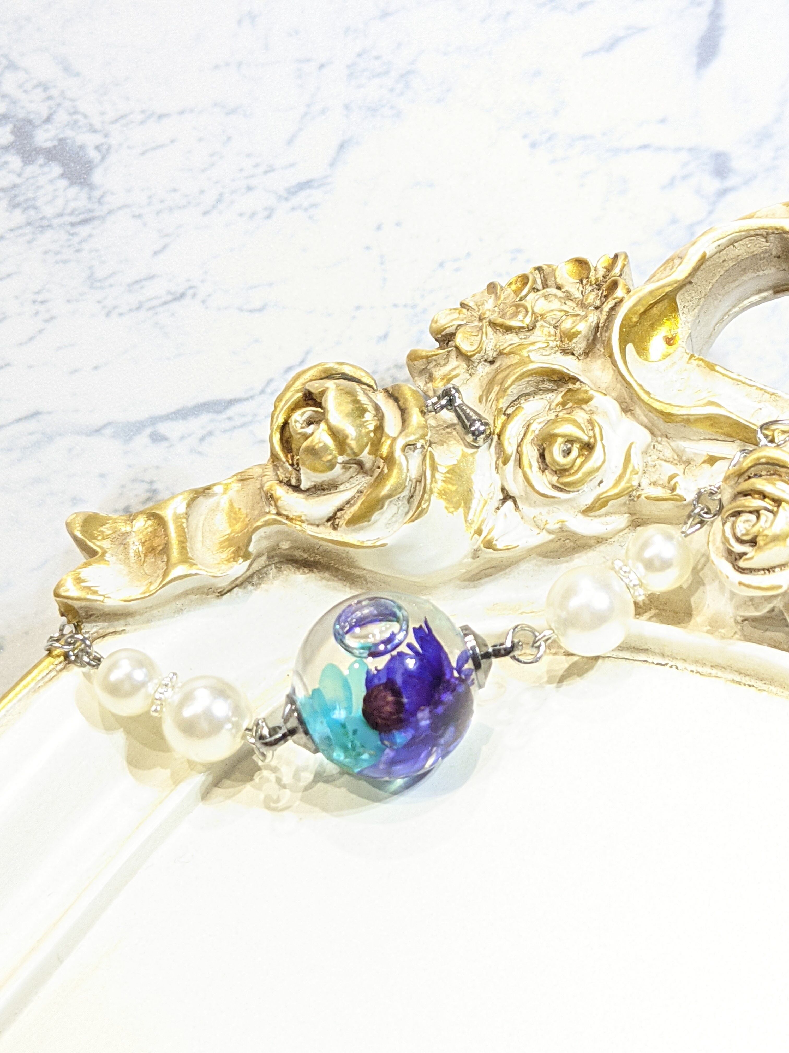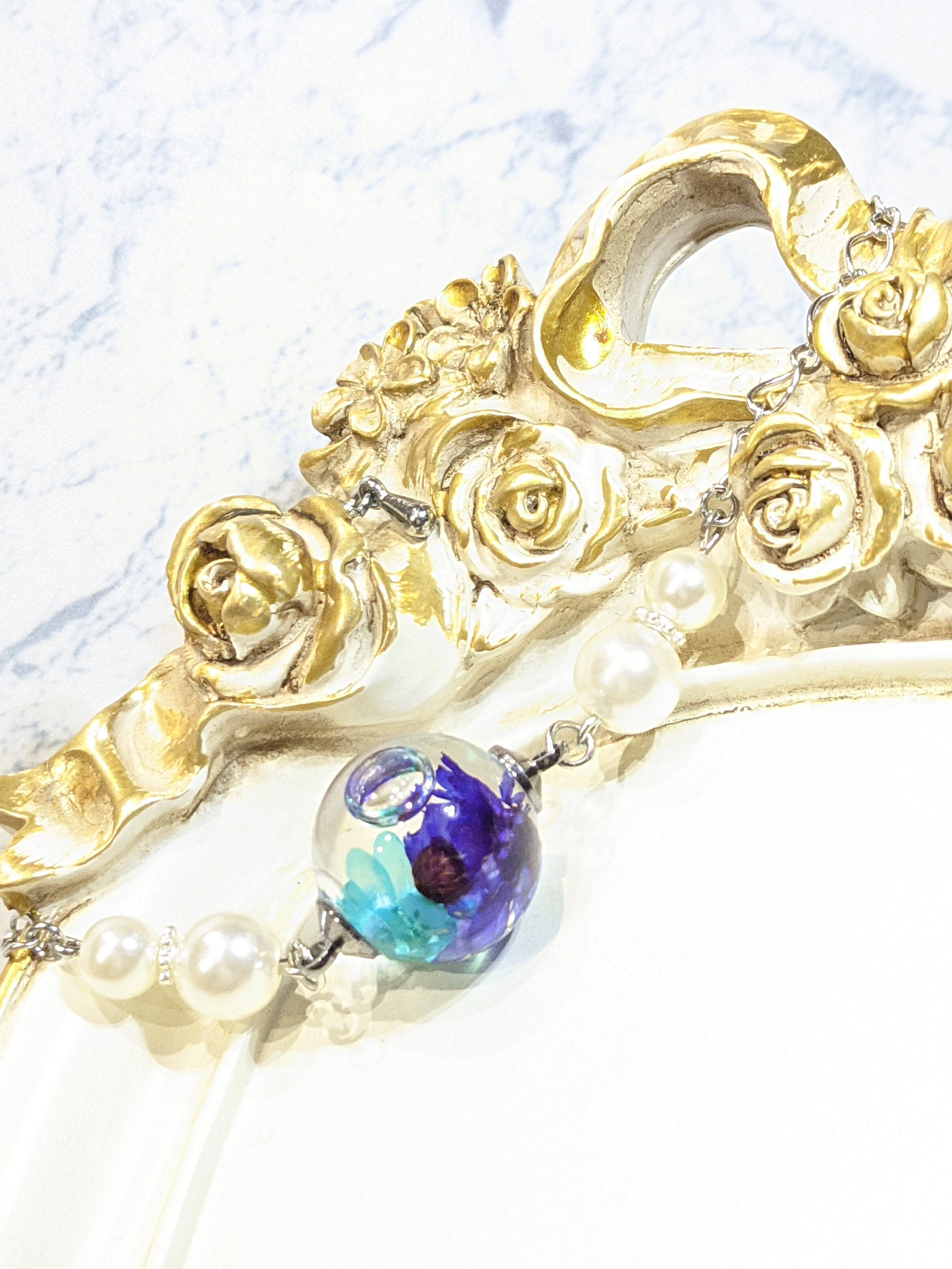 ハーバリウムのガラスドームに紫とブルーのドライフラワーを詰め込みました。