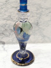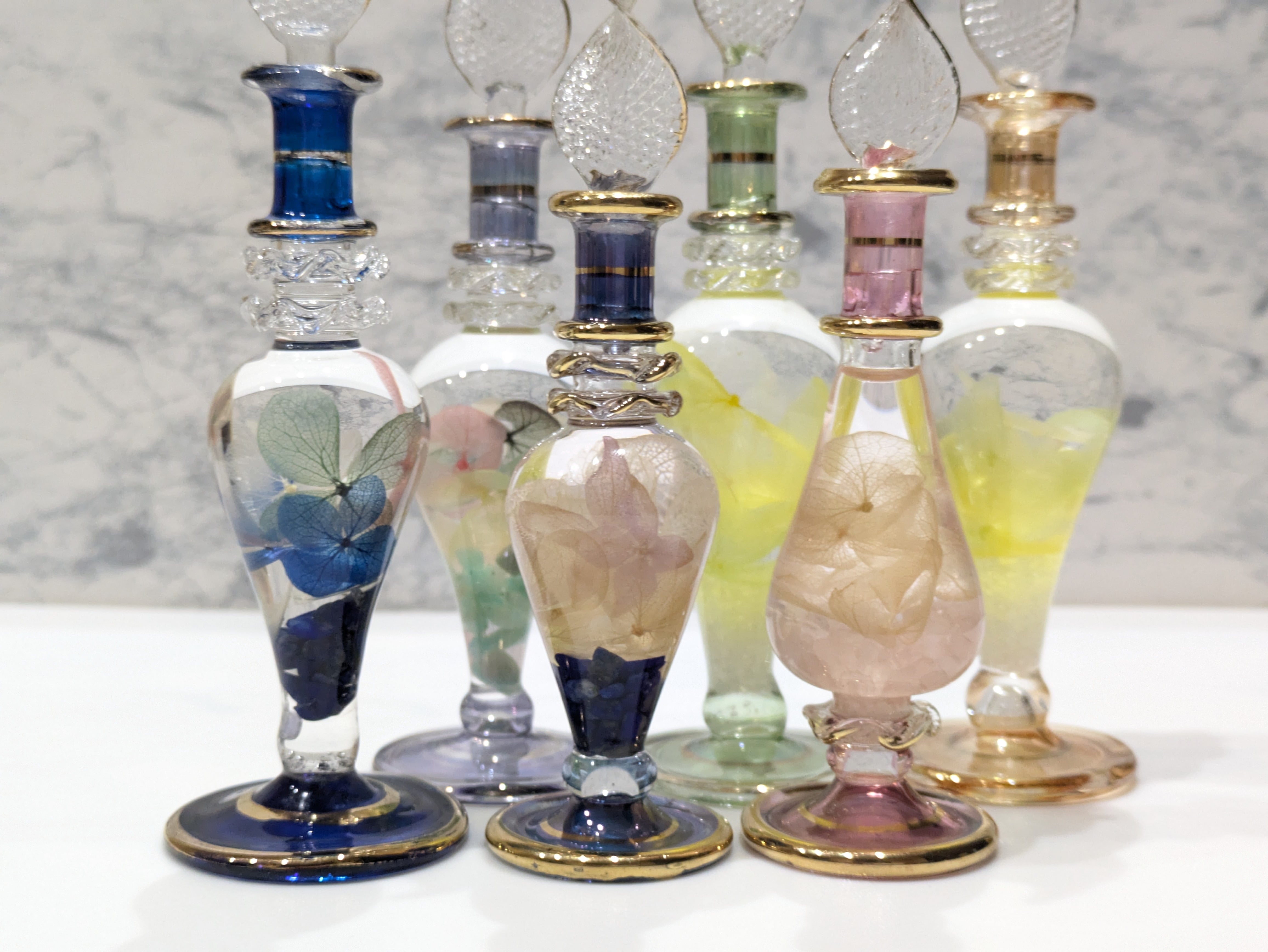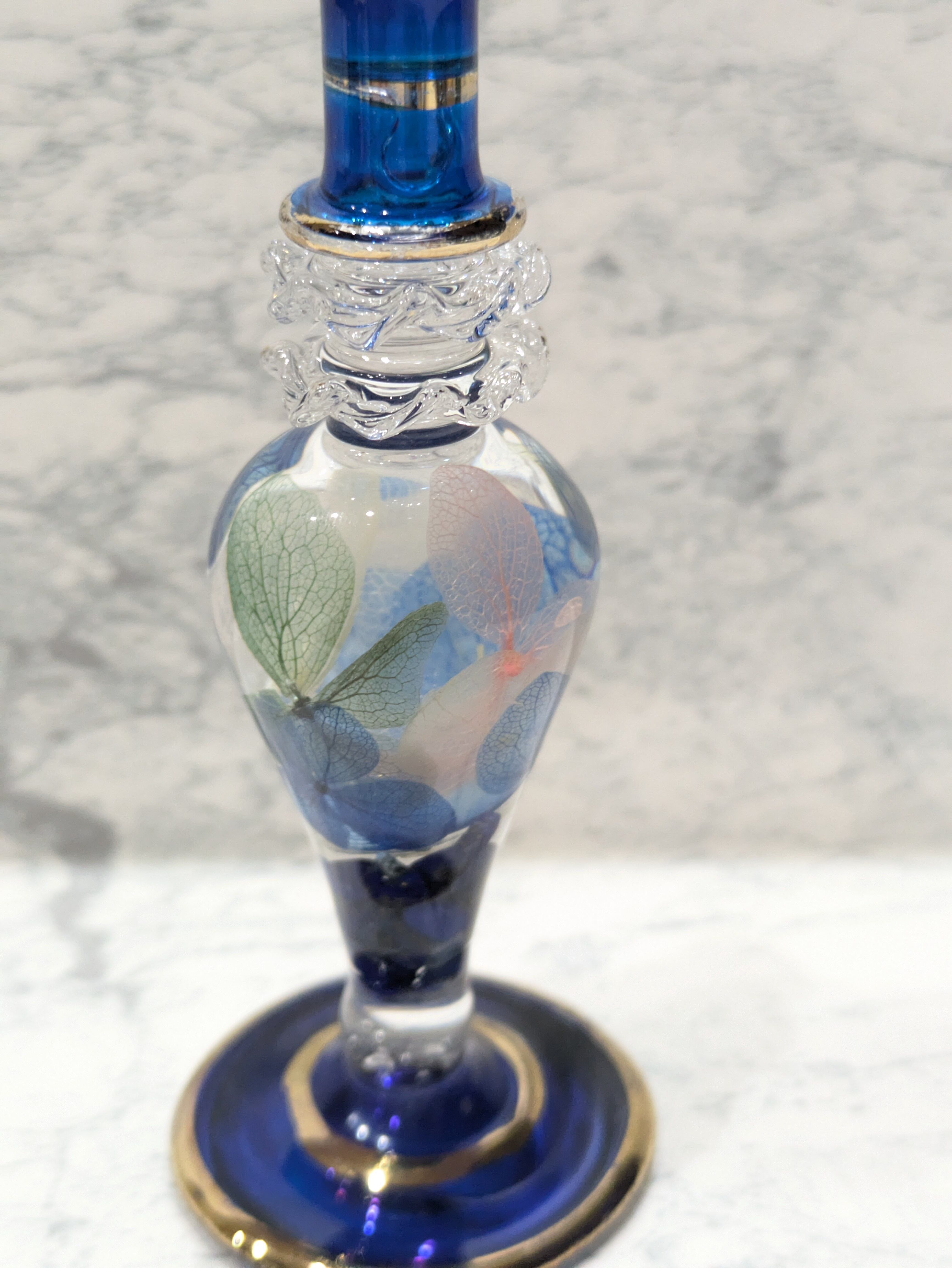 すごくファンタジックでステキガラスのボトルにドライフラワーのアジサイを詰め込みました。