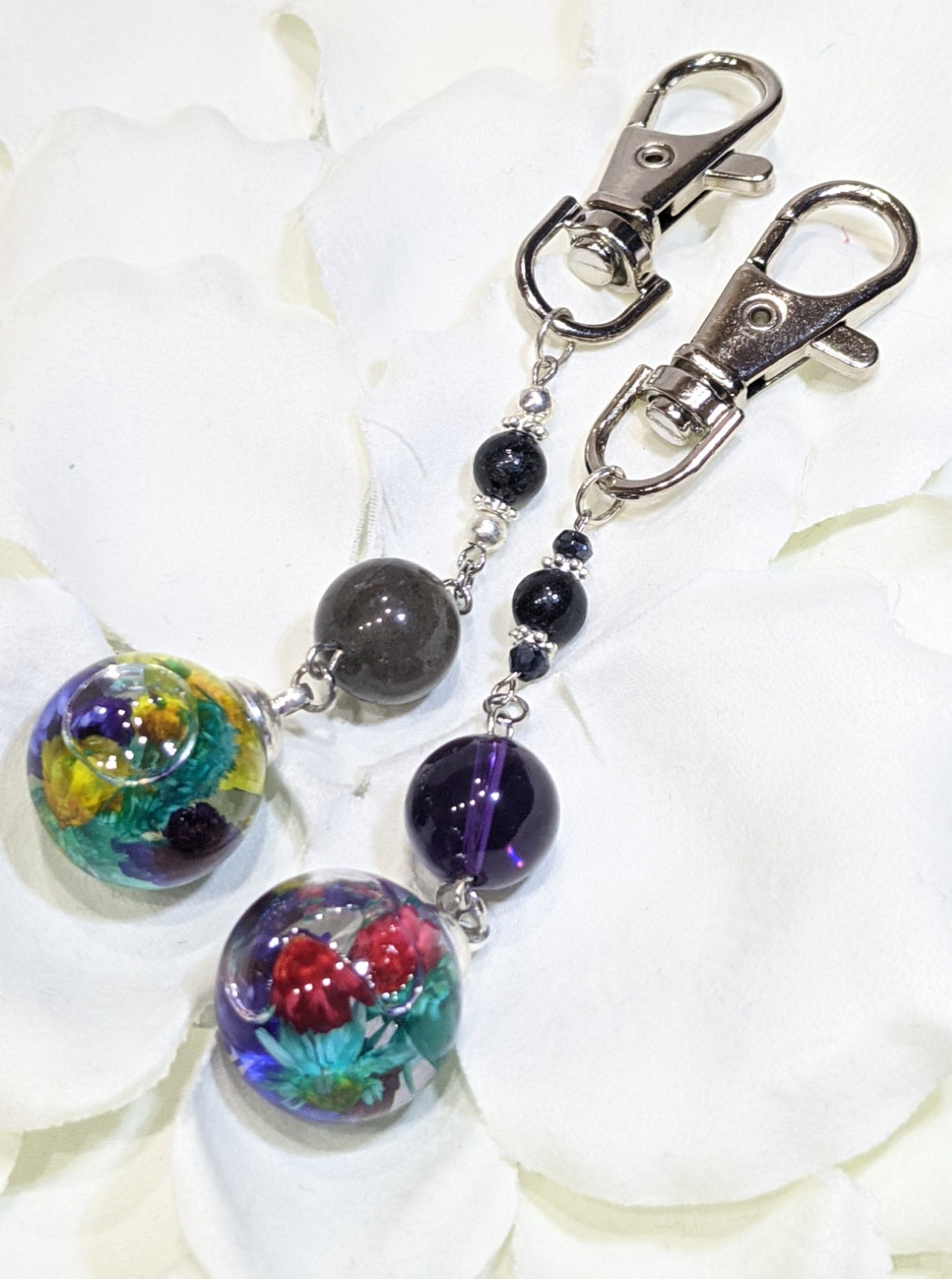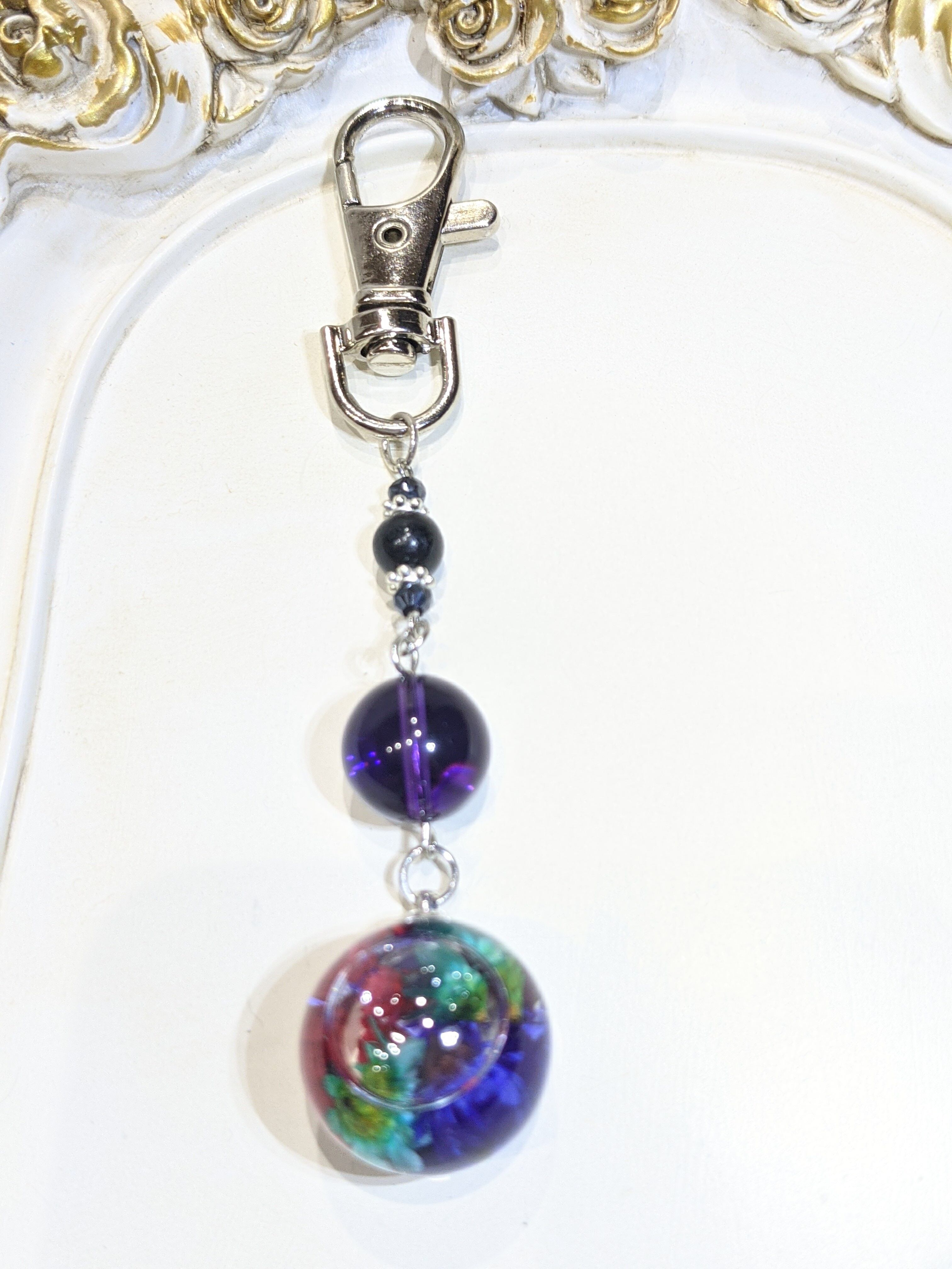 ハーバリウムのガラスドームにドライフラワーを詰め込んで、パワーストーンと組み合わせ、チャームにしました。