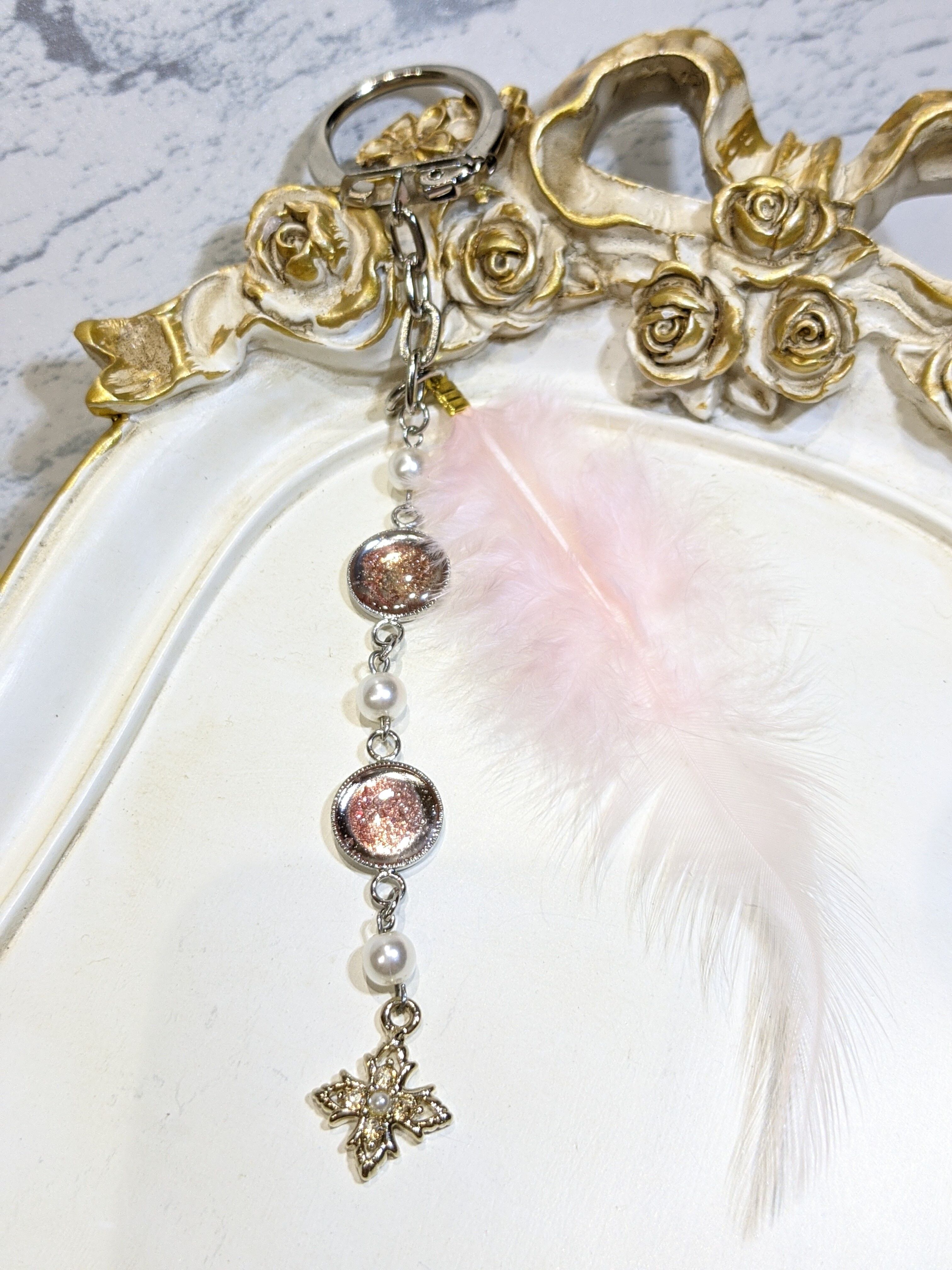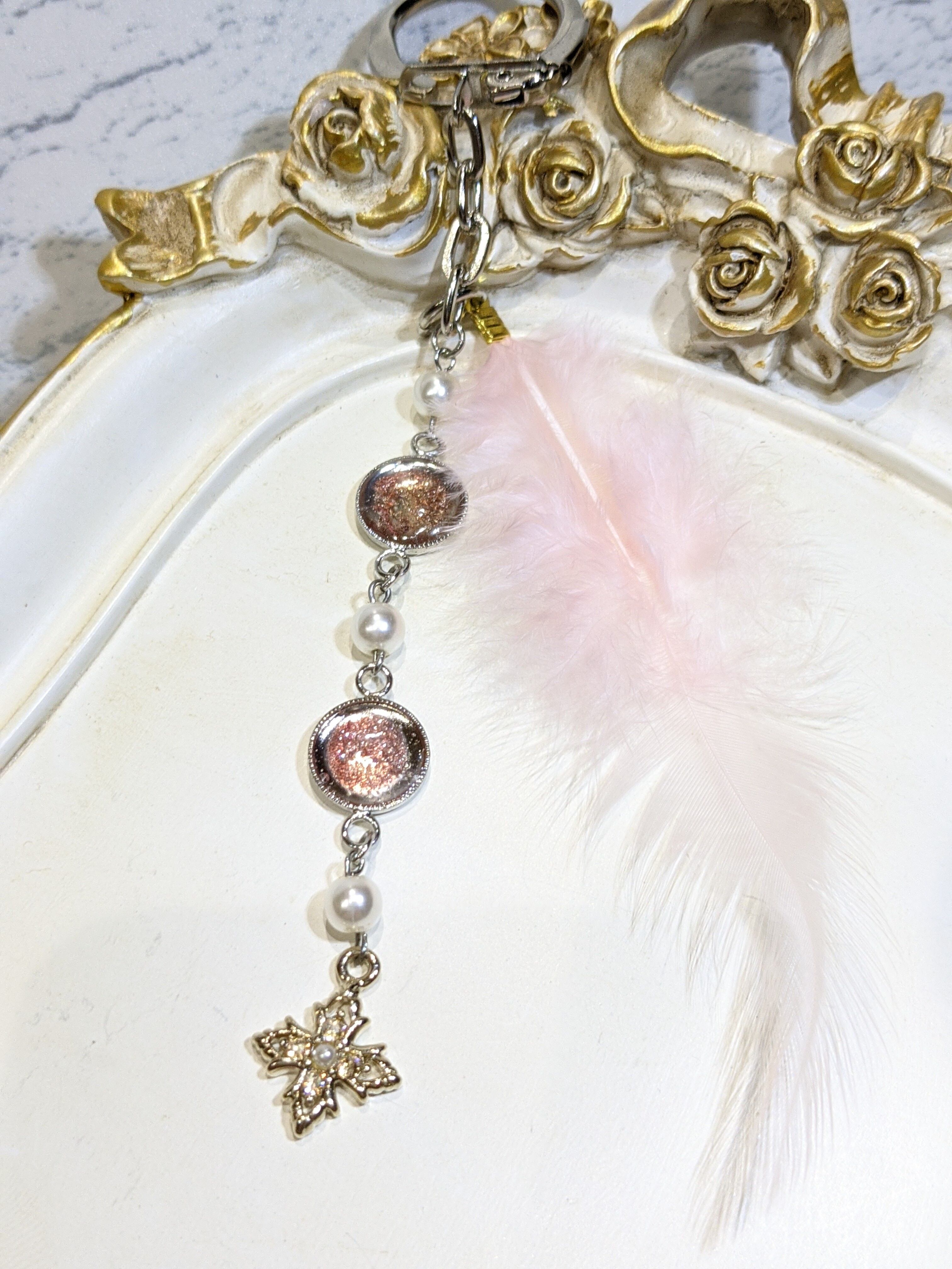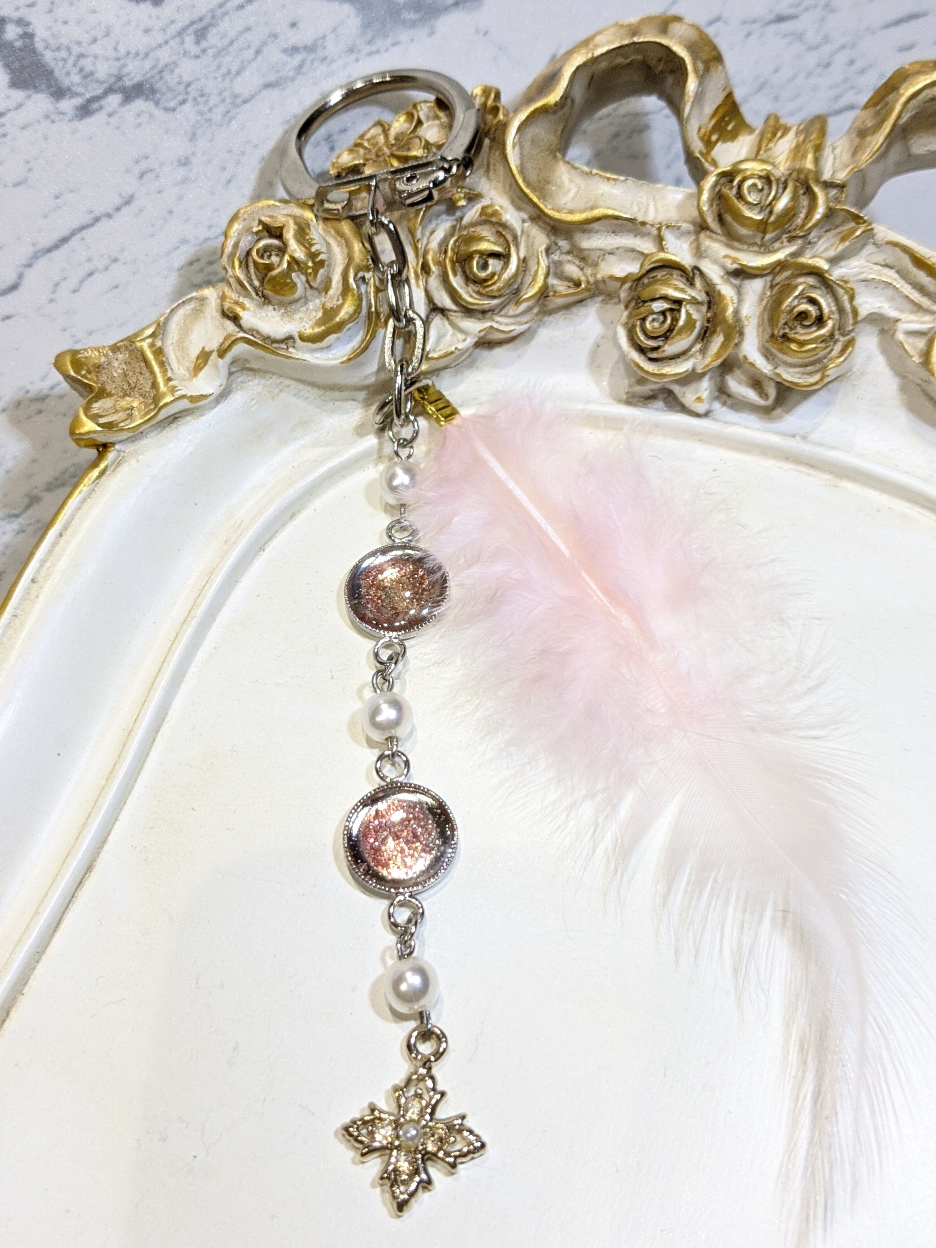 天使の羽根のような可愛らしい羽根とゴールドのクロスチャームとパールビーズを組み合わせ、チャームにしました。
