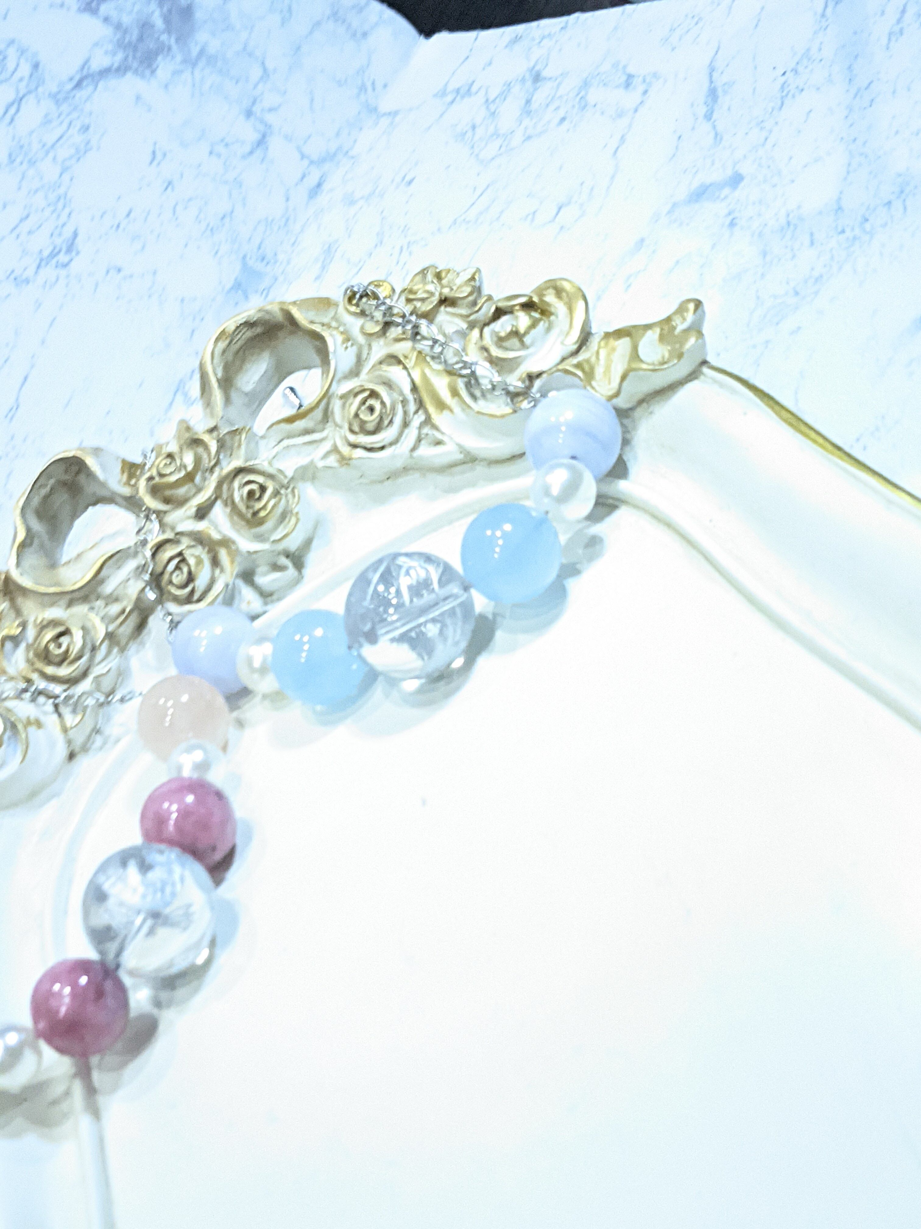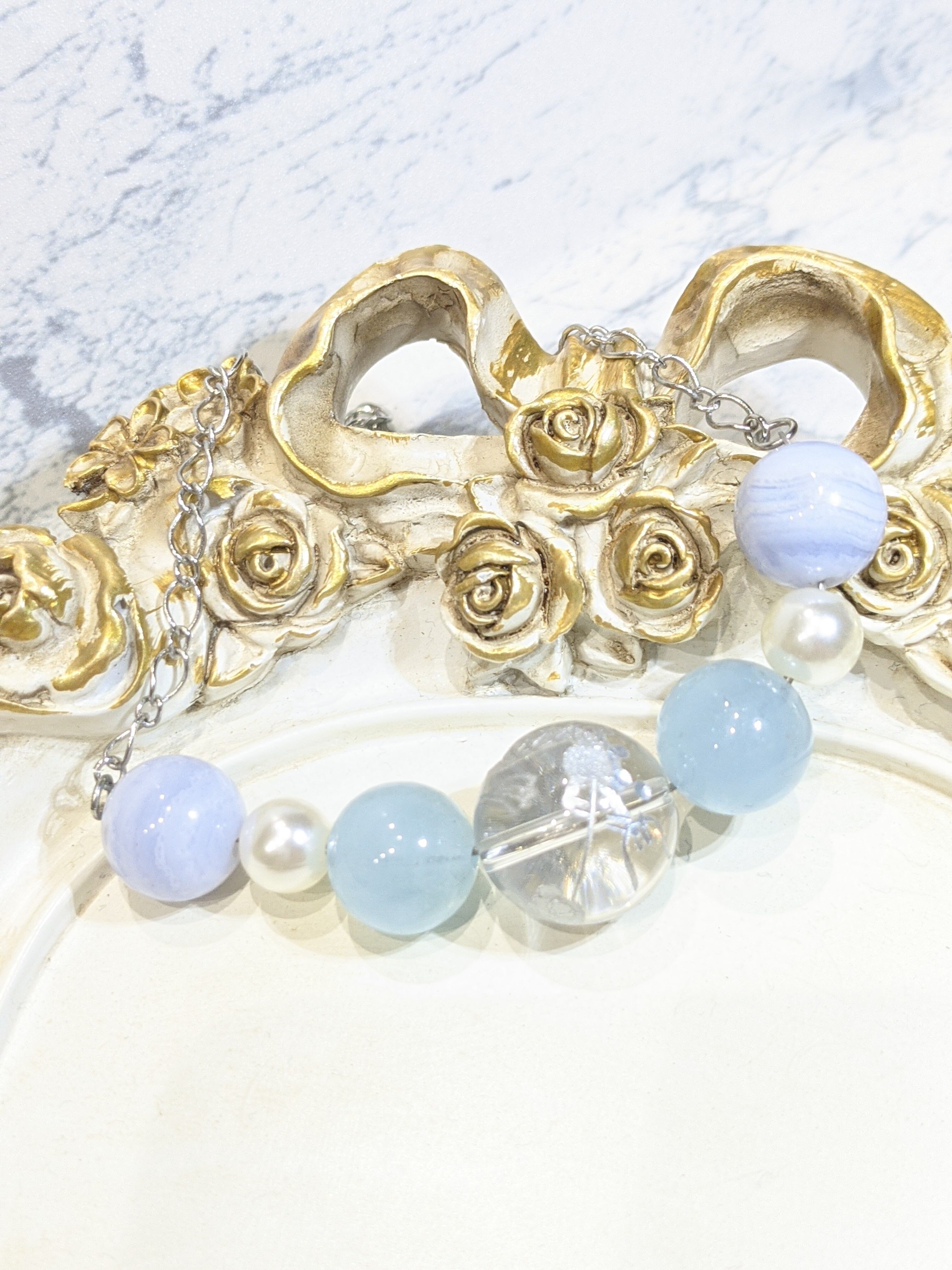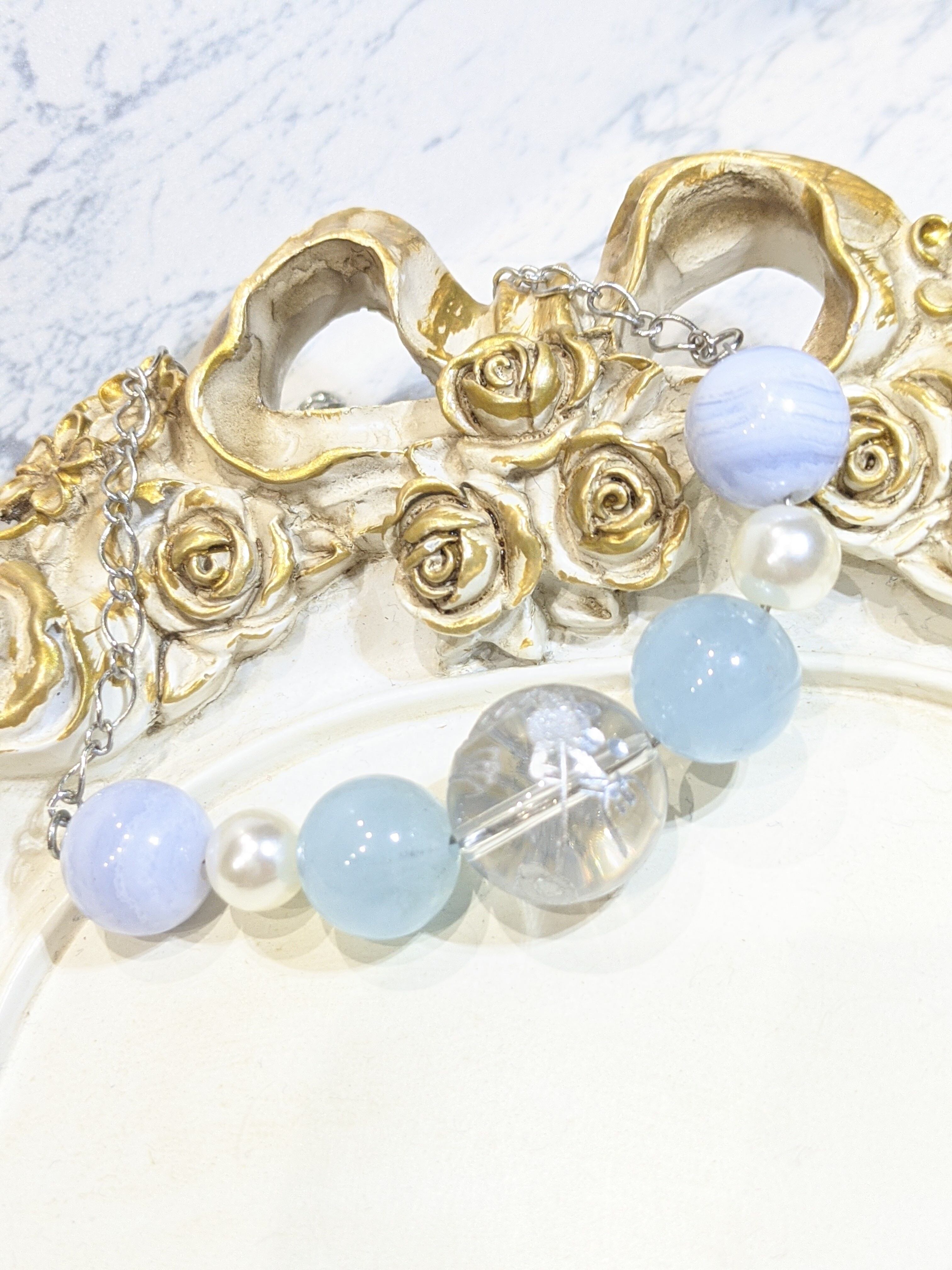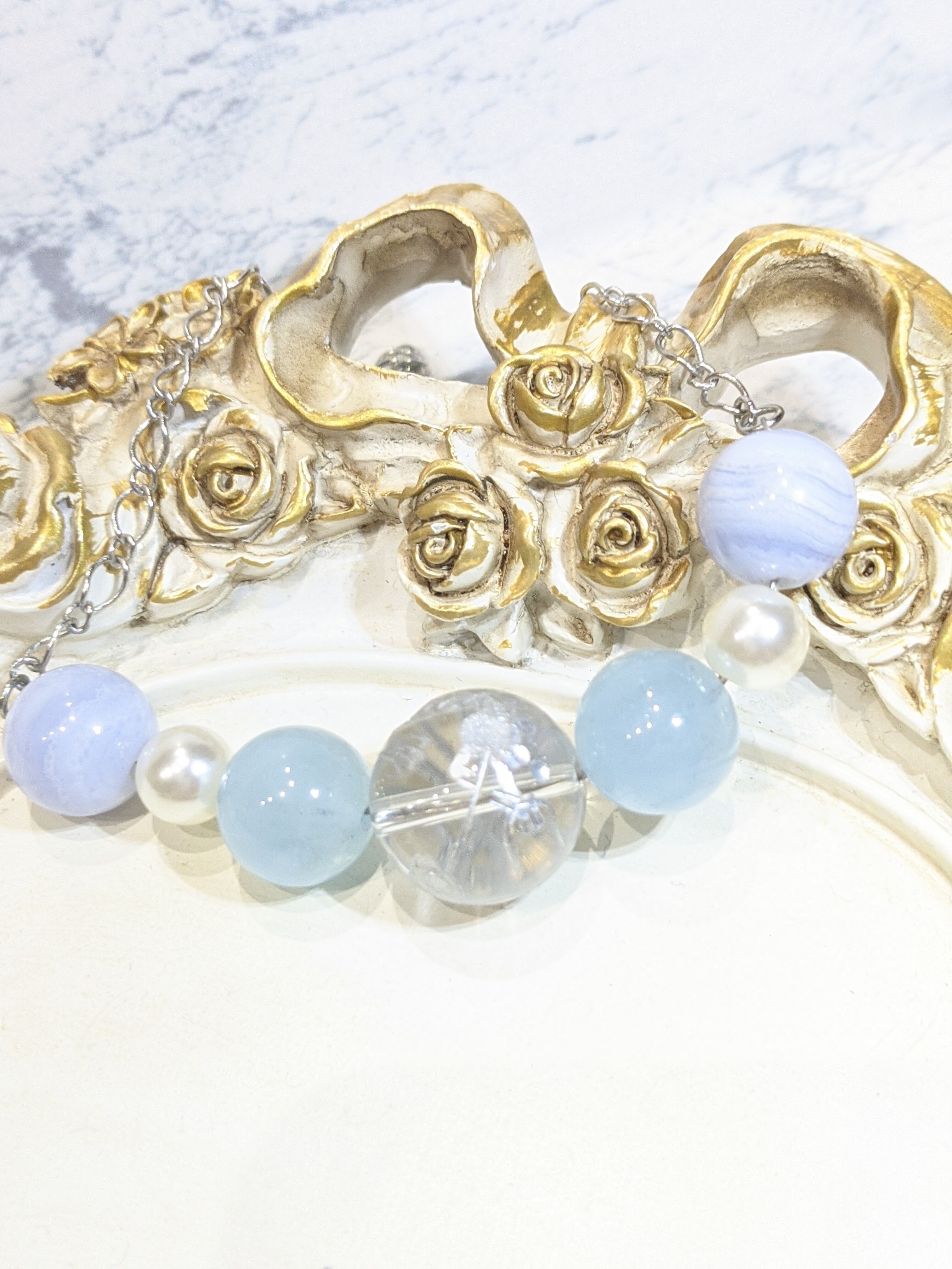 シルバーのドラゴンが刻まれているクリスタル大玉18ミリにアクアマリン ブルーレースアゲートとパールビーズを組み合わせました。
