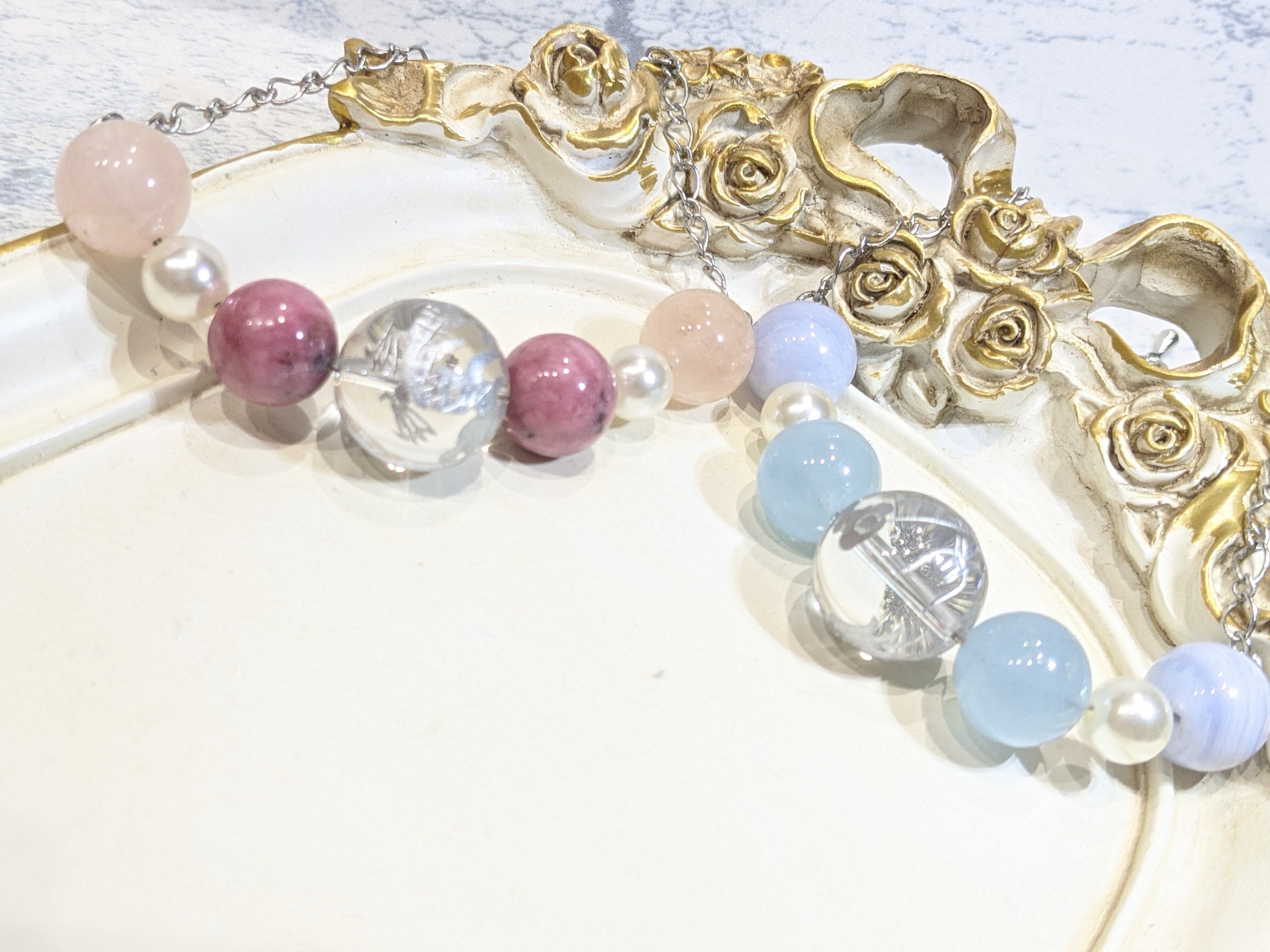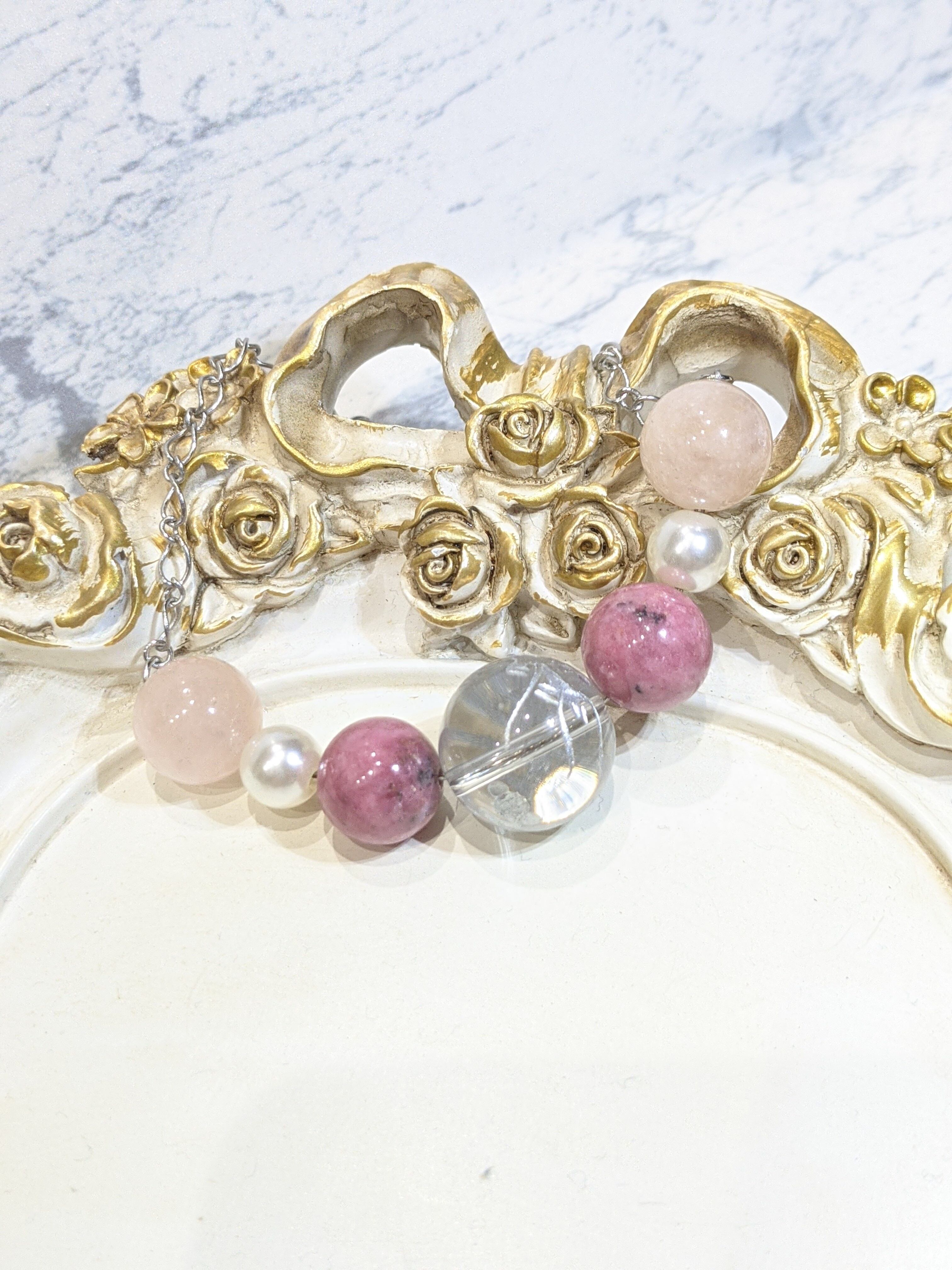 シルバーのドラゴンが刻まれているクリスタル大玉18ミリに恋愛成就系の天然石 ロードナイト ローズクォーツ パールビーズを組み合わせました。