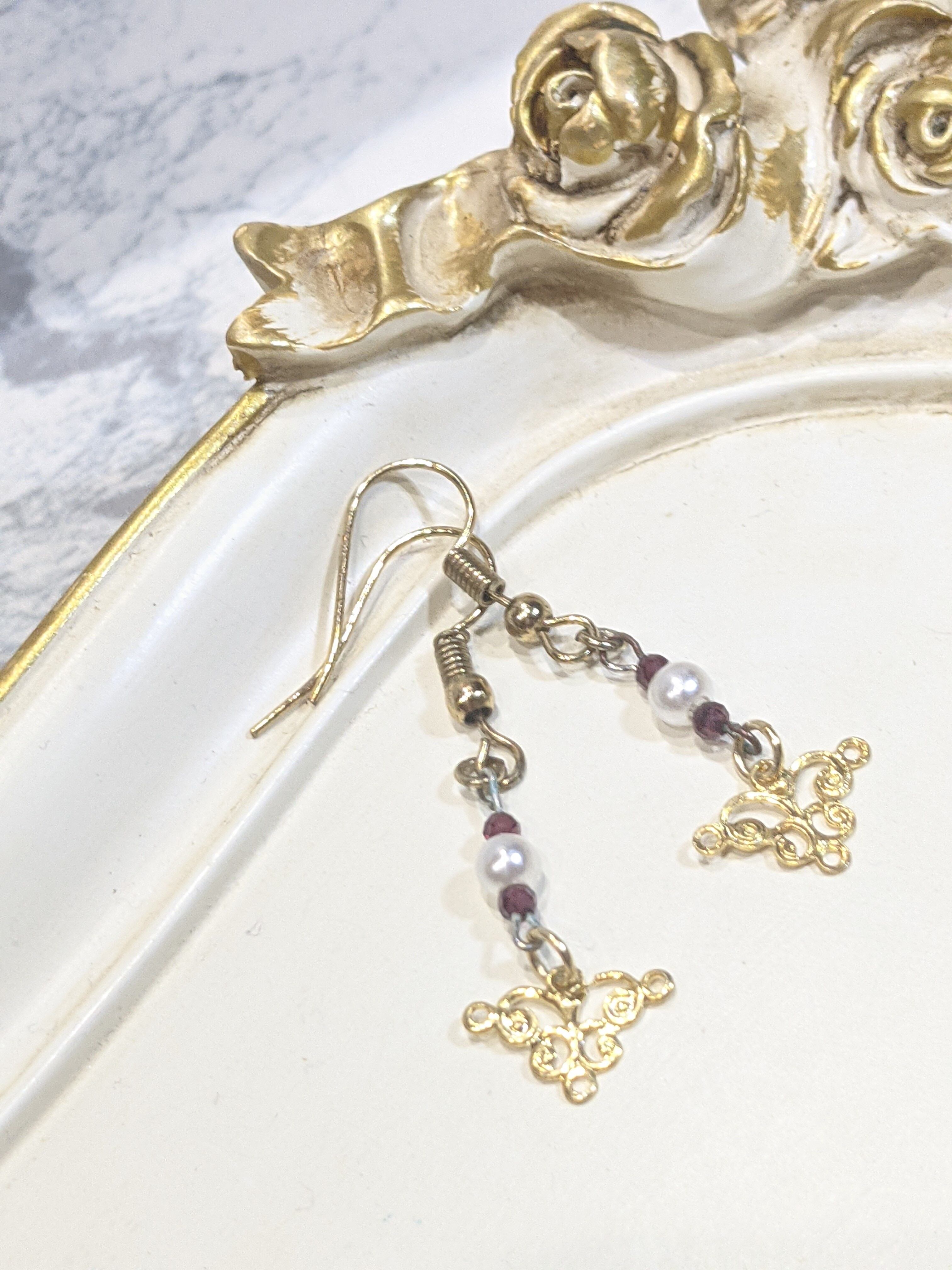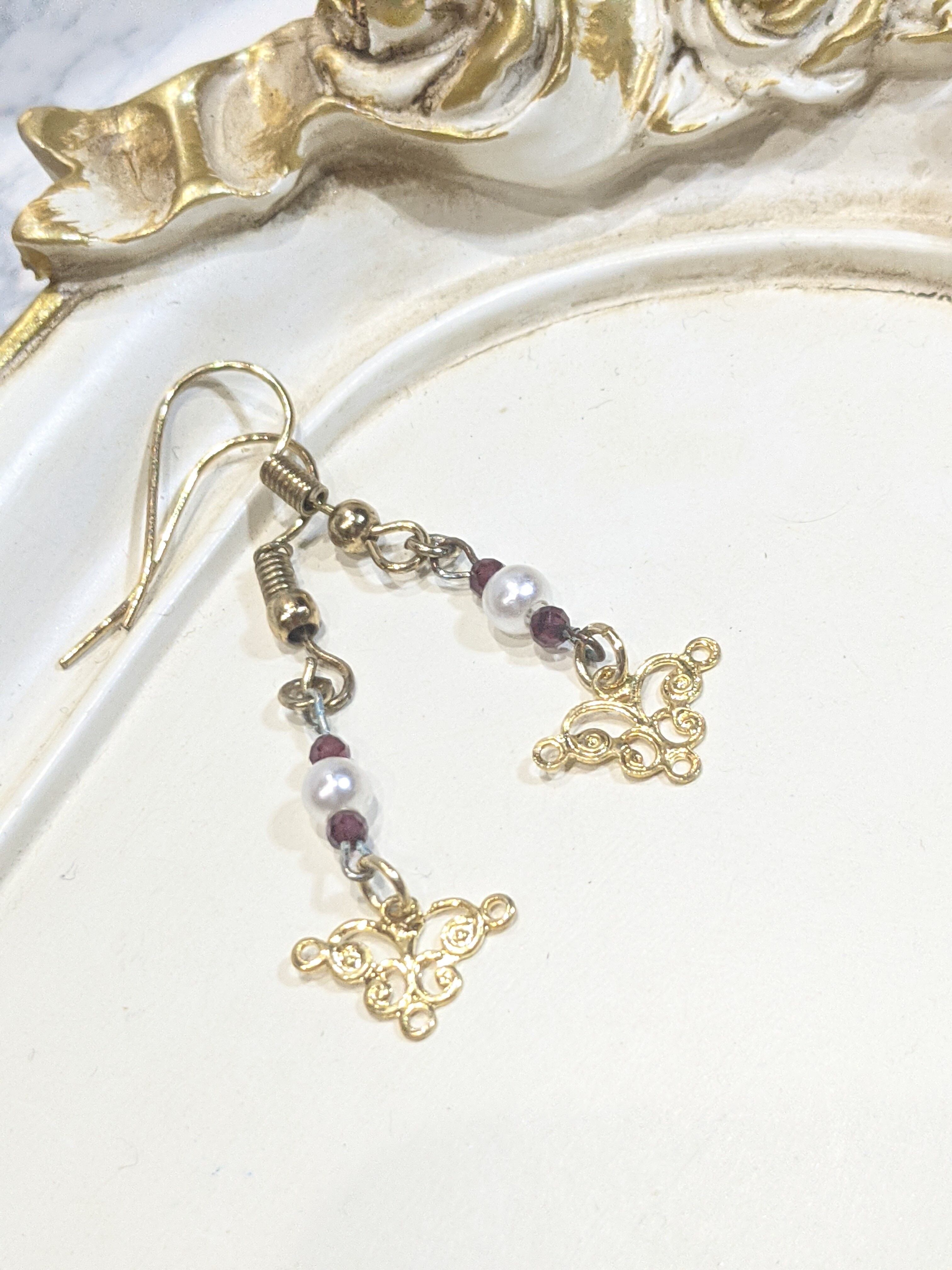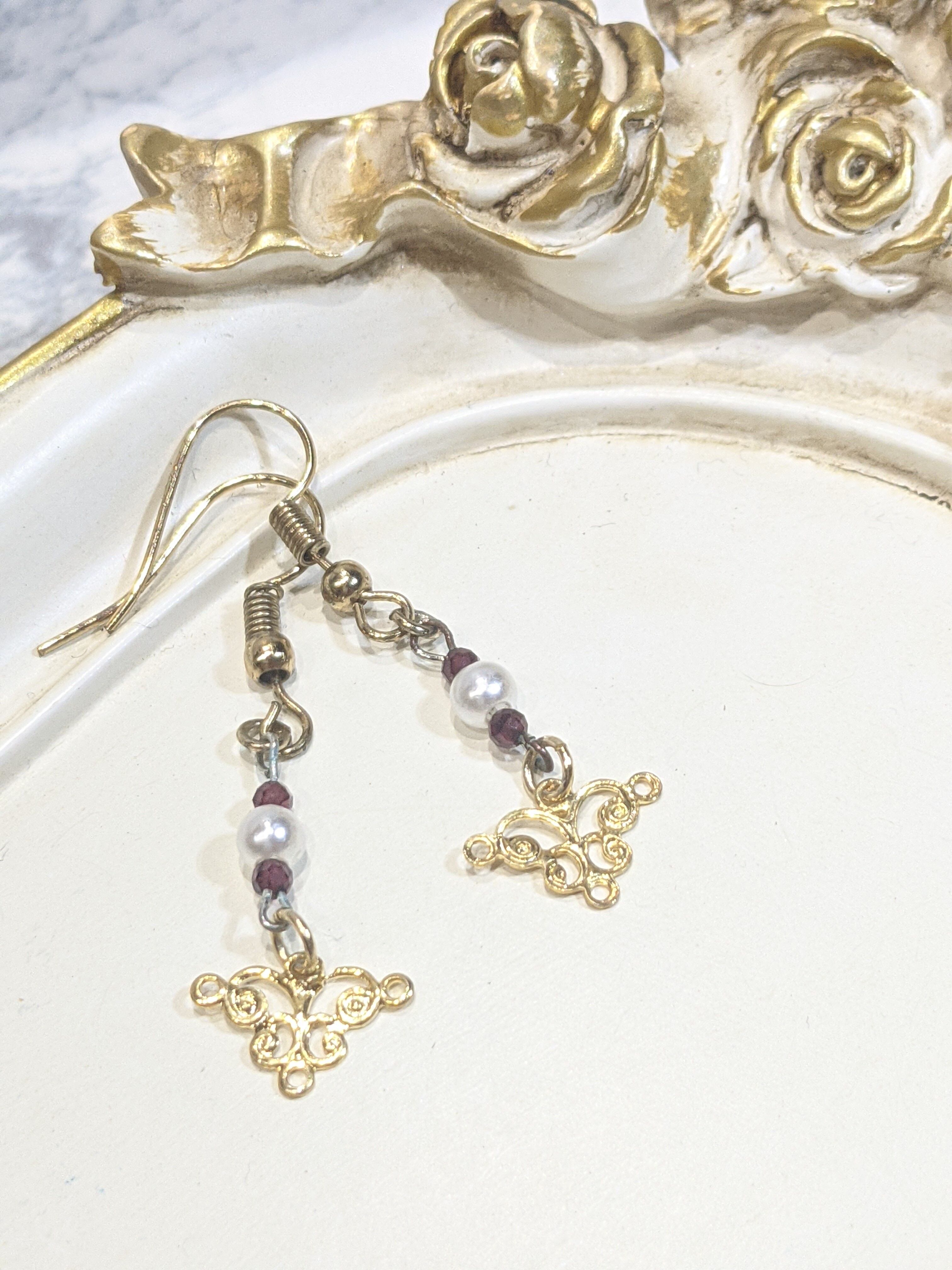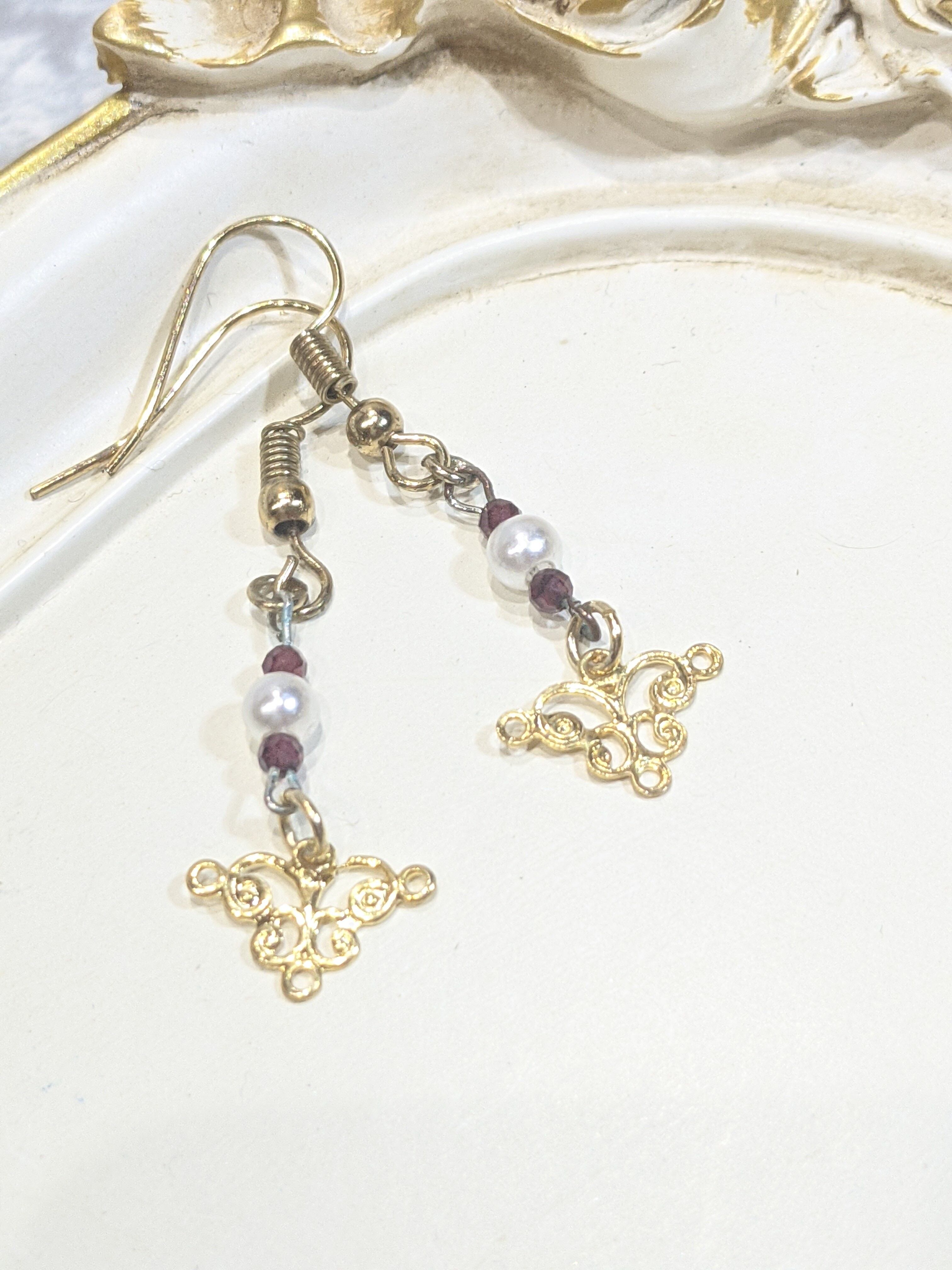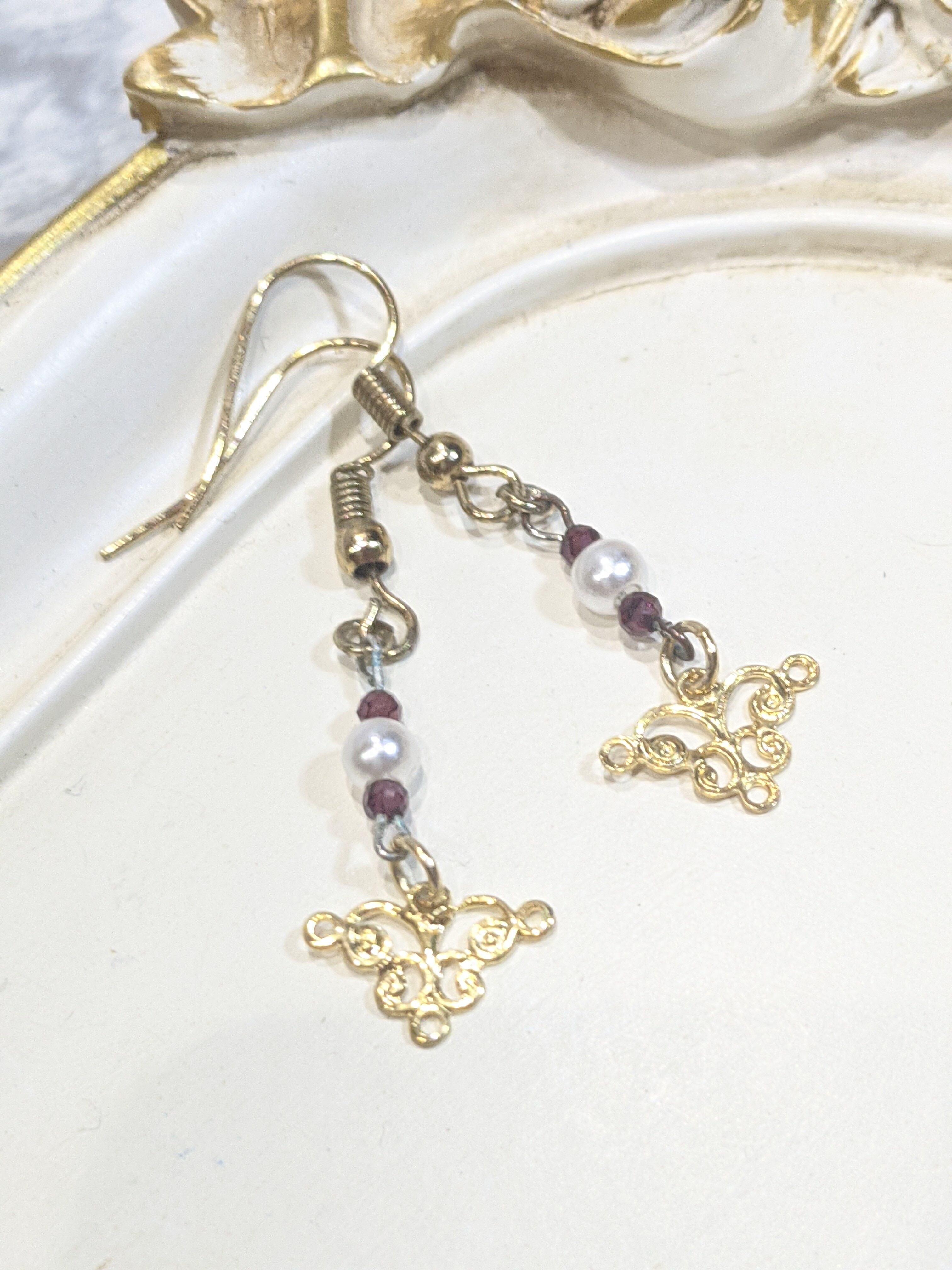 ゴールドのクラシカルなパーツにパールビーズと天然石 ガーネットを組み合わせ、華やかな仕上がりになりました。
