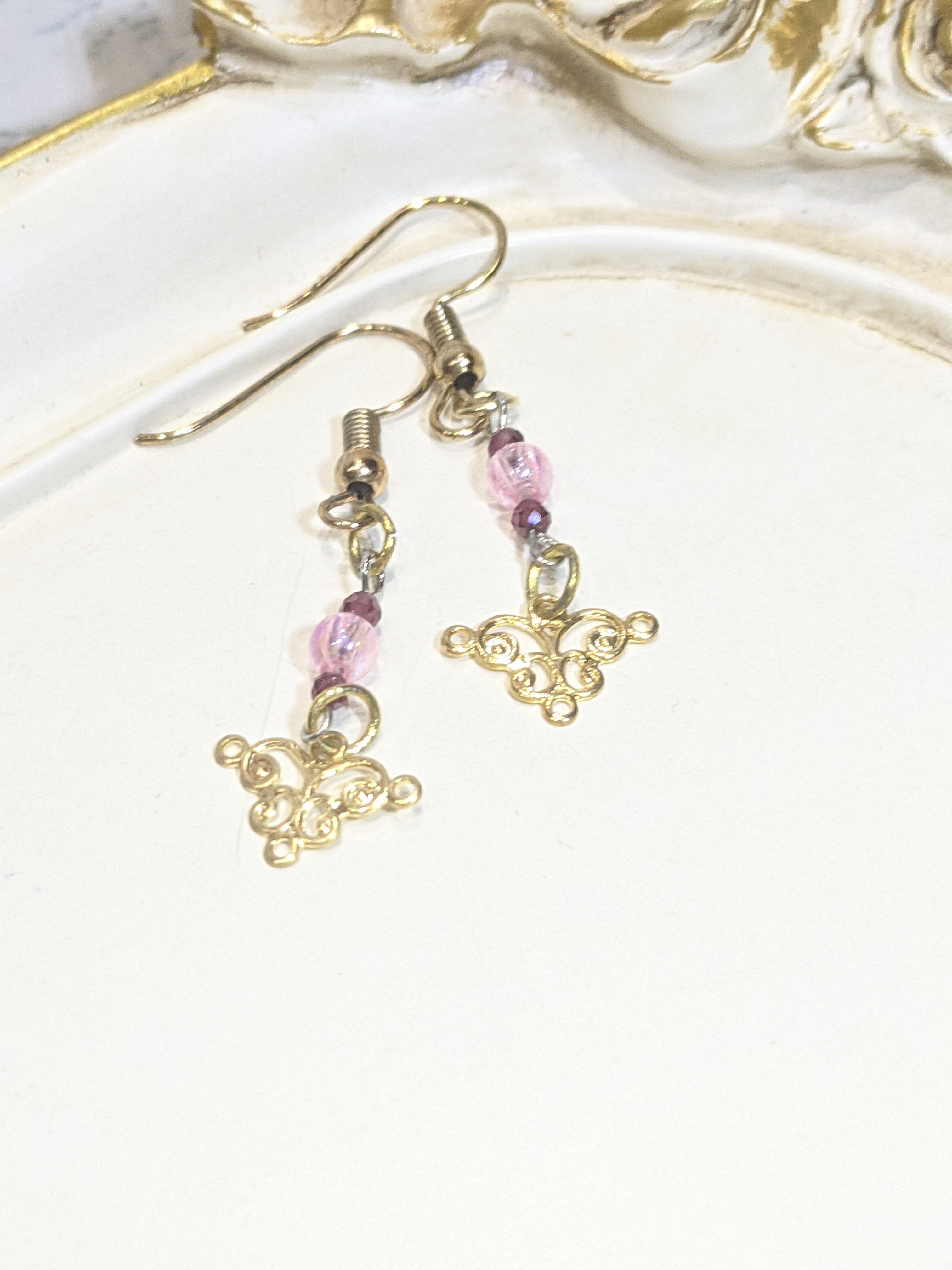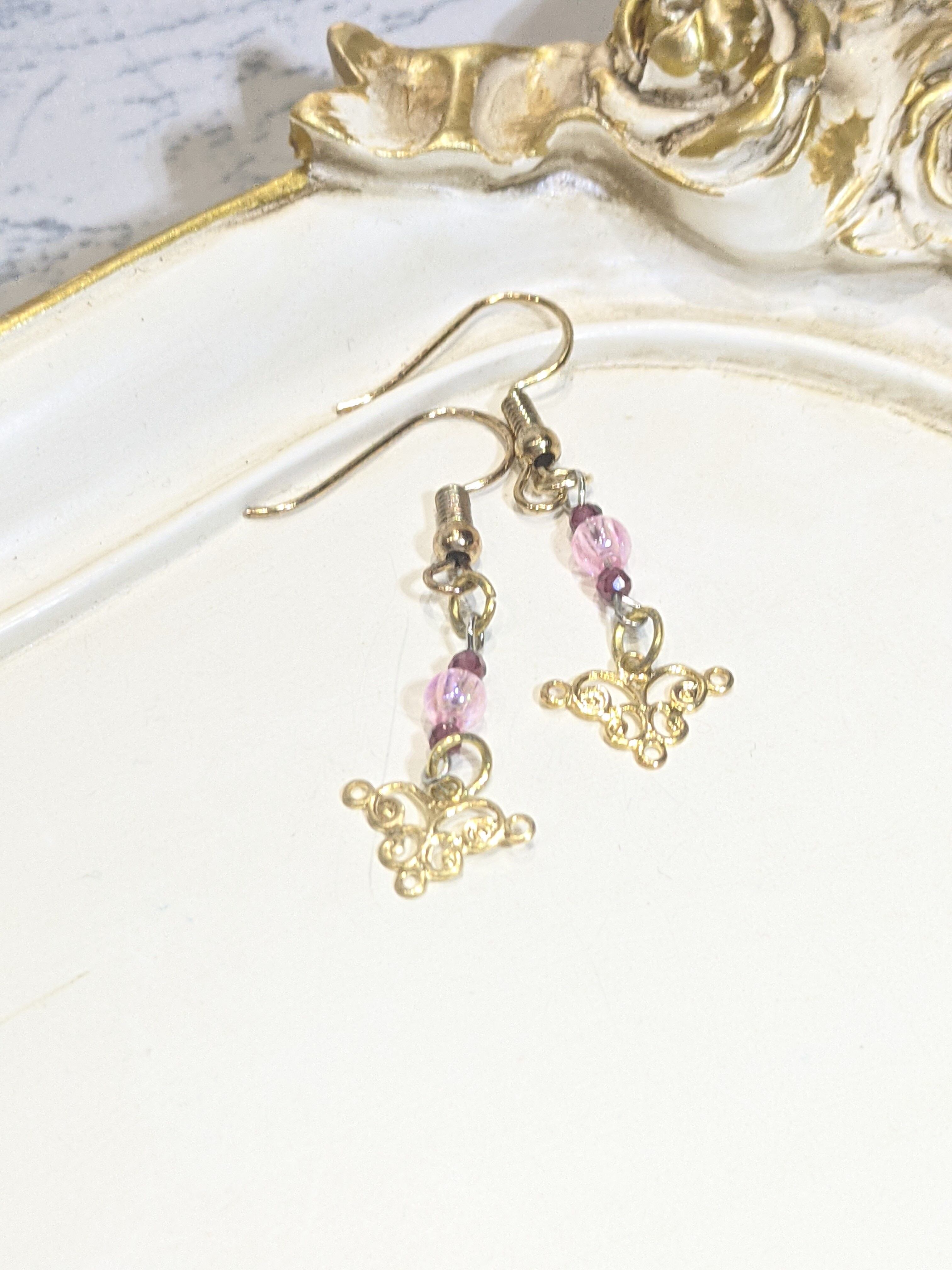 ゴールドのクラシカルなパーツにピンクのクリアビーズと天然石 ガーネットを組み合わせ、華やかな仕上がりになりました。