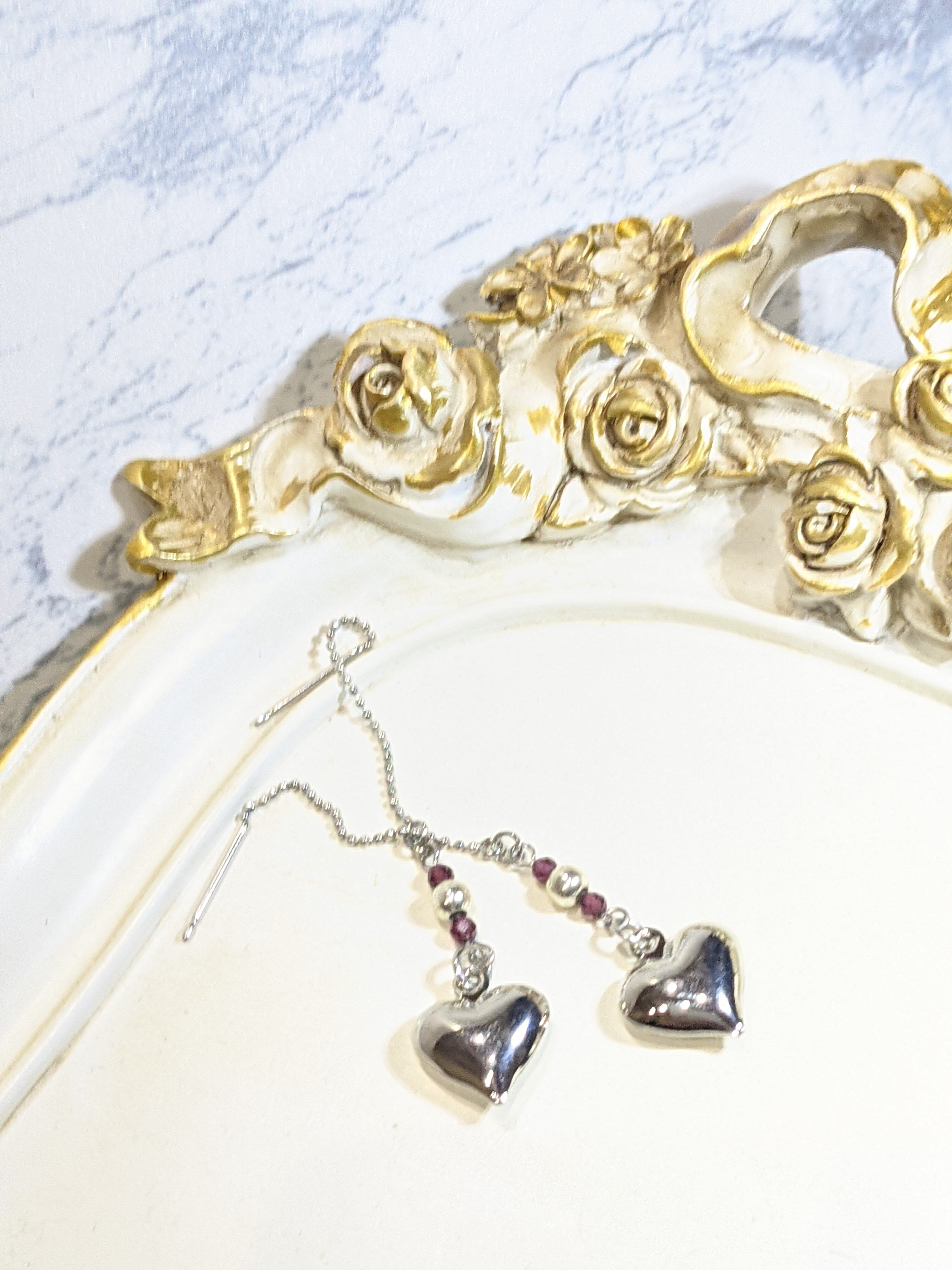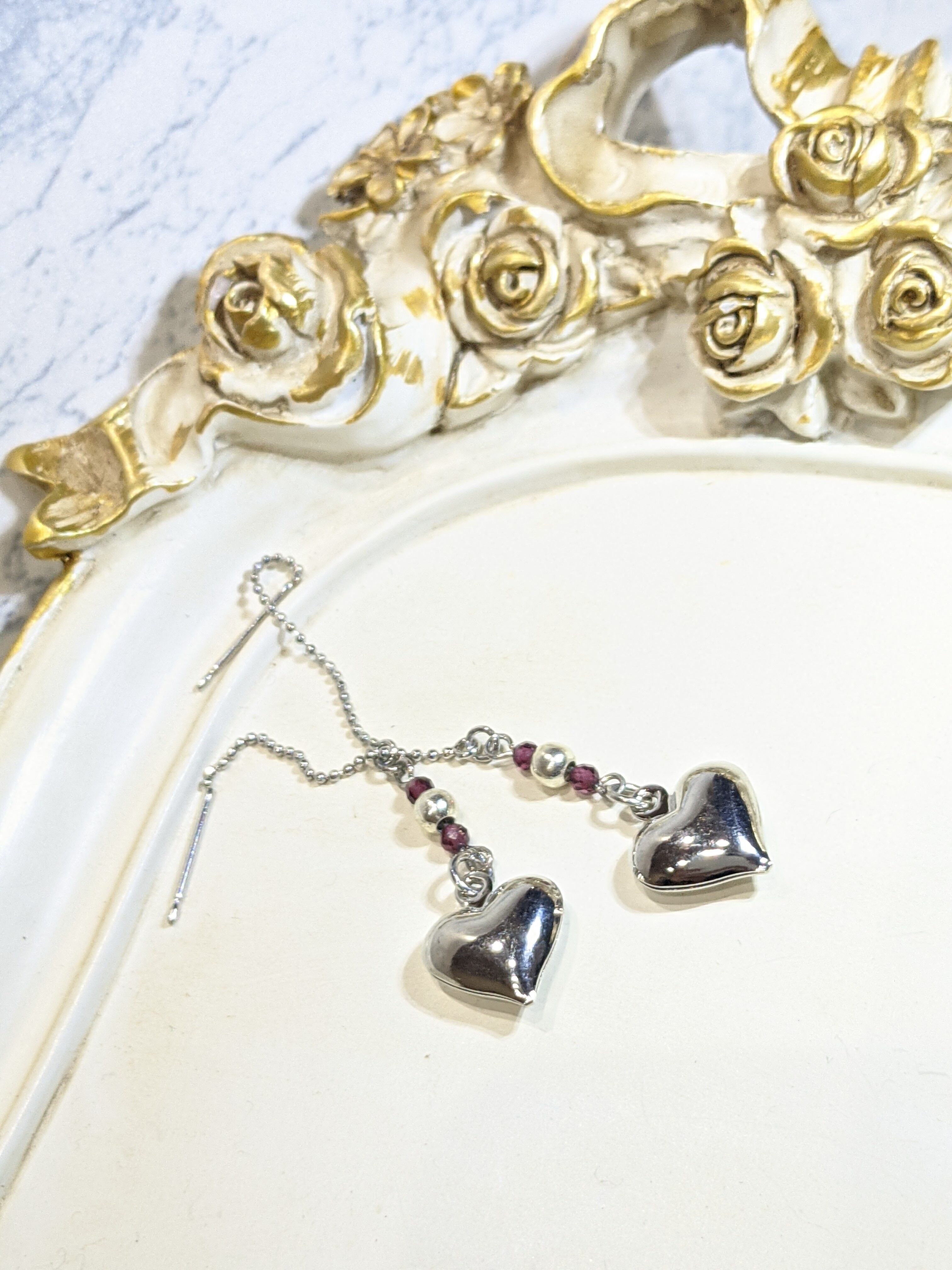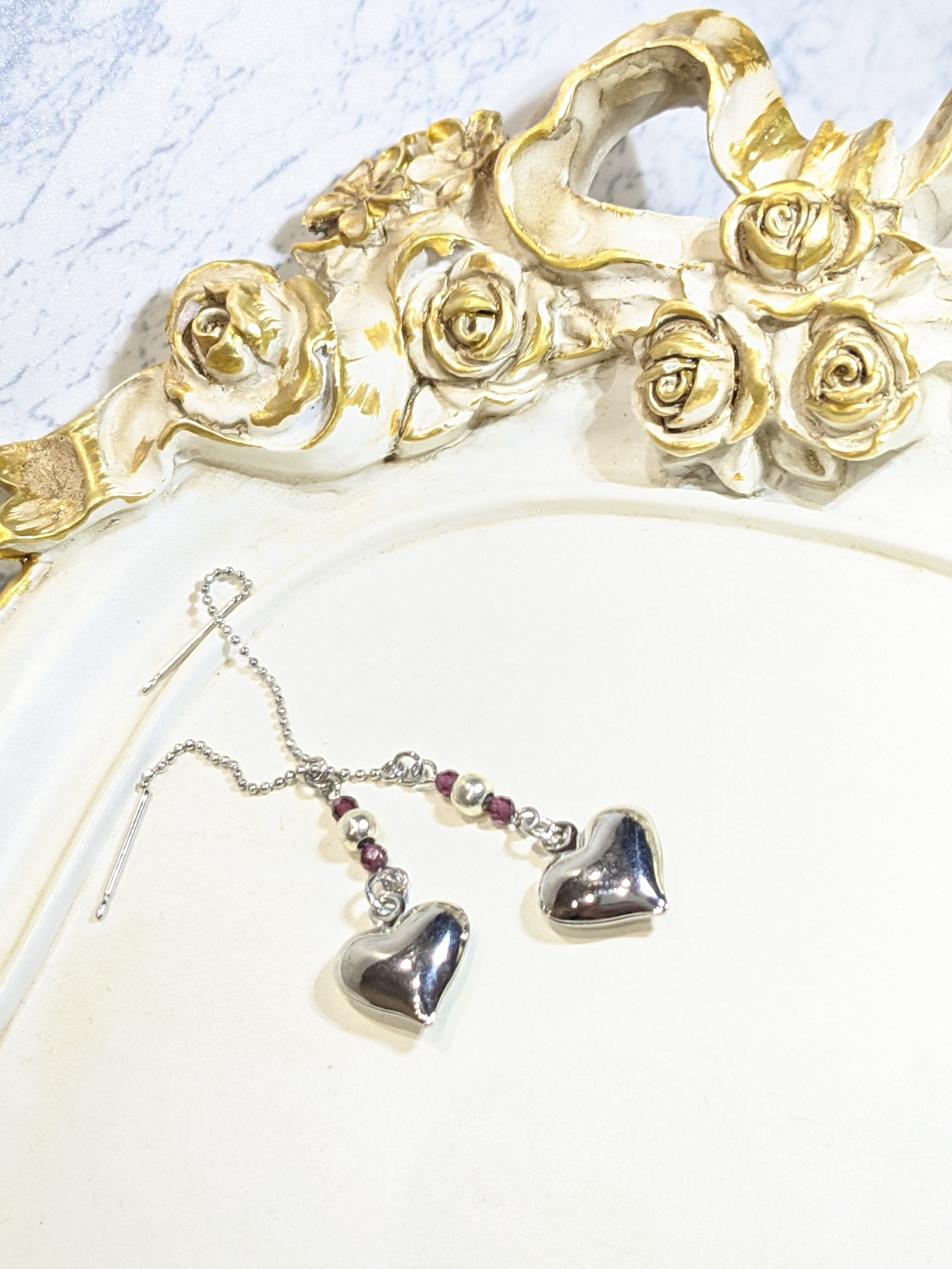 可愛らしいシルバーのハートのパーツに天然石のガーネットとシルバーメタルビーズを組み合わせました。