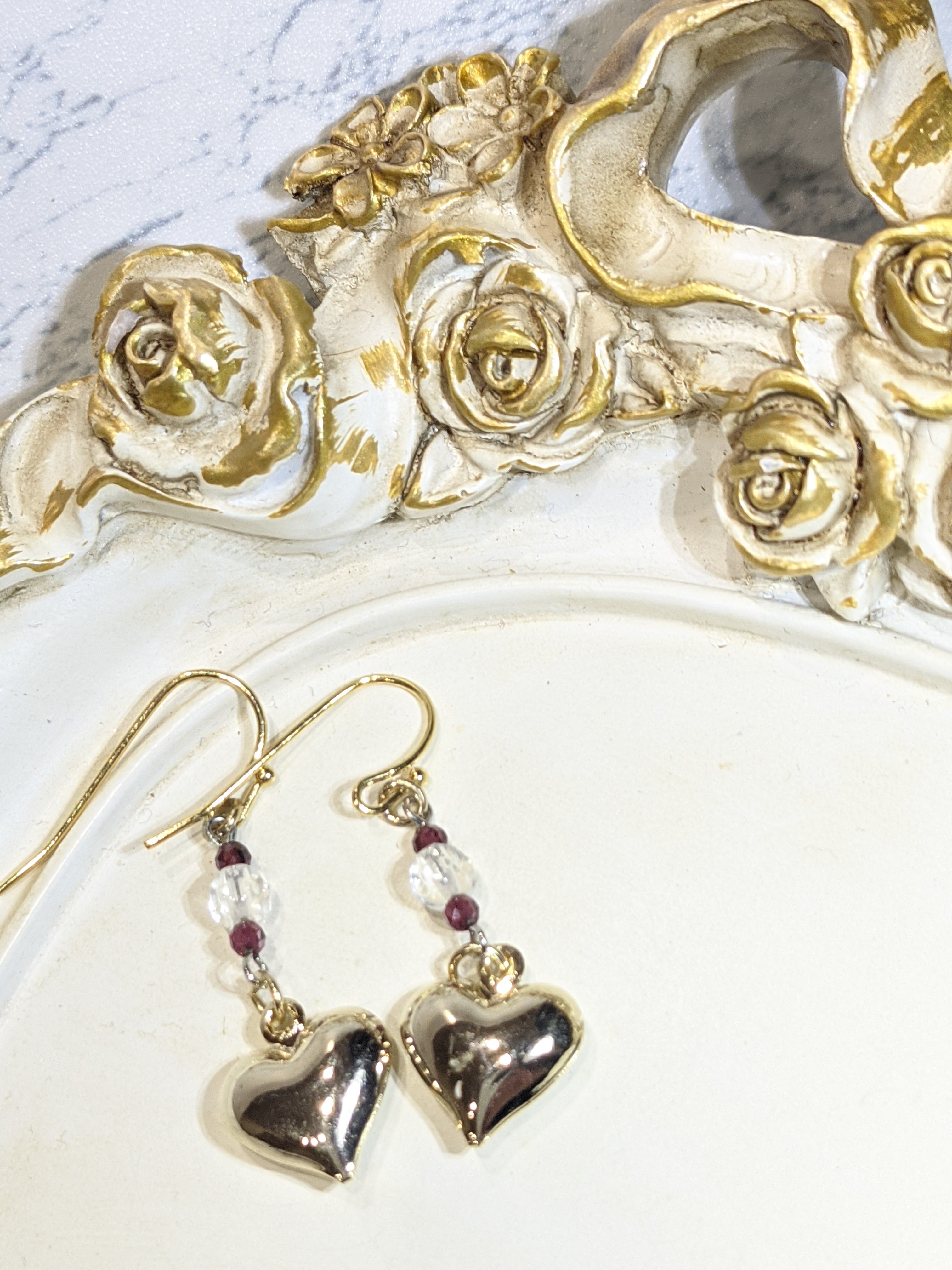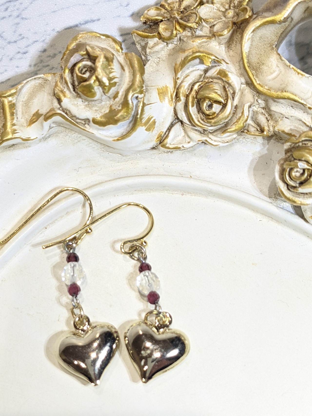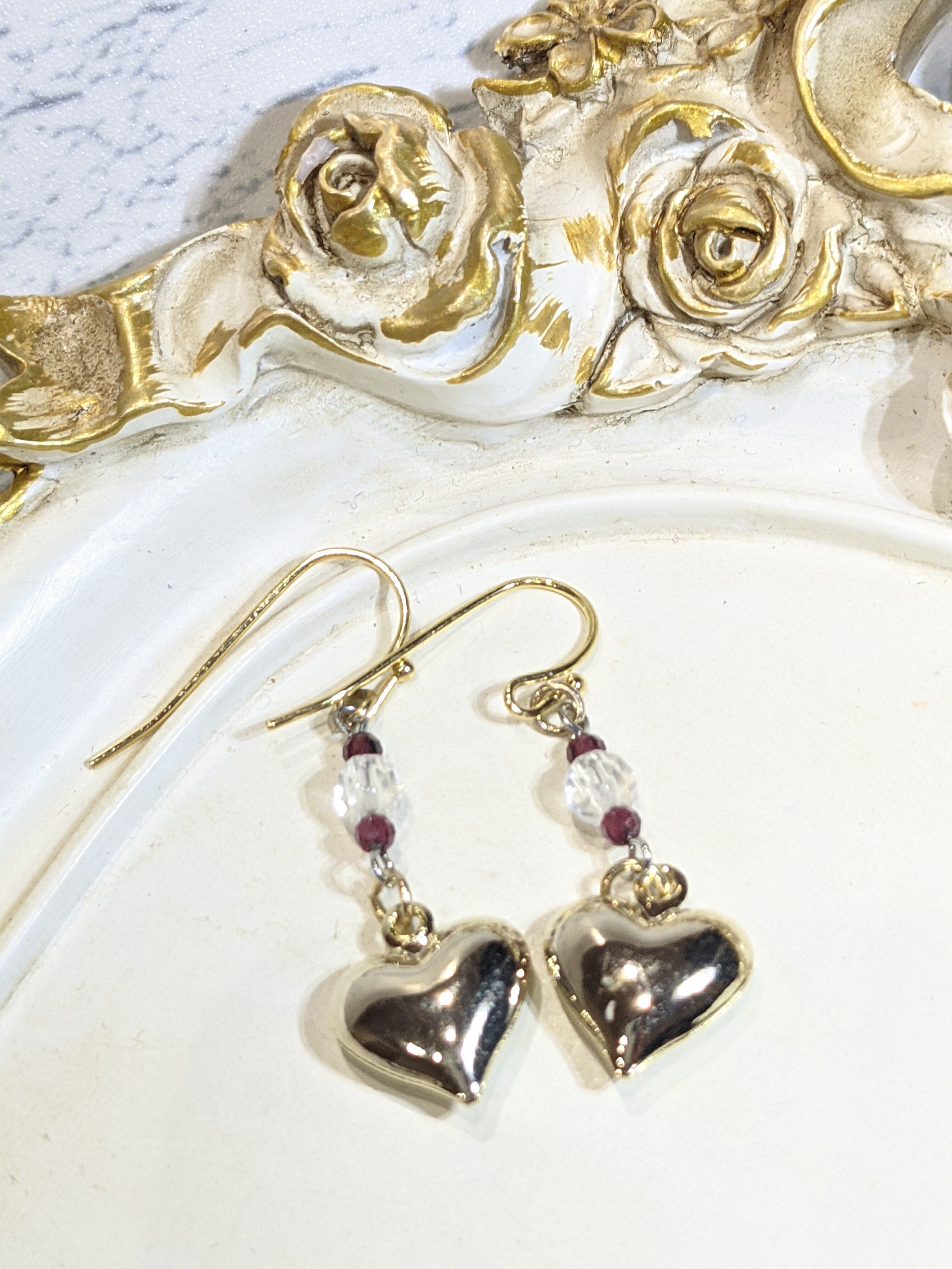 可愛らしいゴールドのハートのパーツに天然石のガーネットとクリスタルクオーツを組み合わせました。