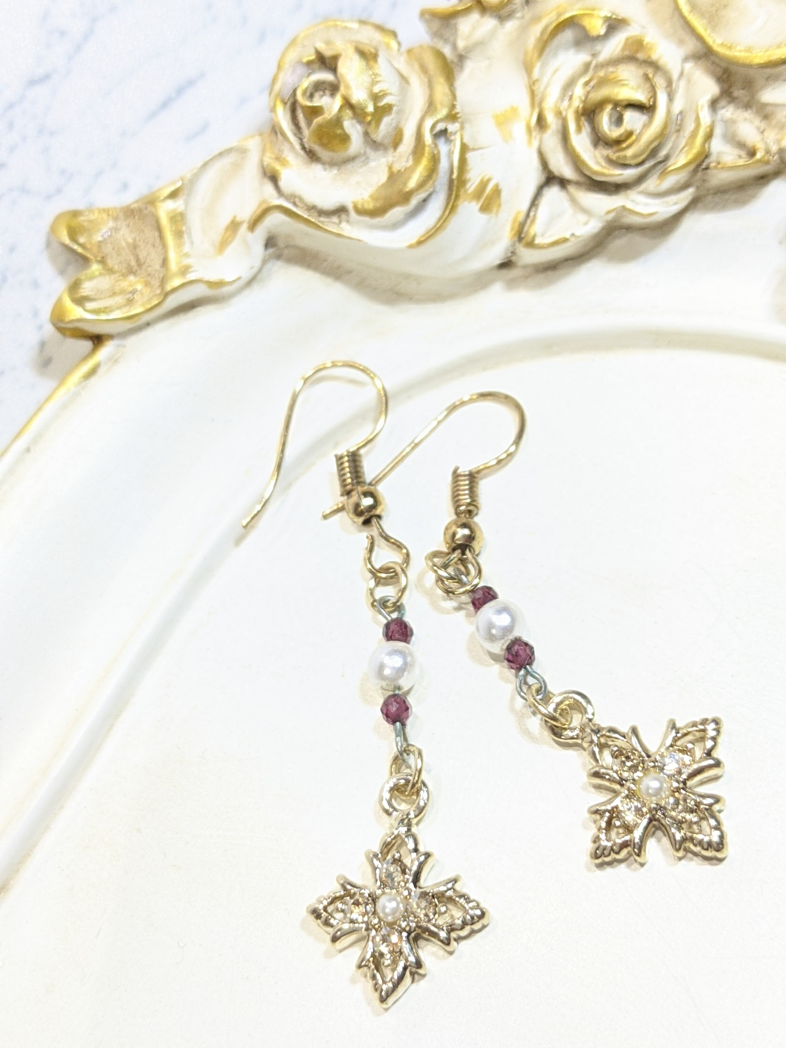 ゴールドのクロスパーツにガーネットとパールビーズを組み合わせました。