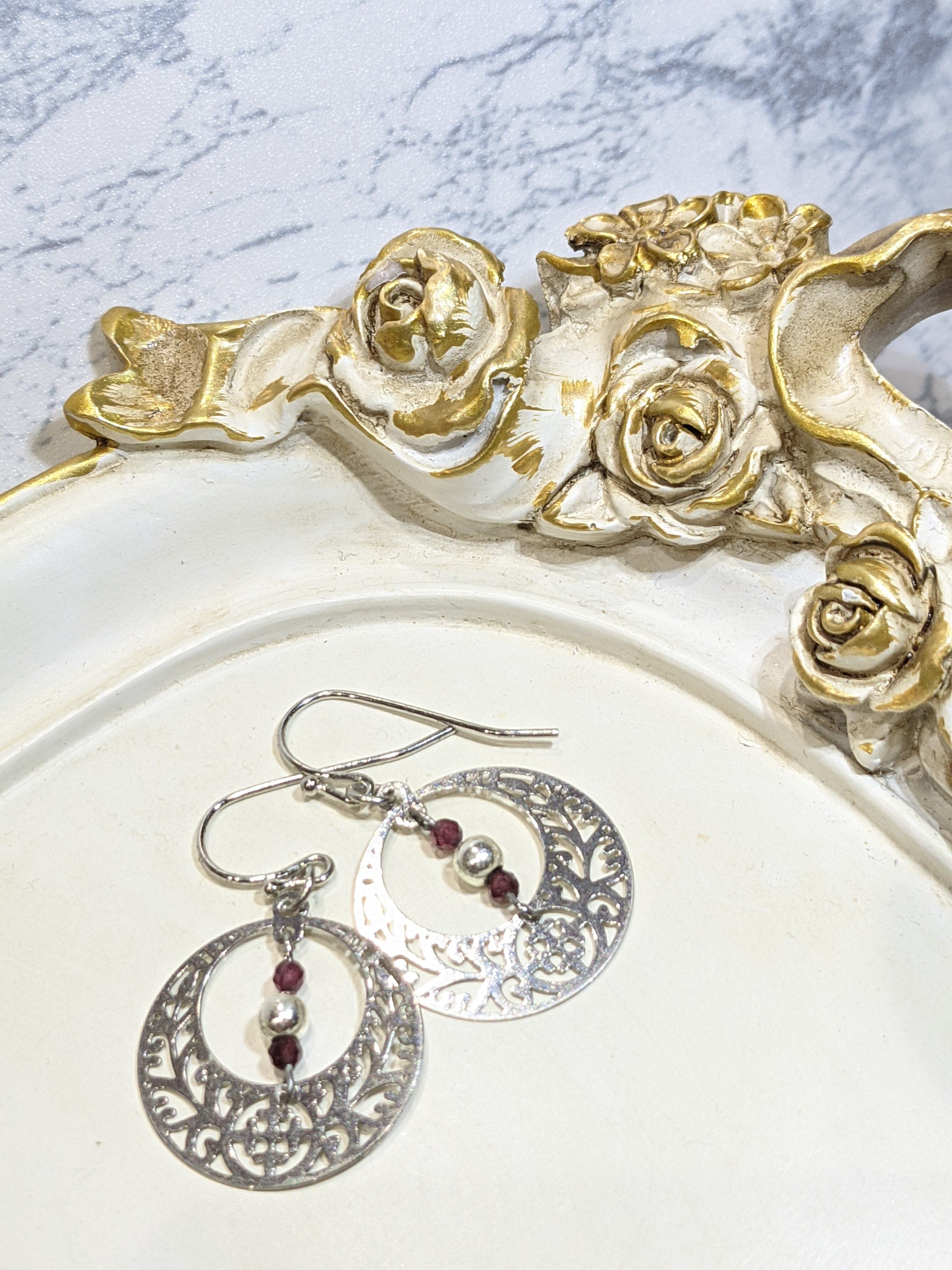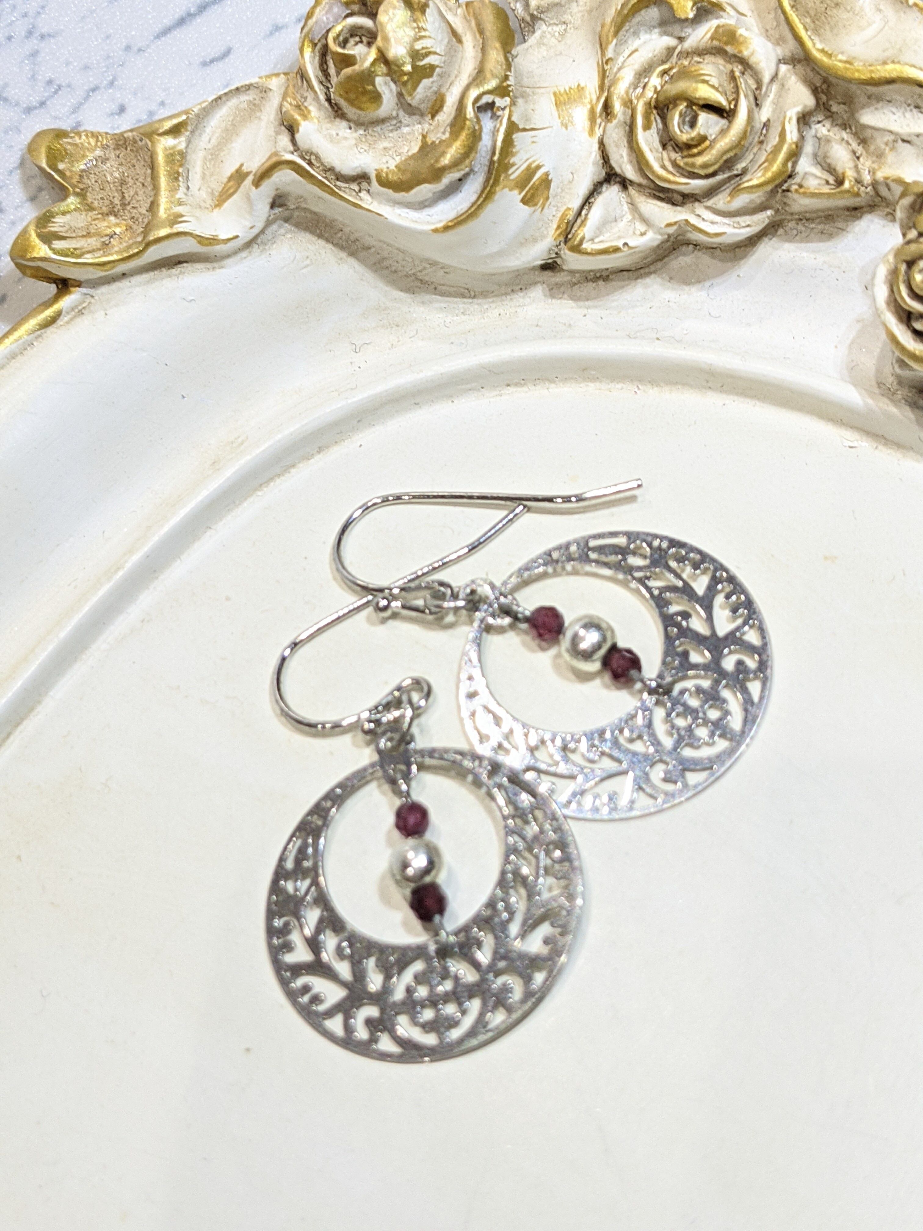 シルバーのクラシカルパーツにメタルビーズと天然石のガーネットを組み合わせました。