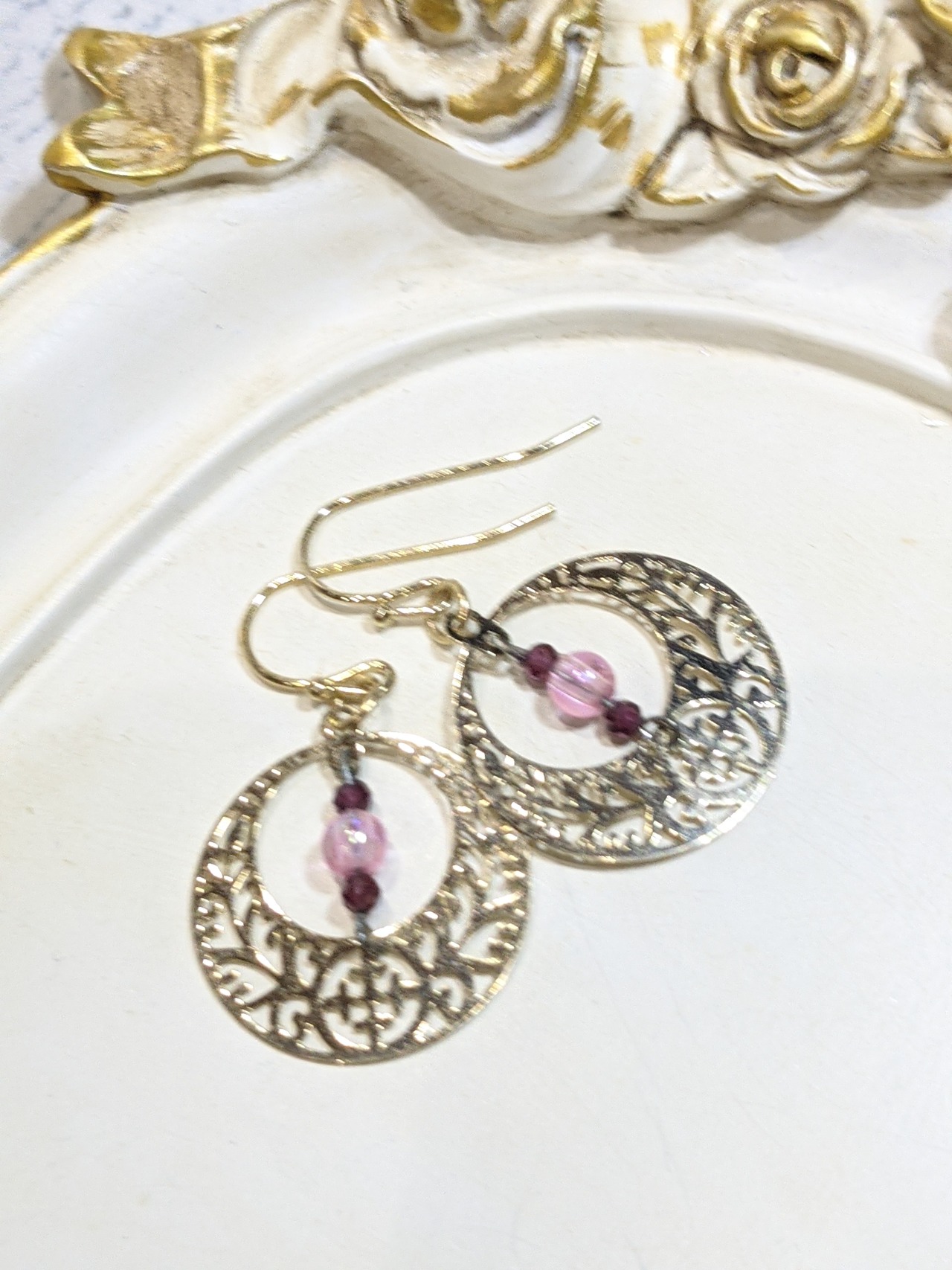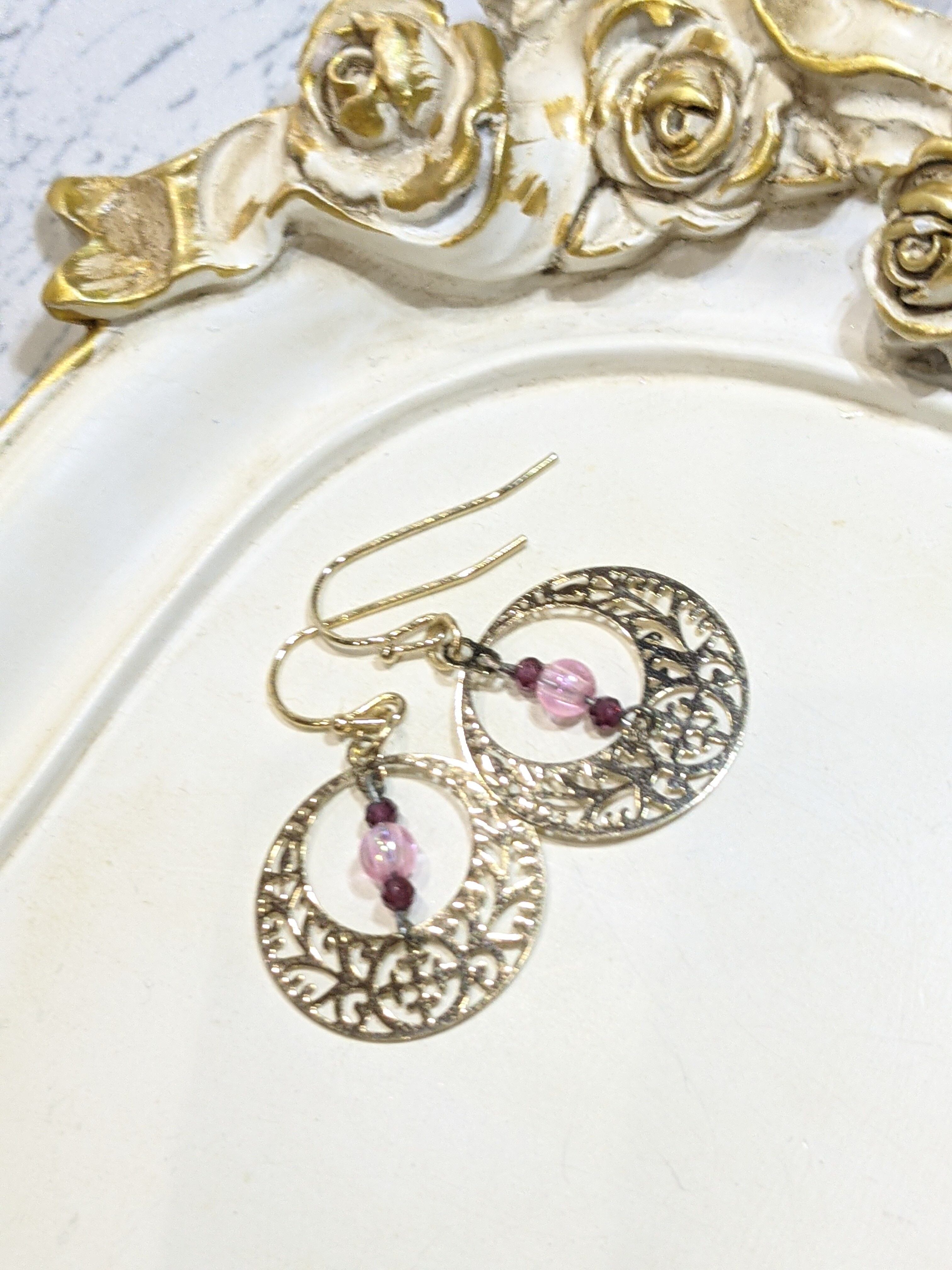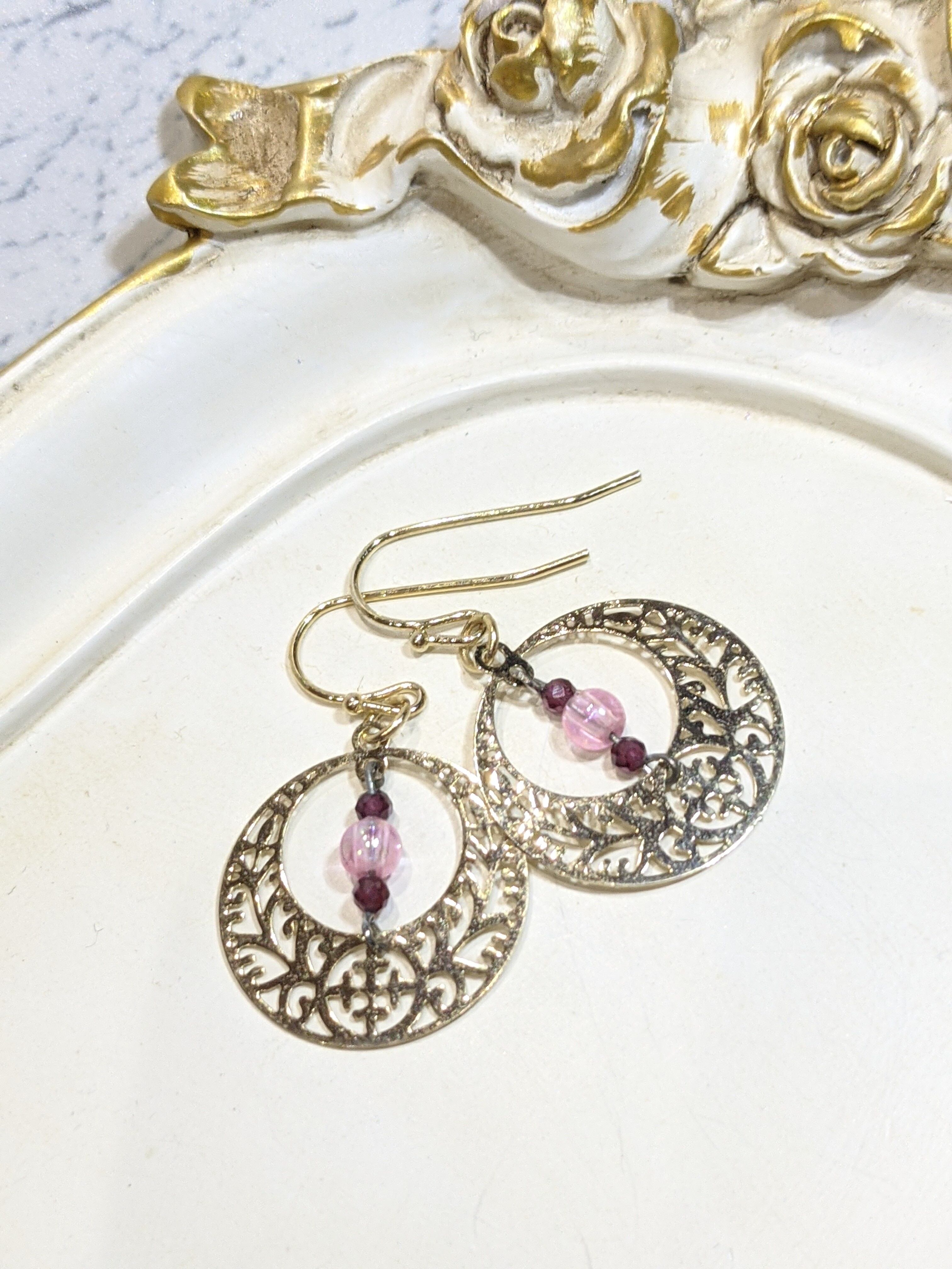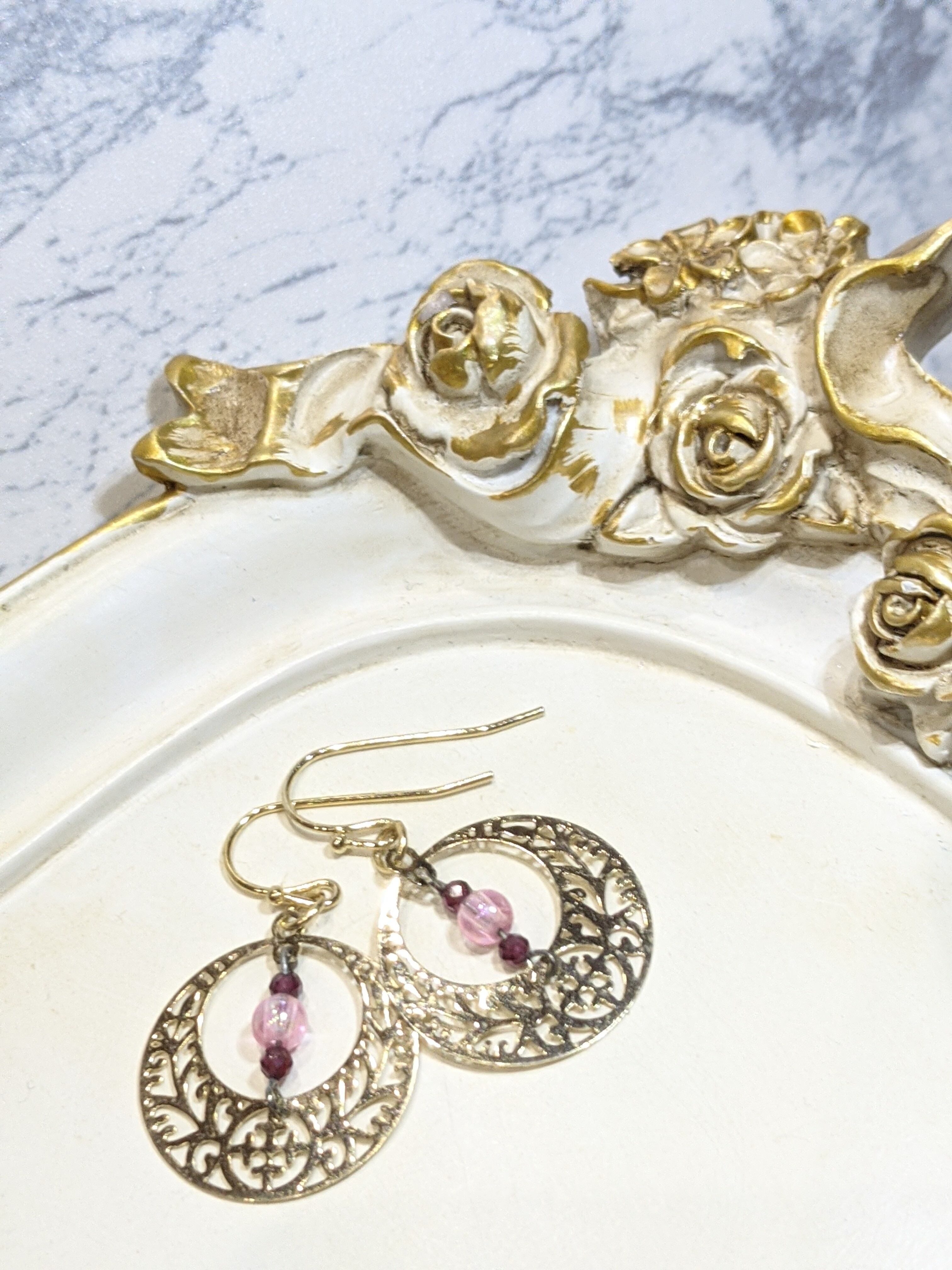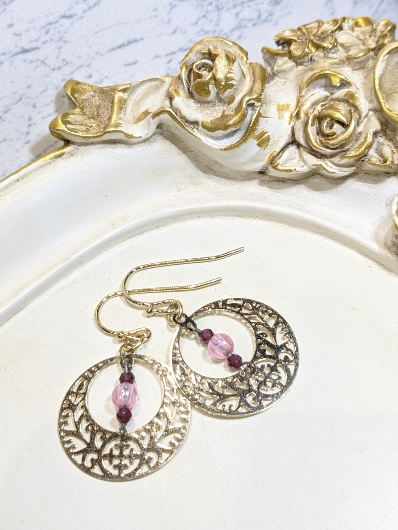 ゴールドのクラシカルなパーツに天然石のガーネットとチェリークォーツを組み合わせました。