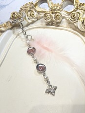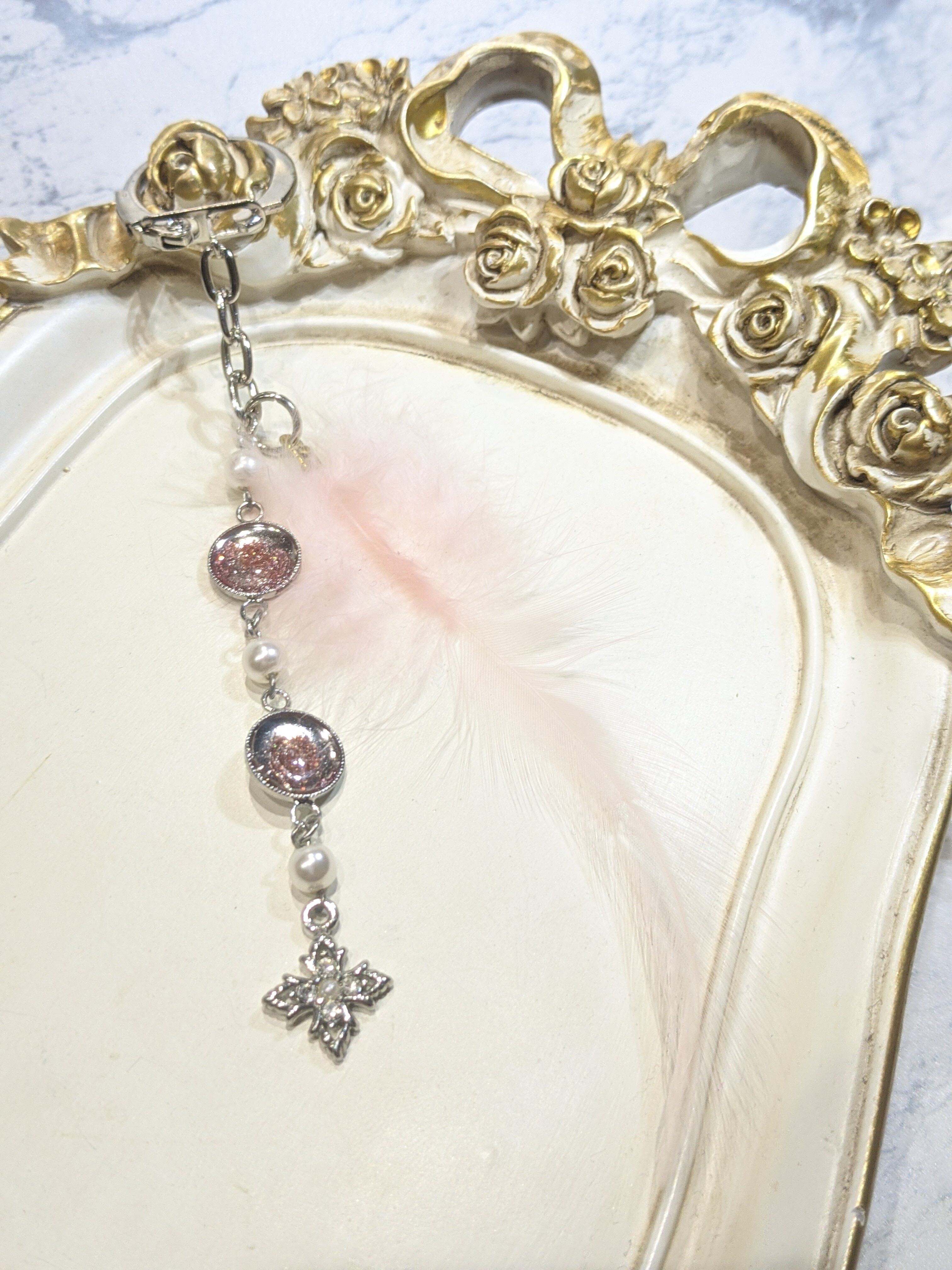 天使の羽根のような可愛らしい羽根とシルバーのクロスパーツ パールビーズとキラキララメ入りパーツを組み合わせチャームにしました。