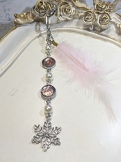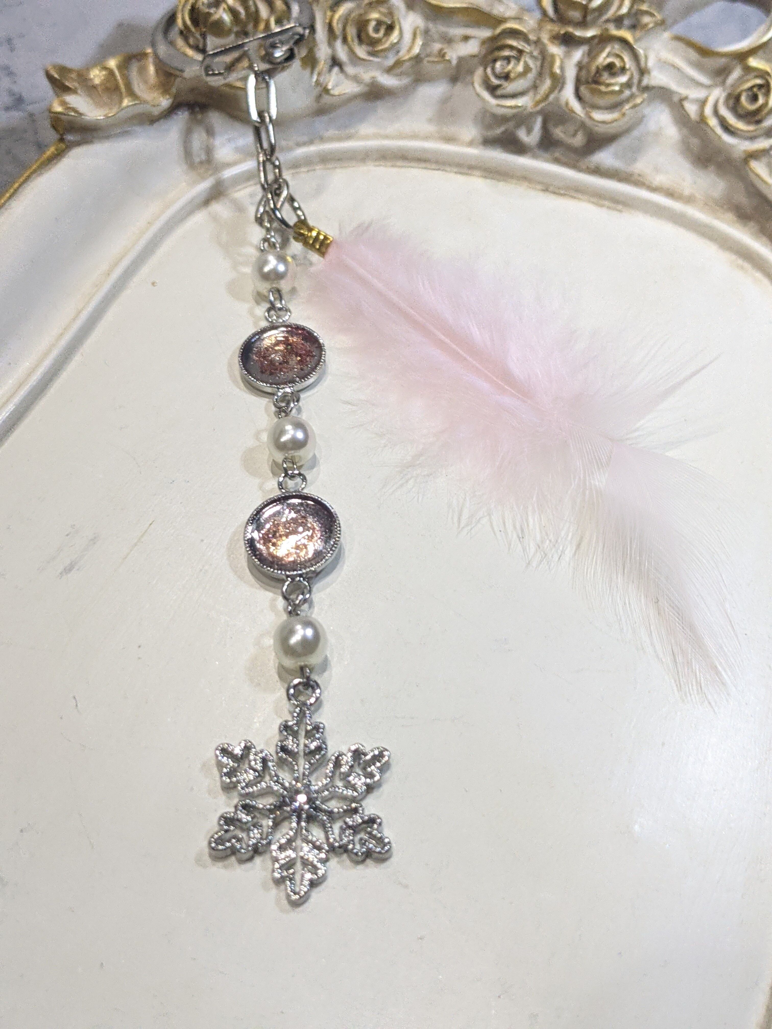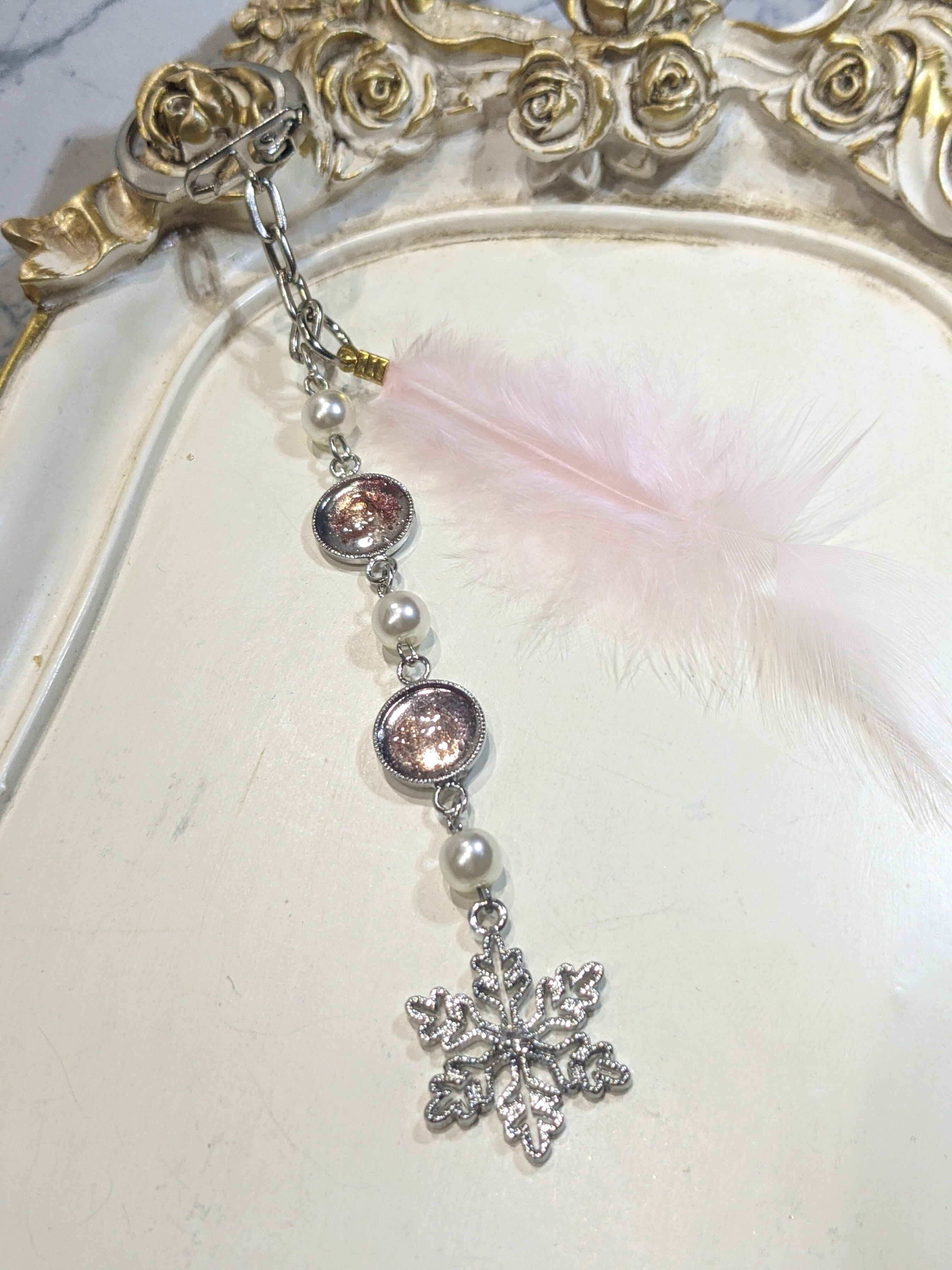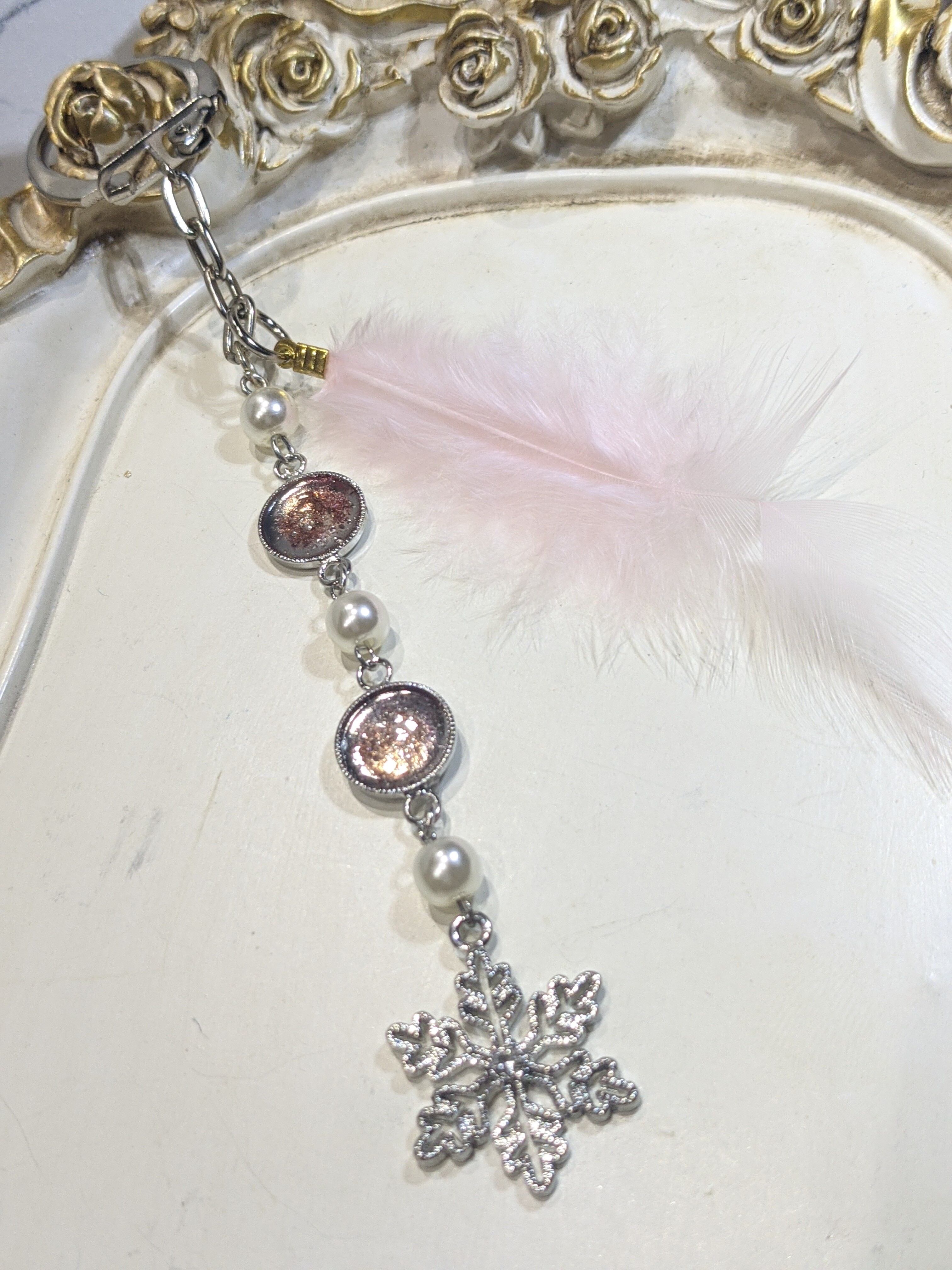 天使の羽根のような羽根とシルバーのスノーパーツ パールビーズとキラキララメ入りパーツを組み合わせチャームにしました。