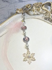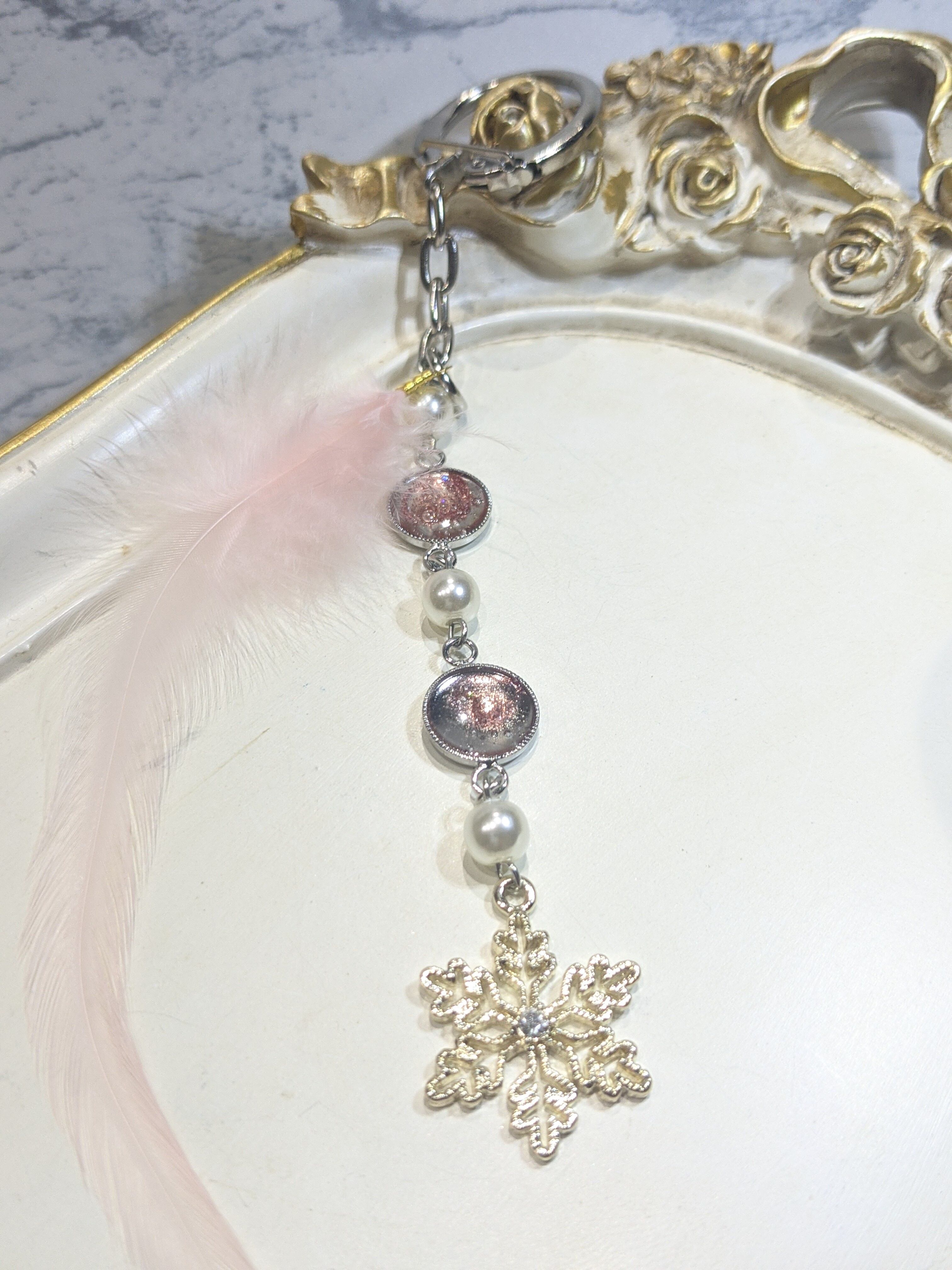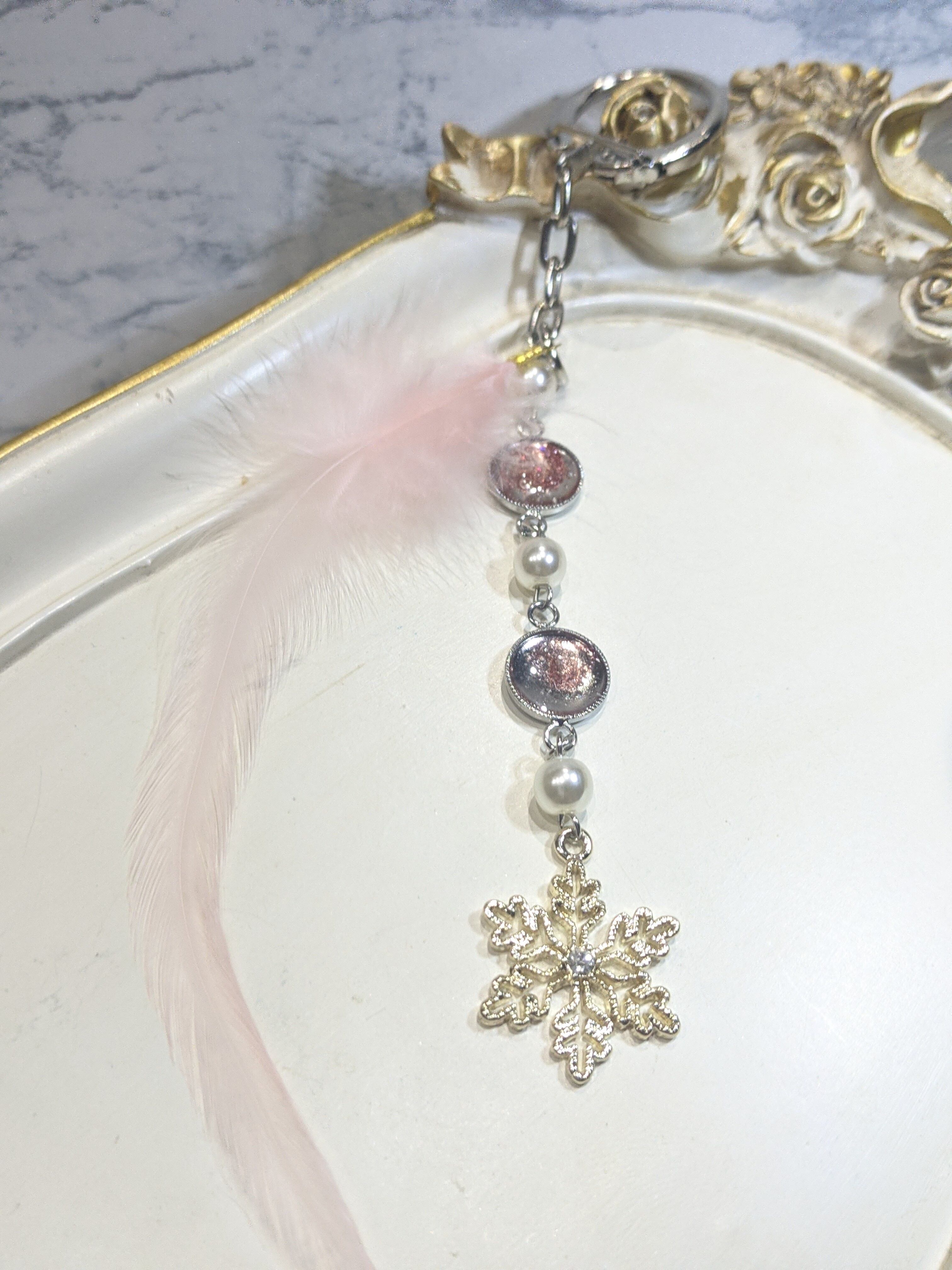 天使の羽根のような羽根とゴールドのスノーパーツ パールビーズとキラキララメ入りパーツを組み合わせチャームにしました。