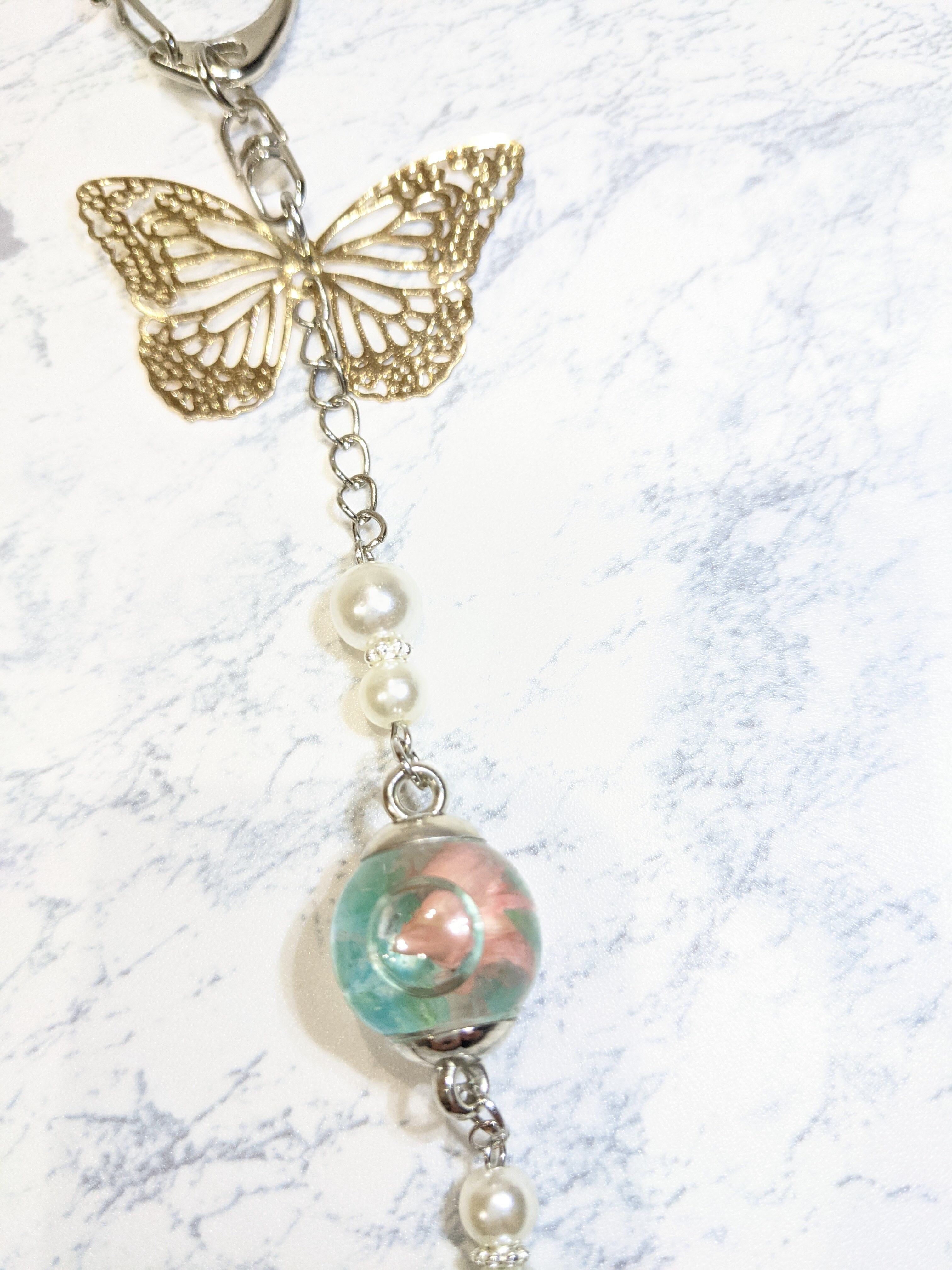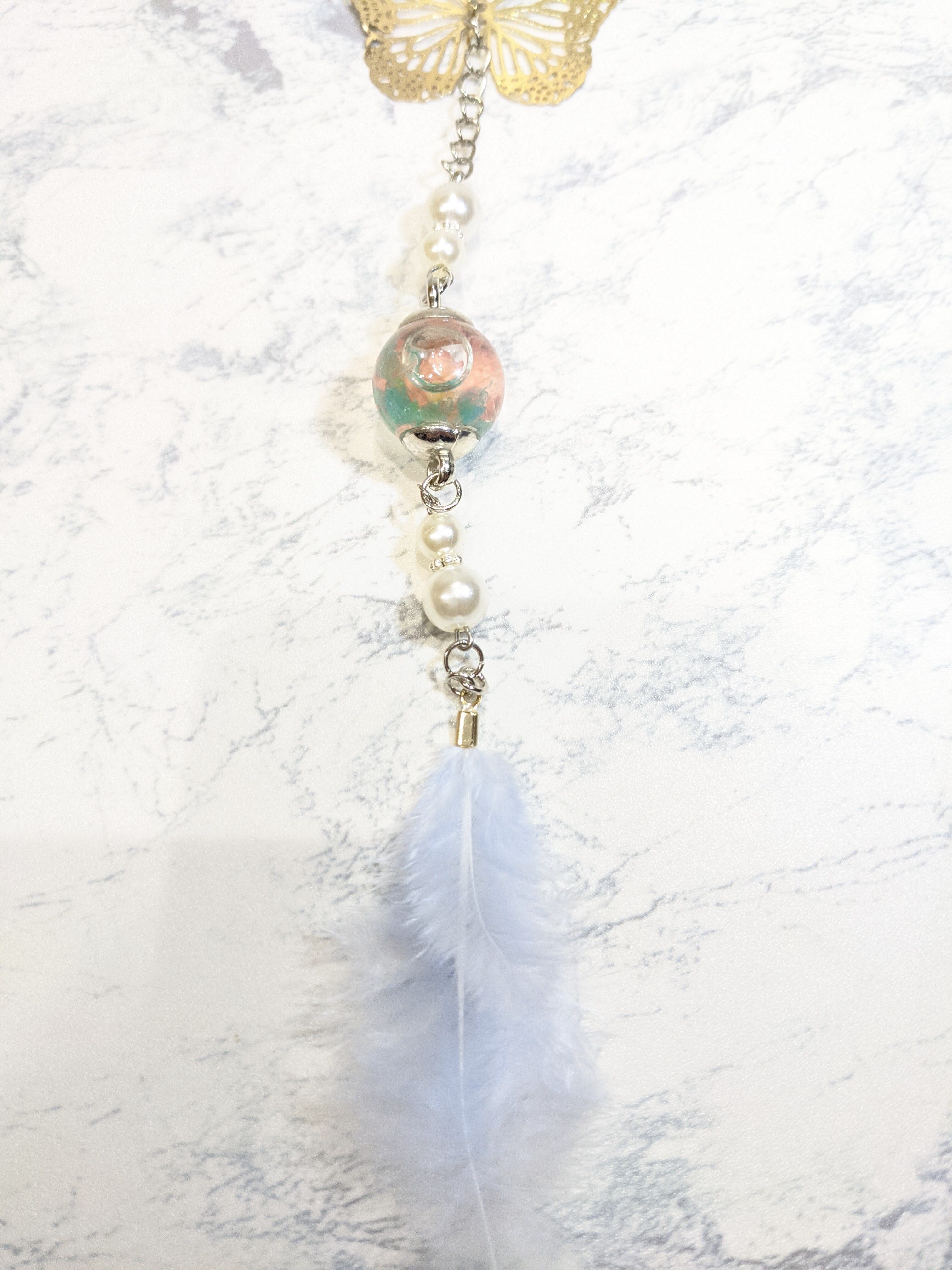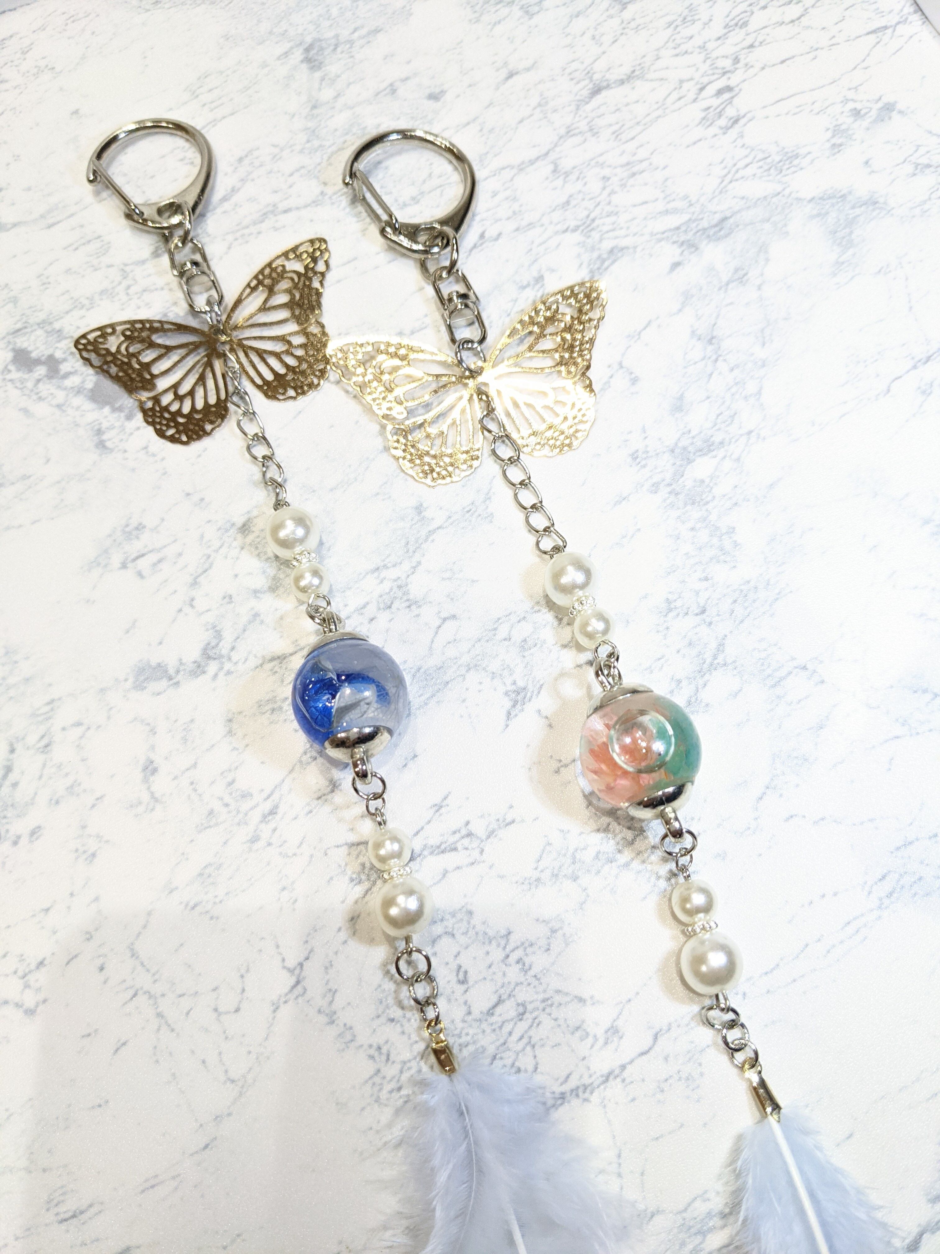 ドライフラワーを詰め込んだガラスドームと、バタフライチャーム 可愛らしいはねを組み合わせました。